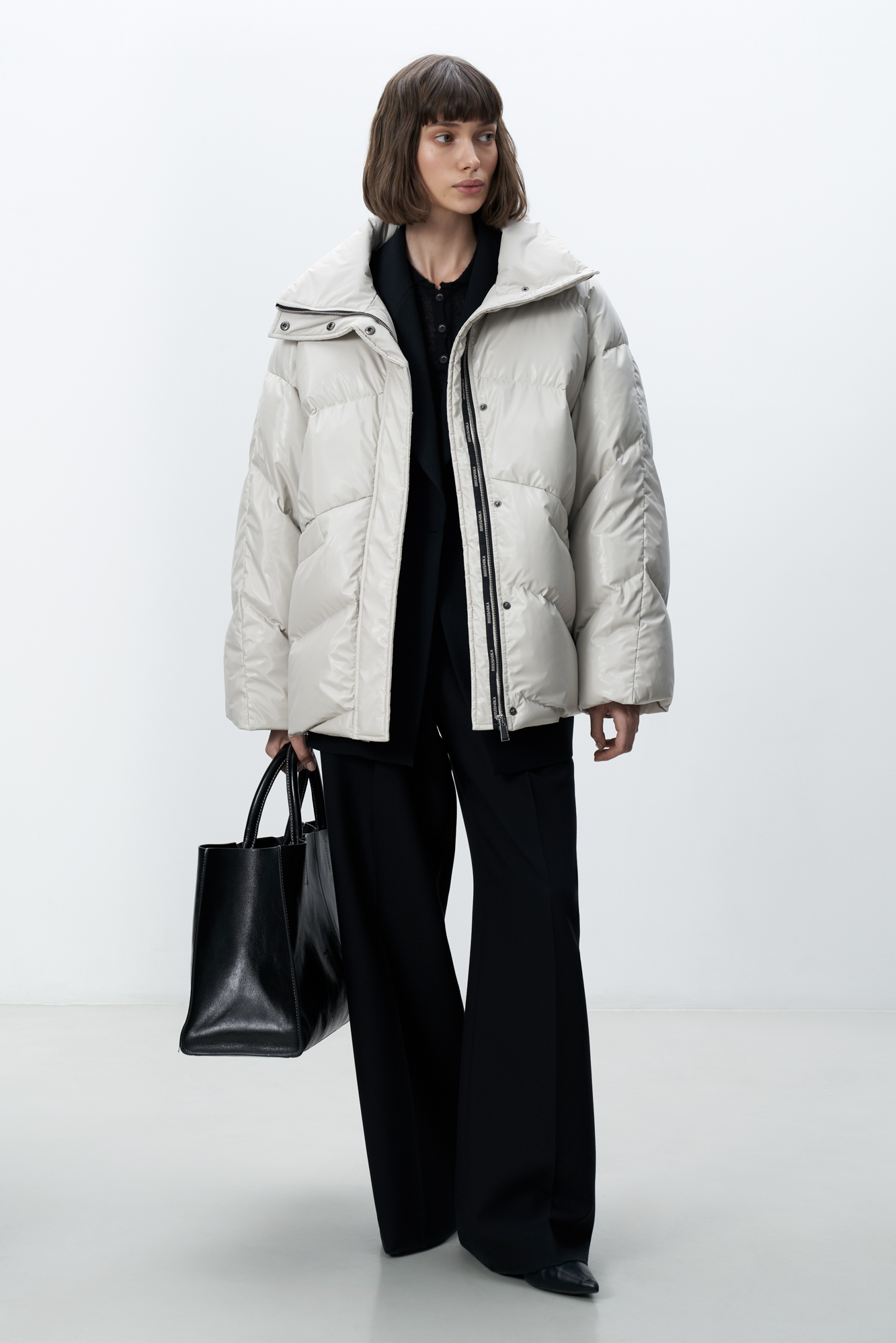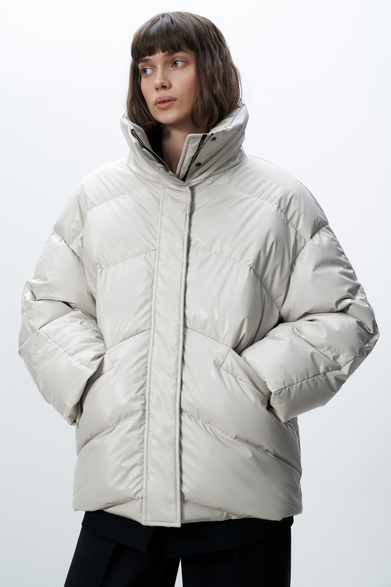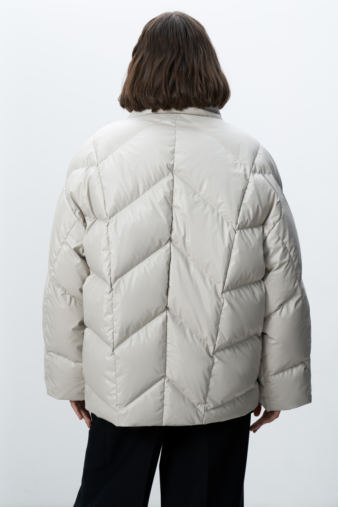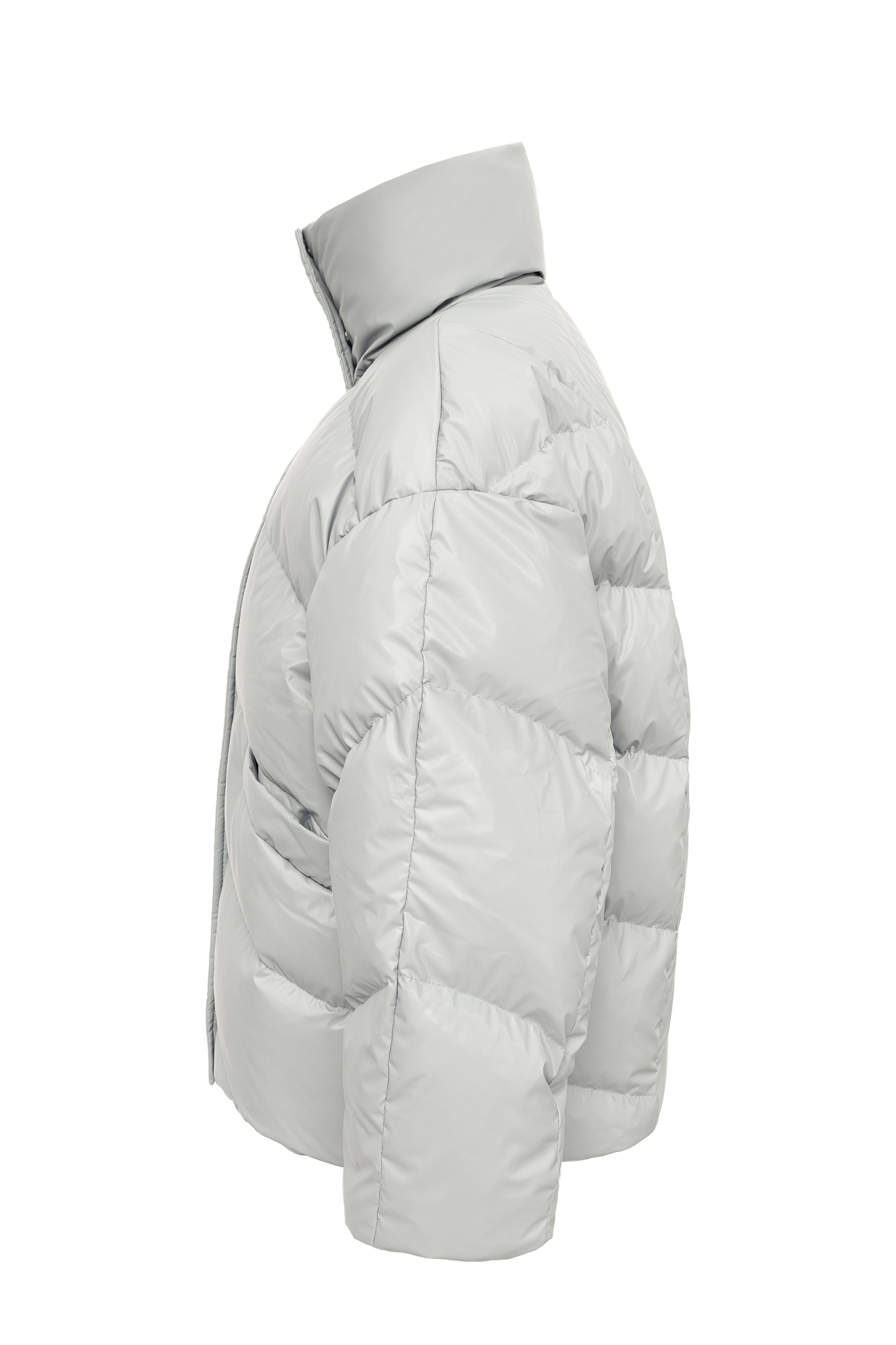 Объемный стеганый пуховик с воротником-стойкой. Модель с боковыми карманами и застежкой на молнию и кнопки.