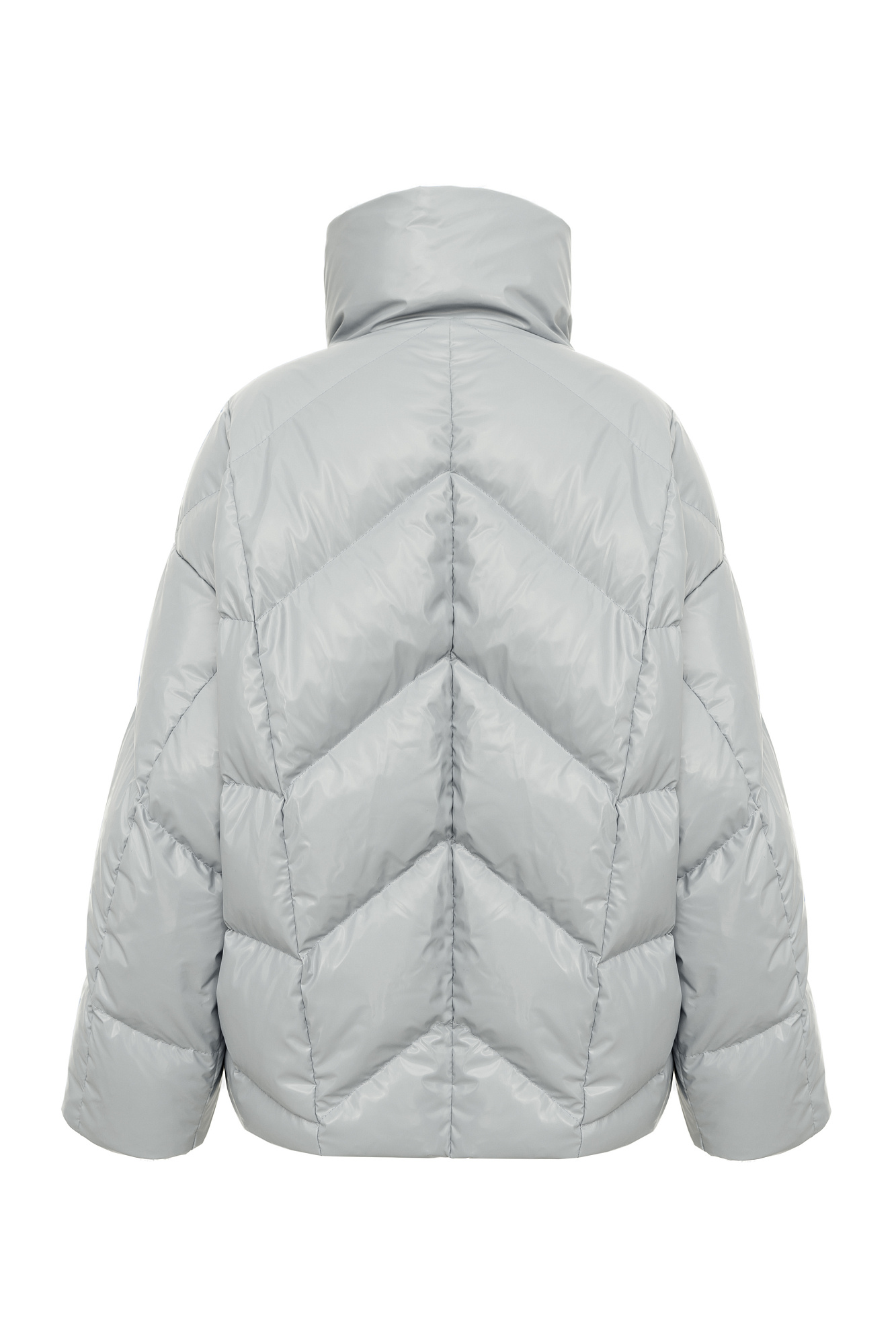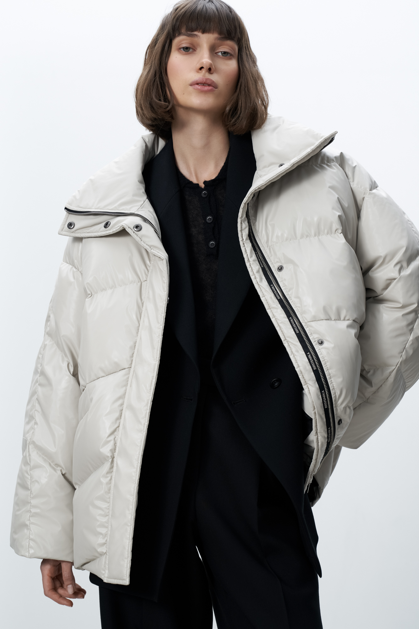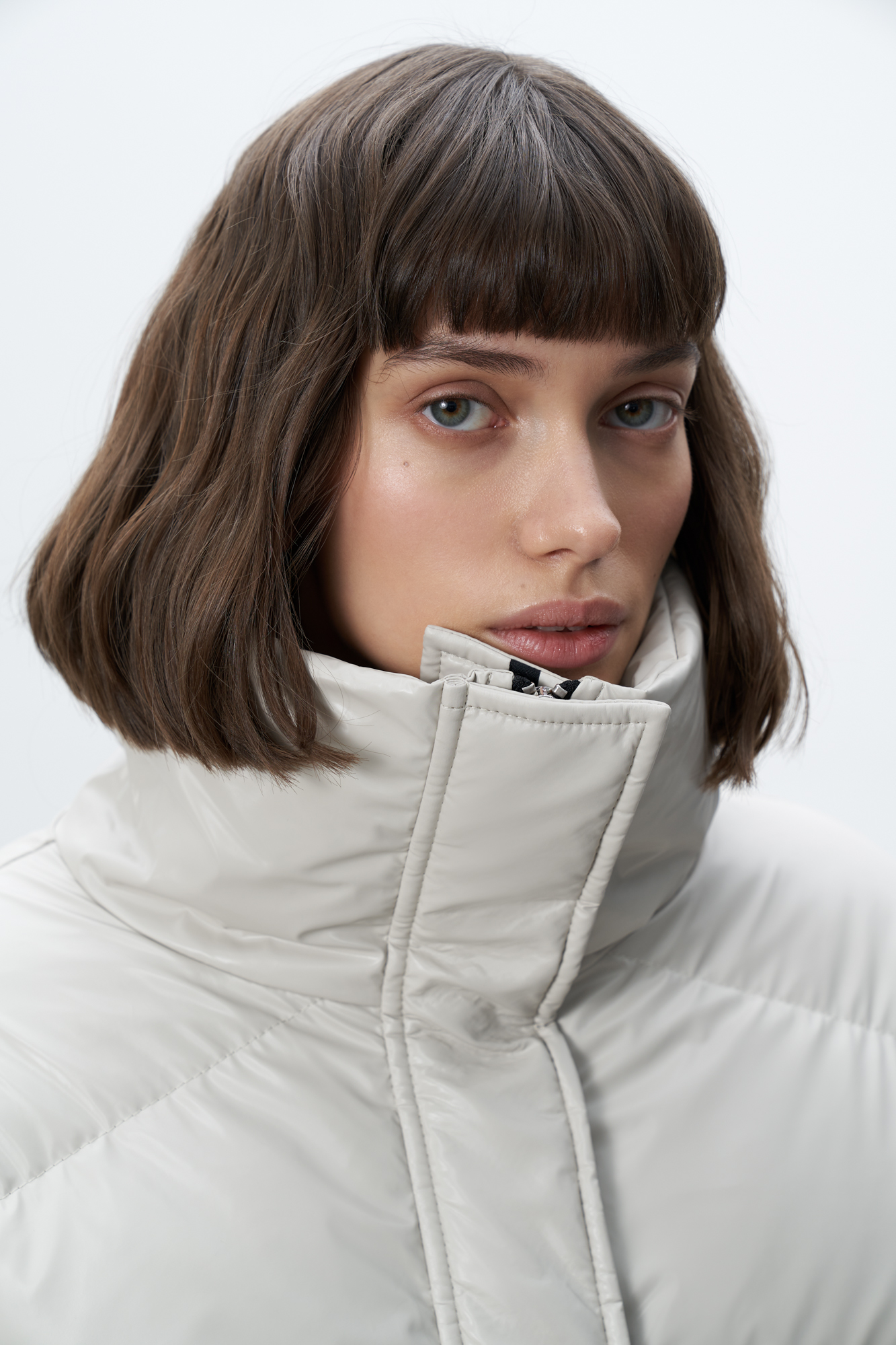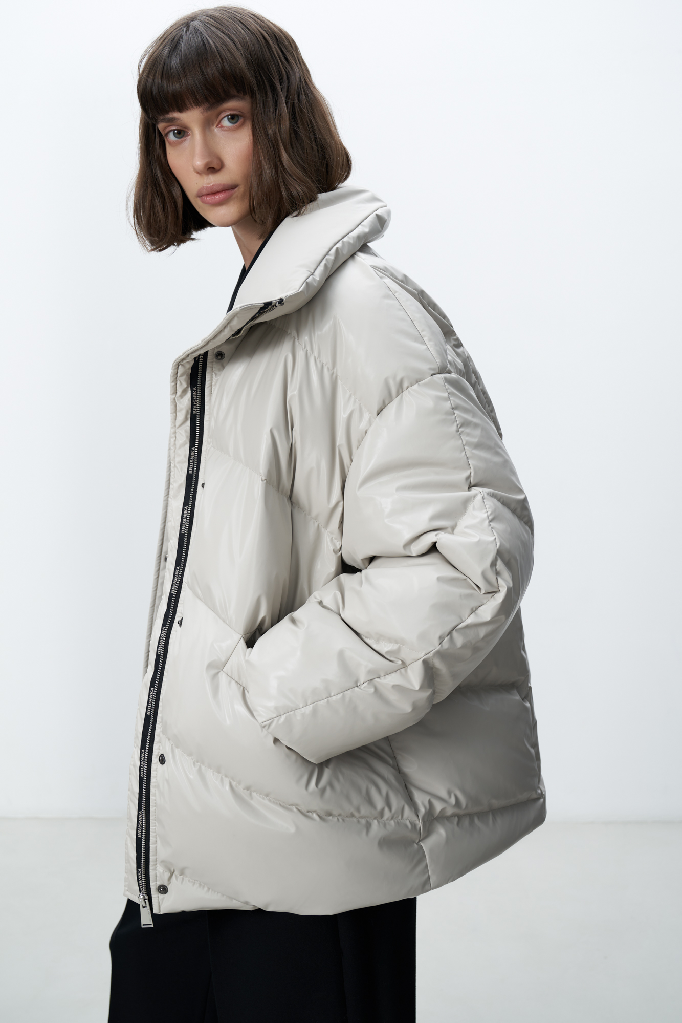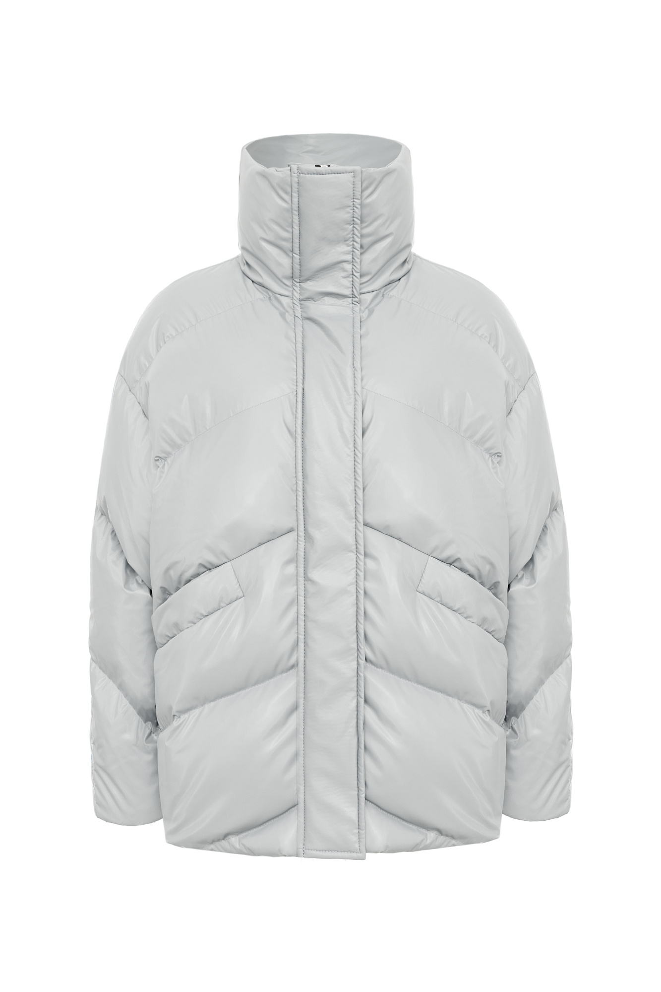 Объемный стеганый пуховик с воротником-стойкой. Модель с боковыми карманами и застежкой на молнию и кнопки.