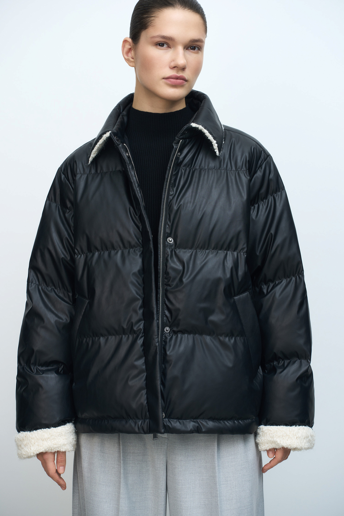 Утепленый пуховик из экокожи. Модель свободного силуэта с боковыми карманами и воротником-стойкой. Застежка на потайную молнию и кнопки. На подкладке.