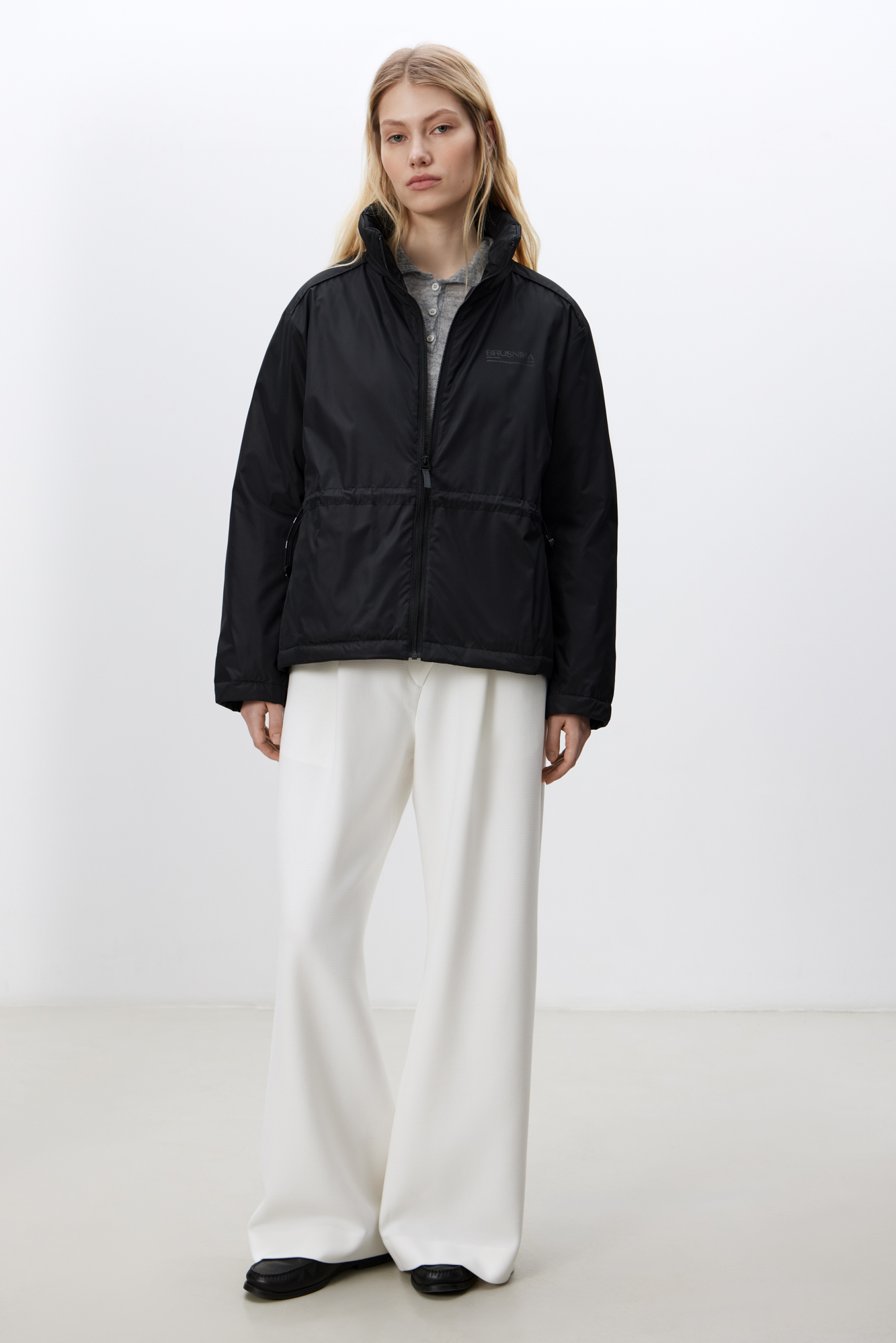 Пуховик с регулируемой кулиской. Модель свободного силуэта со спущенной линией плеча и боковыми карманами. Застежка на молнию.
