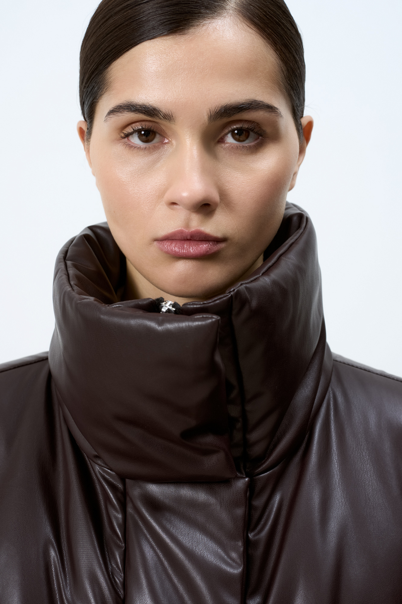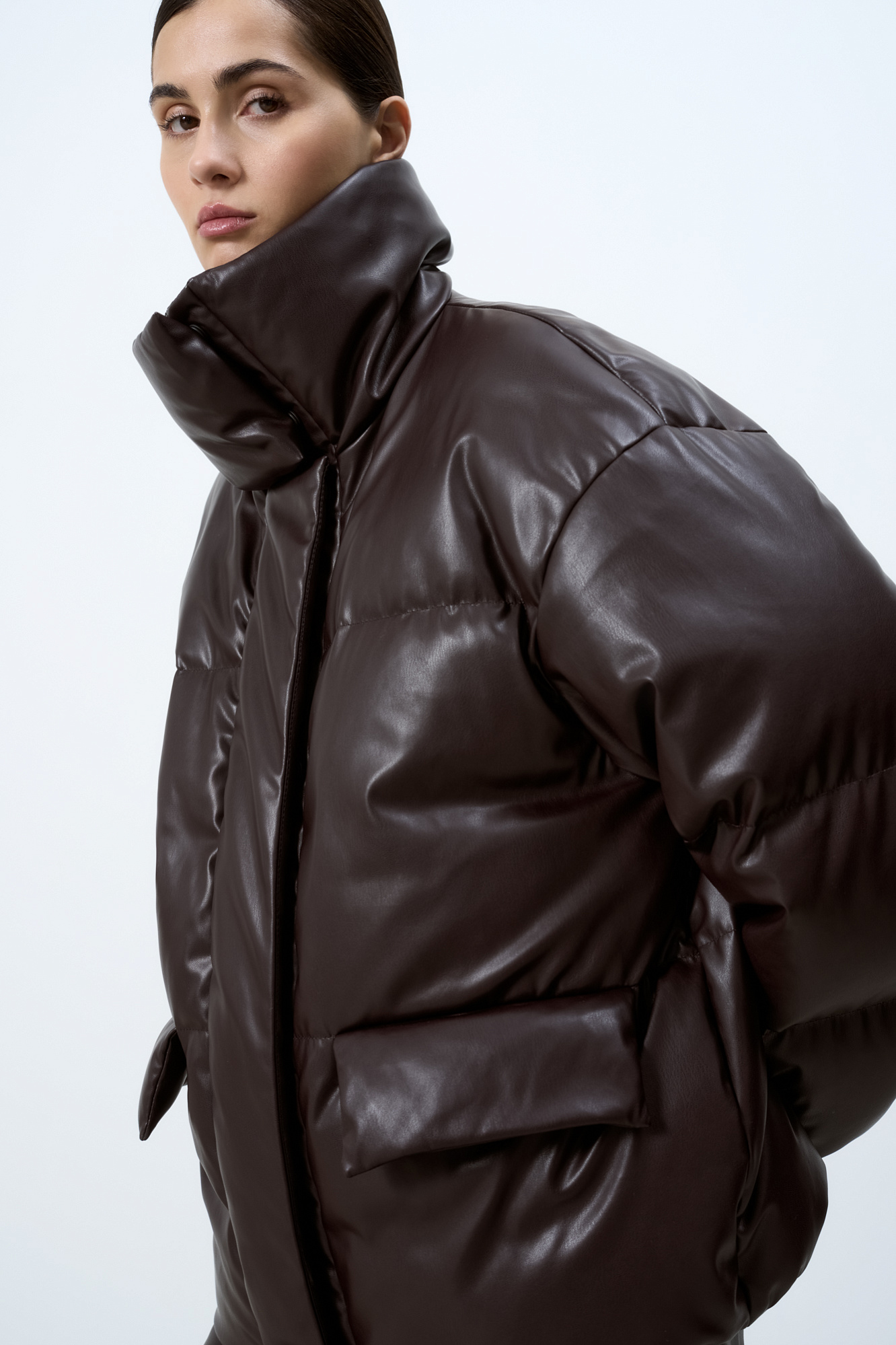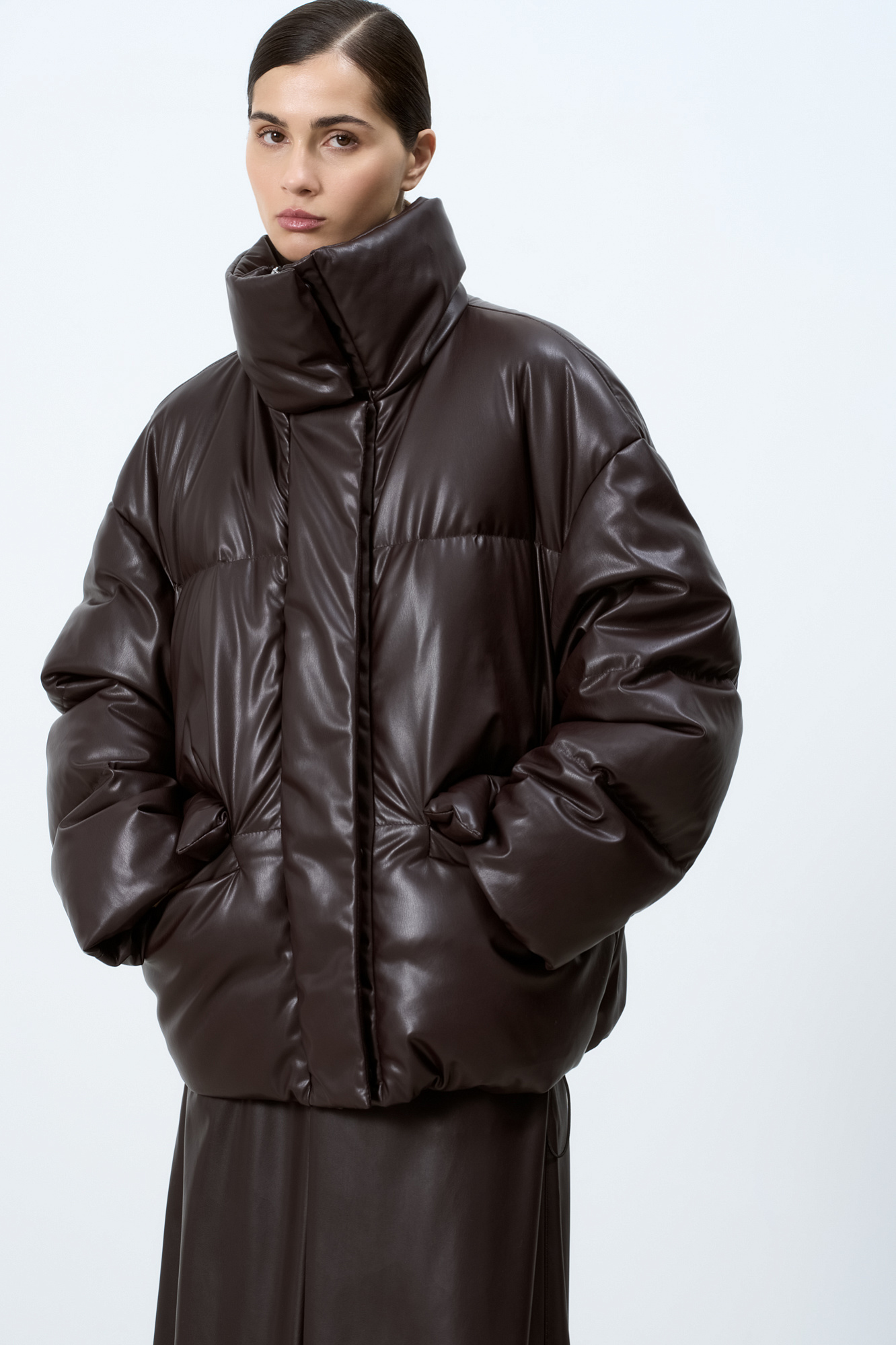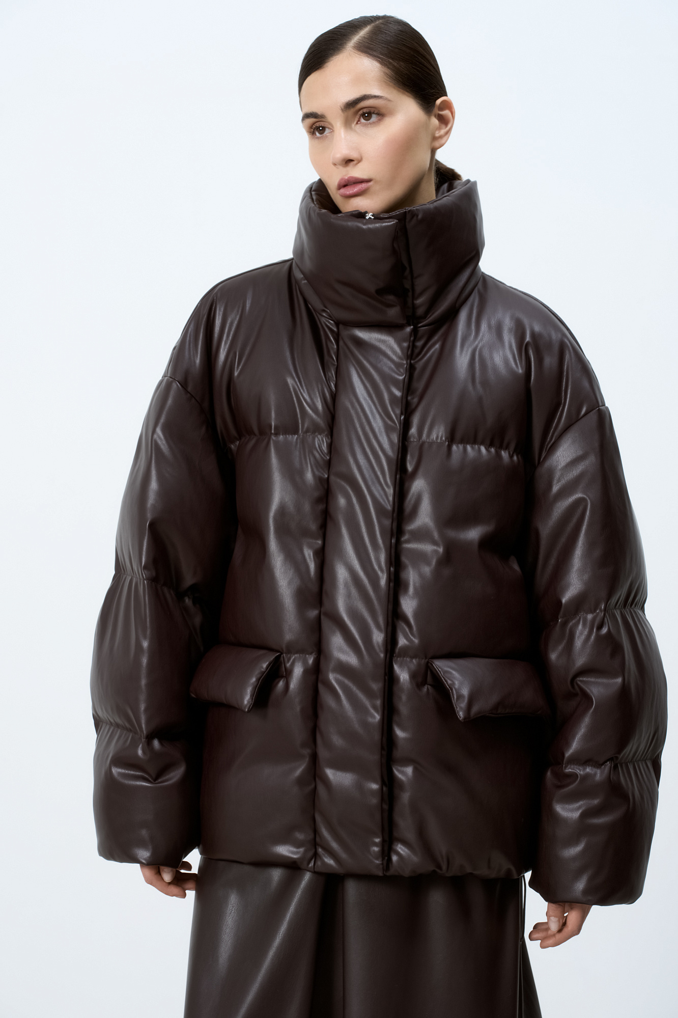 Утепленный пуховик из экокожи. Модель свободного силуэта с боковыми карманами и воротником-стойкой. Застежка на потайную молнию и магнитные пуговицы. На подкладке.