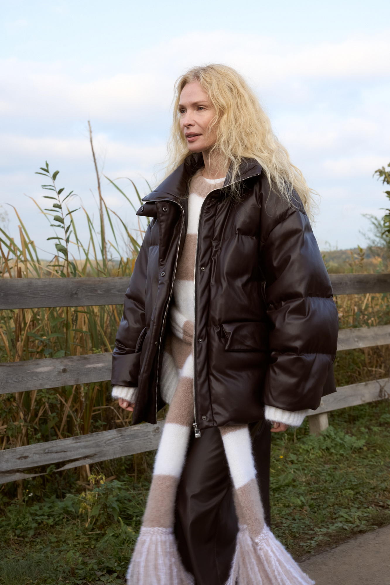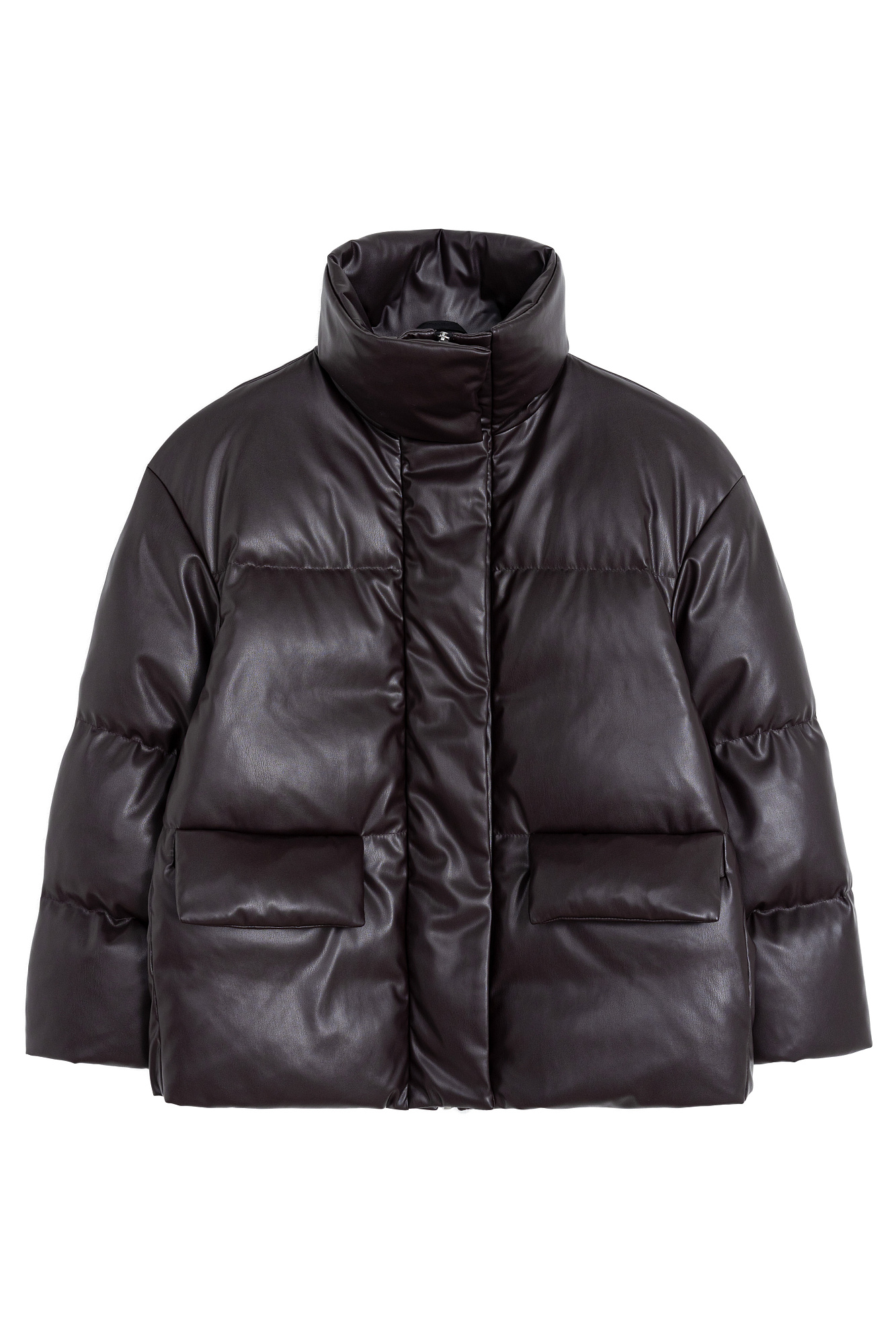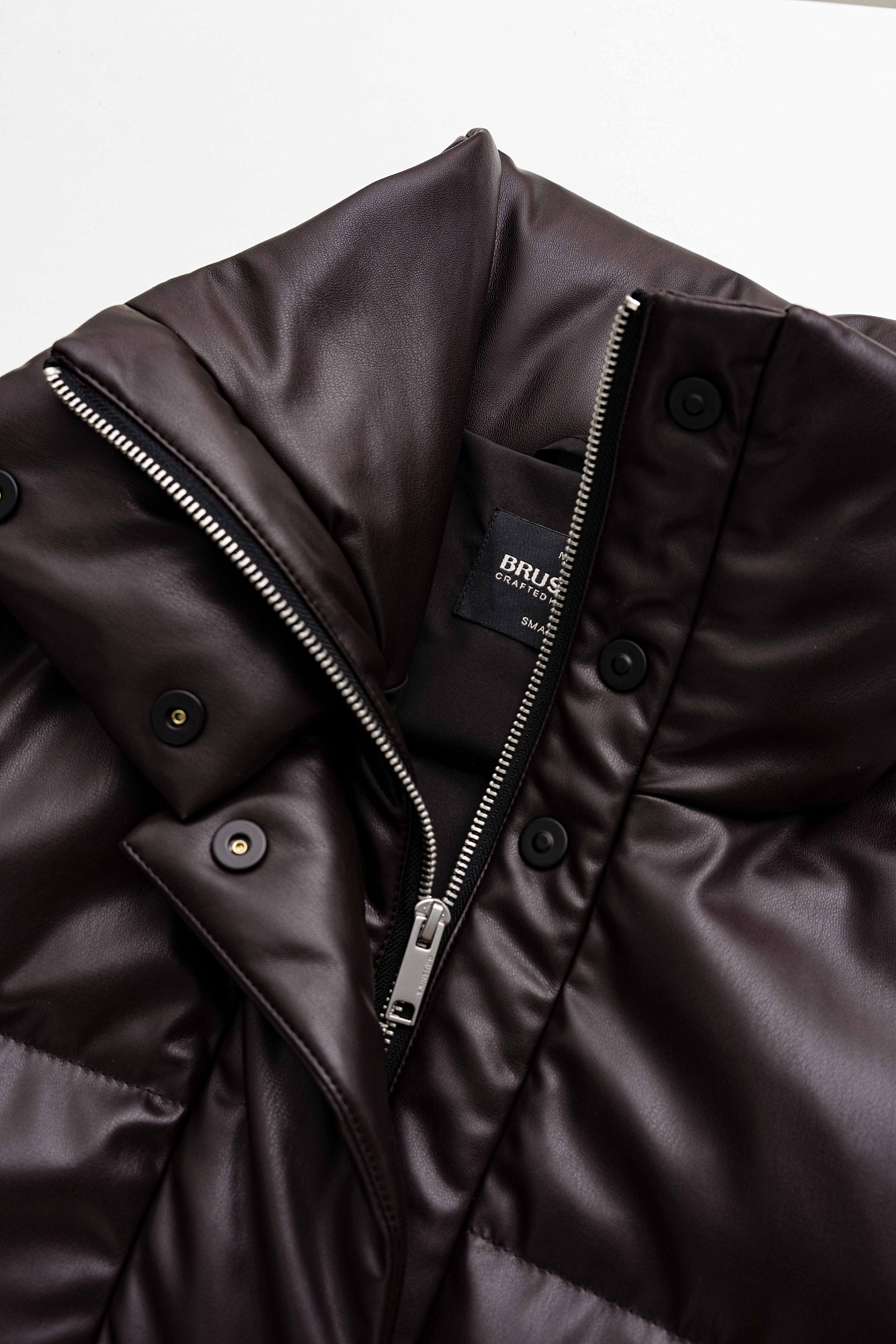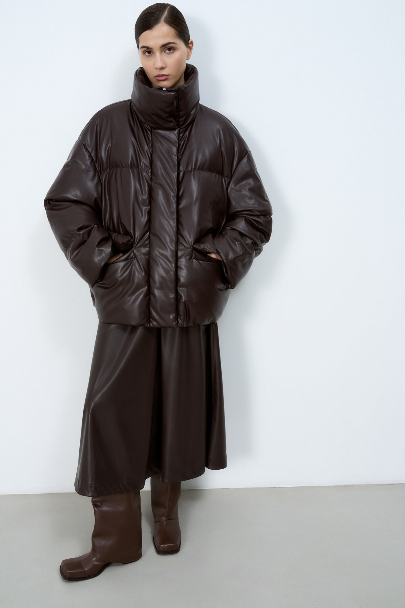 Утепленный пуховик из экокожи. Модель свободного силуэта с боковыми карманами и воротником-стойкой. Застежка на потайную молнию и магнитные пуговицы. На подкладке.