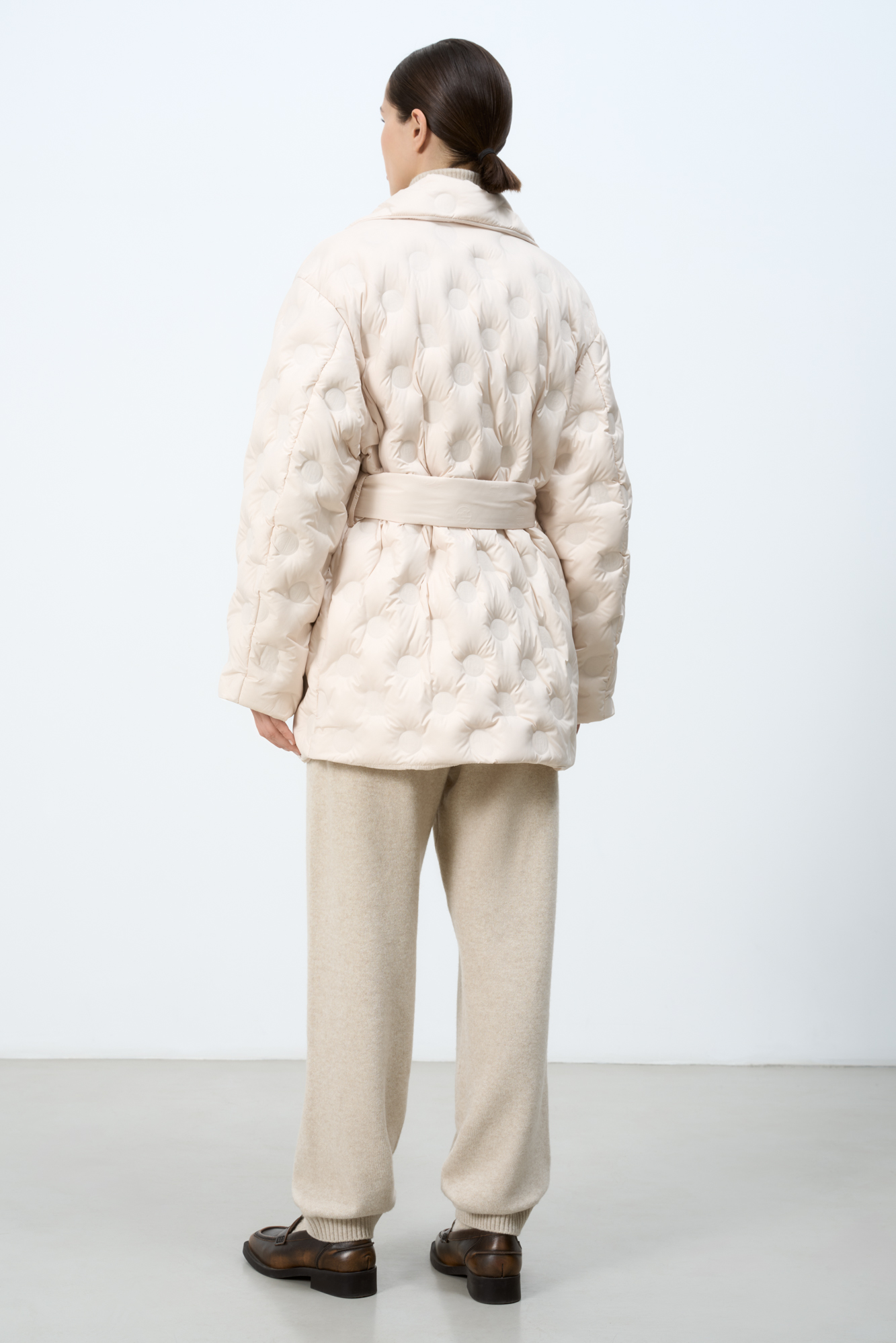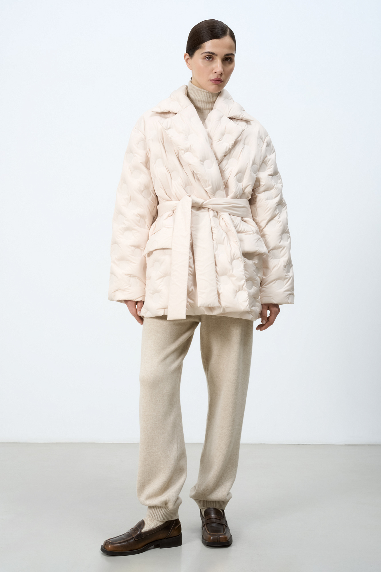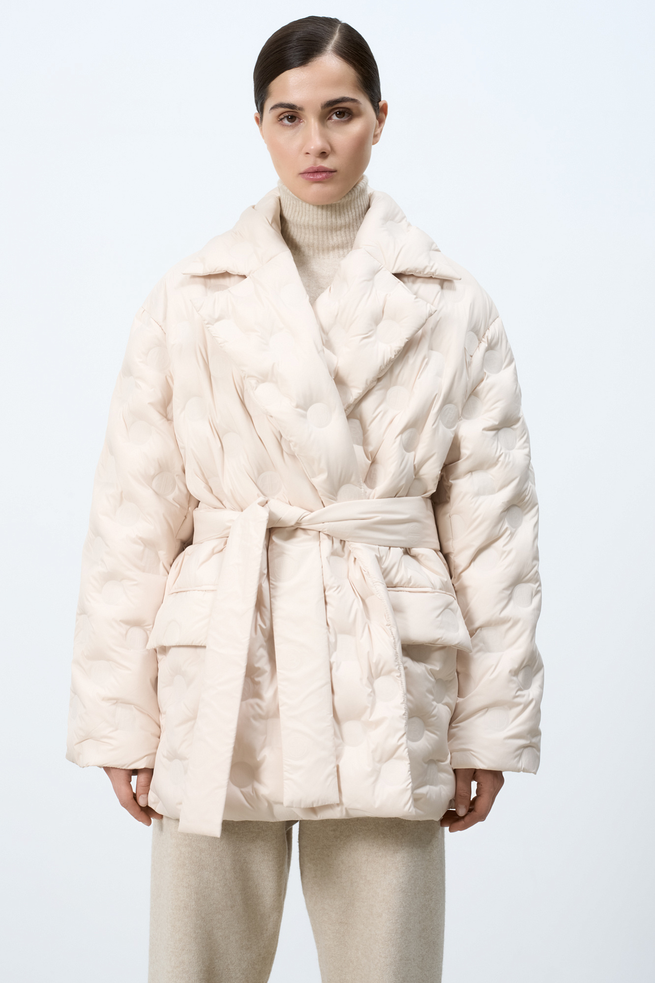 Утепленный пуховик на запах. Модель свободного силуэта с карманами спереди и поясом в тон. Изделие декорировано брендированным тиснением. На подкладке.
