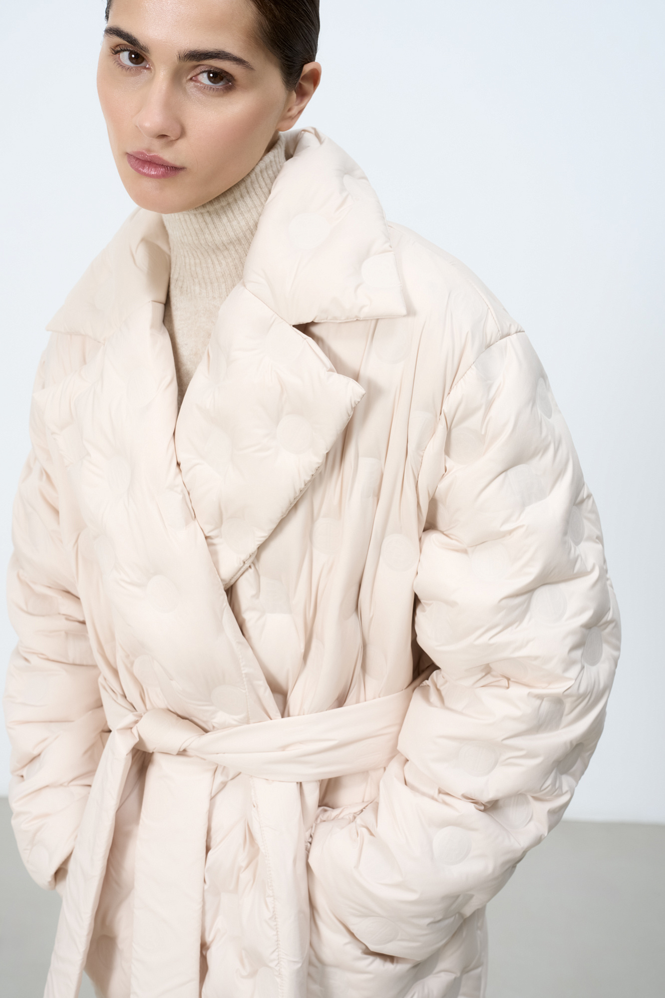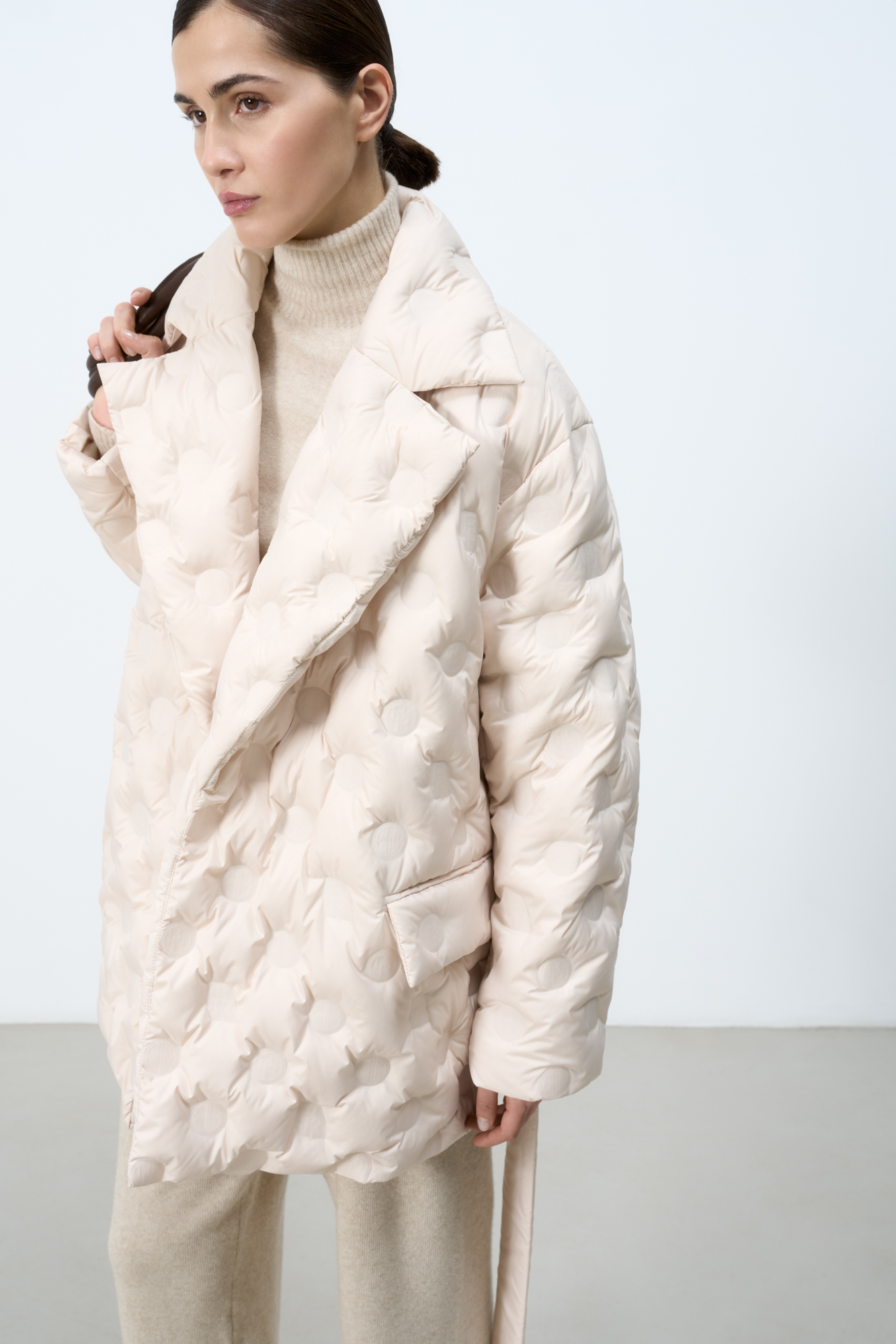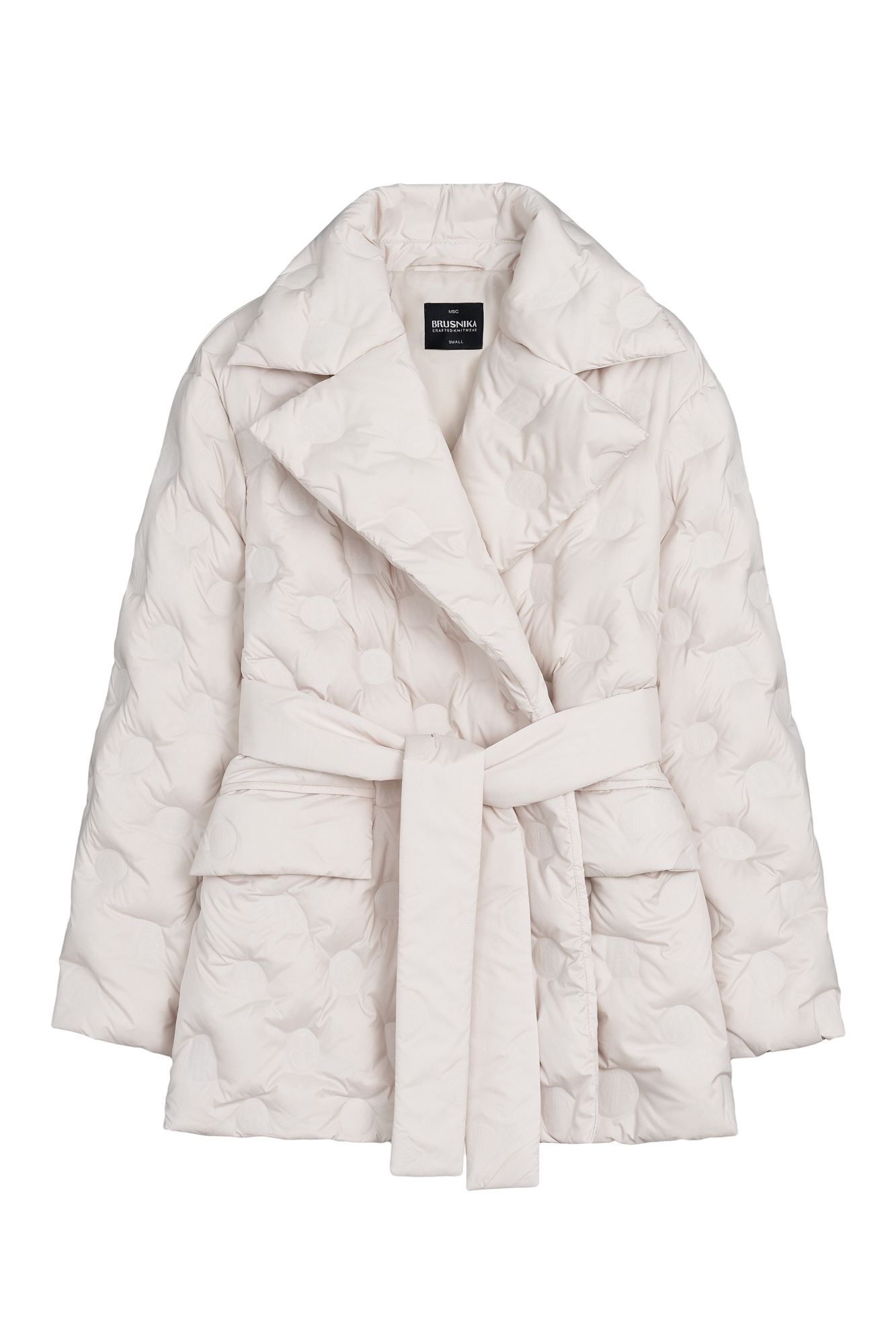 Пуховик на запах с брендированным тиснением