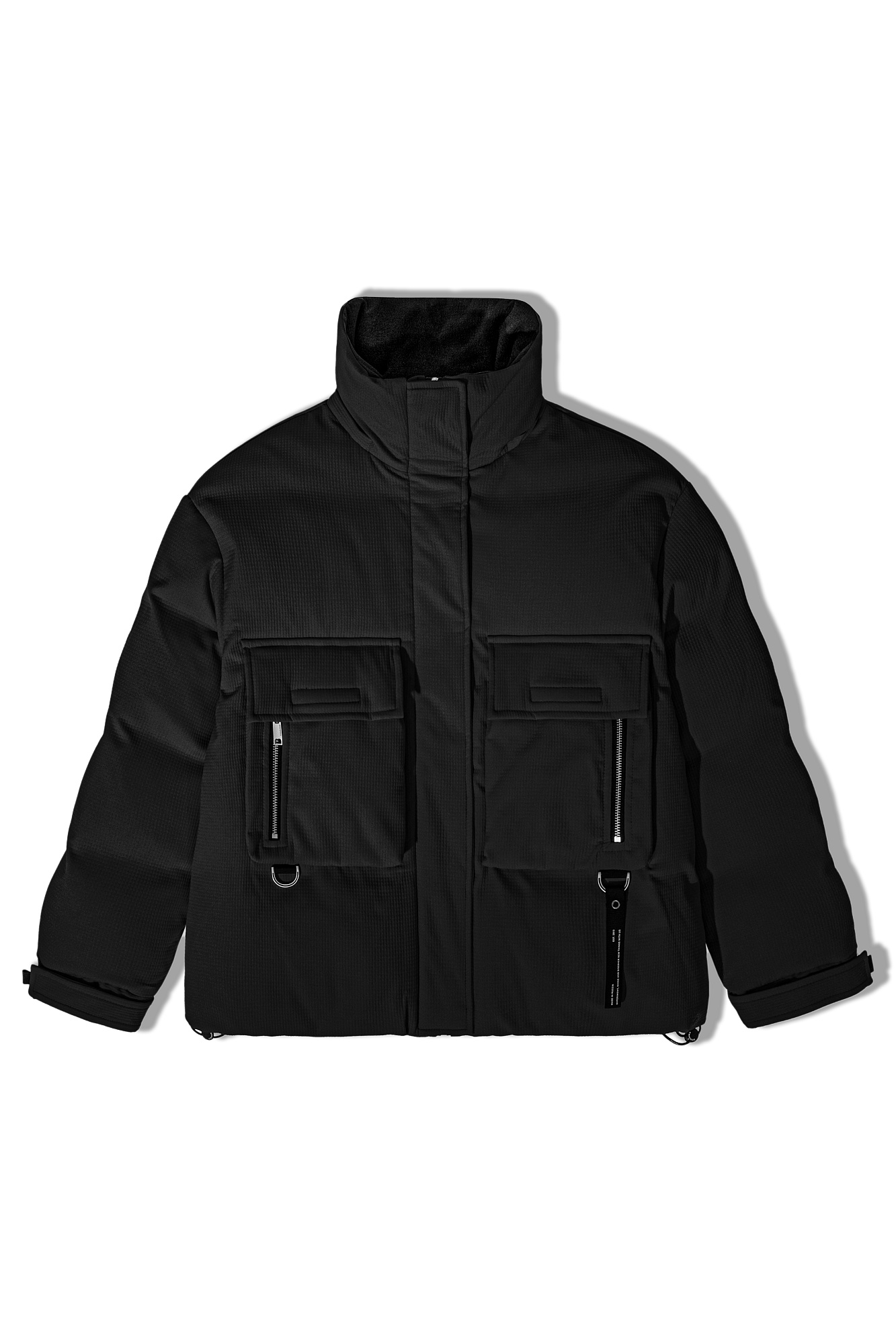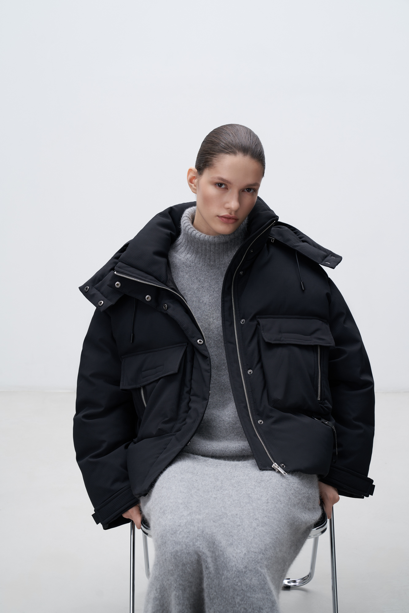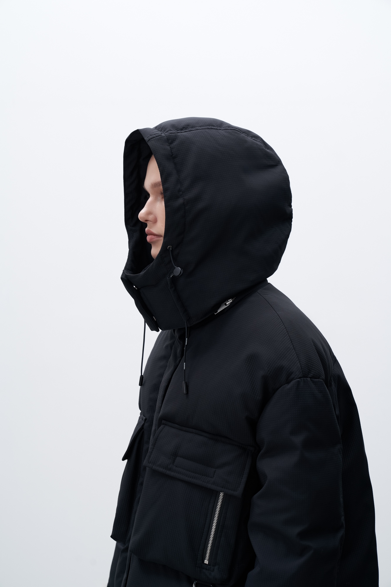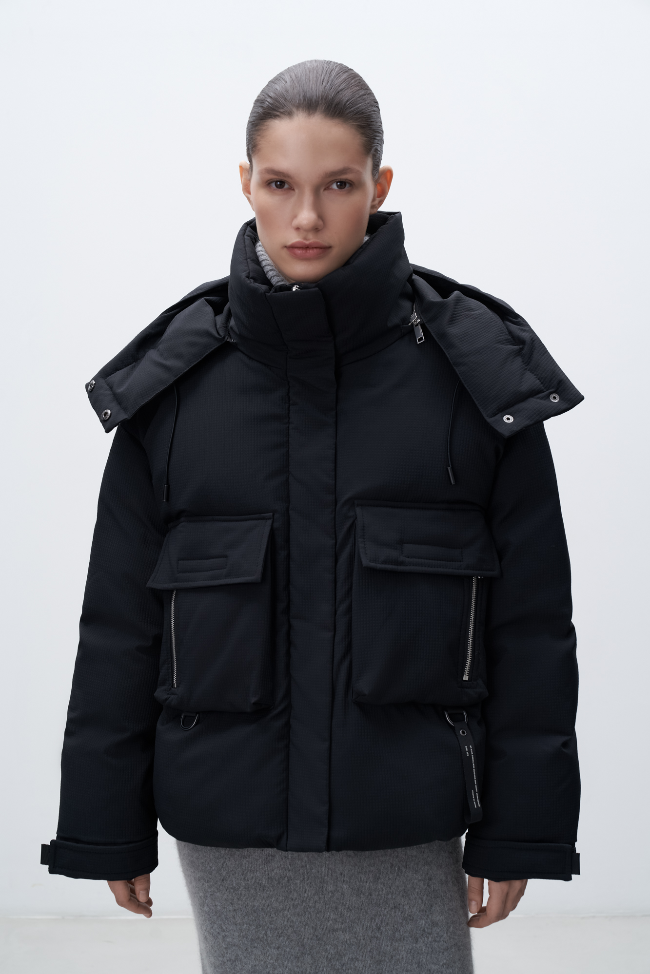 Пуховик с двумя нагрудными накладными карманами, воротником-стойкой и капюшоном. Застежка на молнию под планкой. Манжеты рукавов фиксируются липучкой. Низ изделия выполнен на регулируемой кулиске.