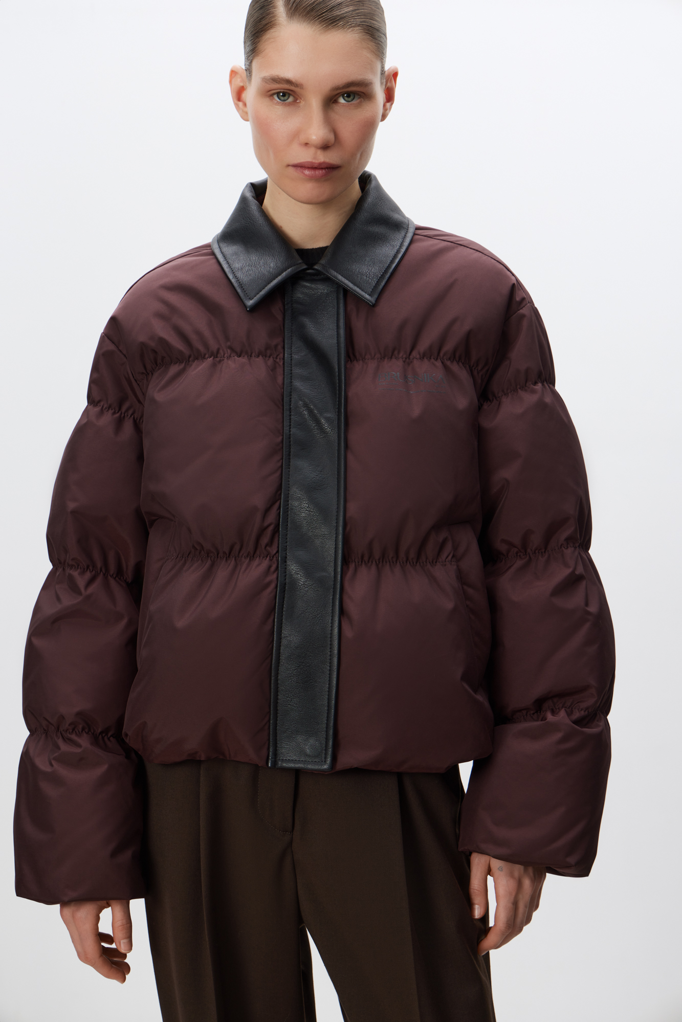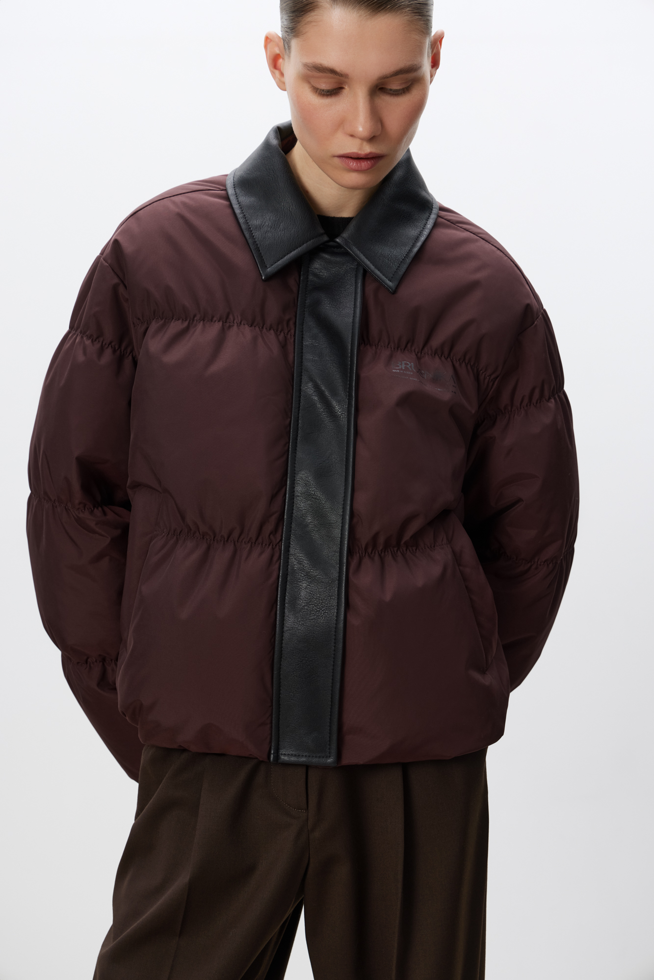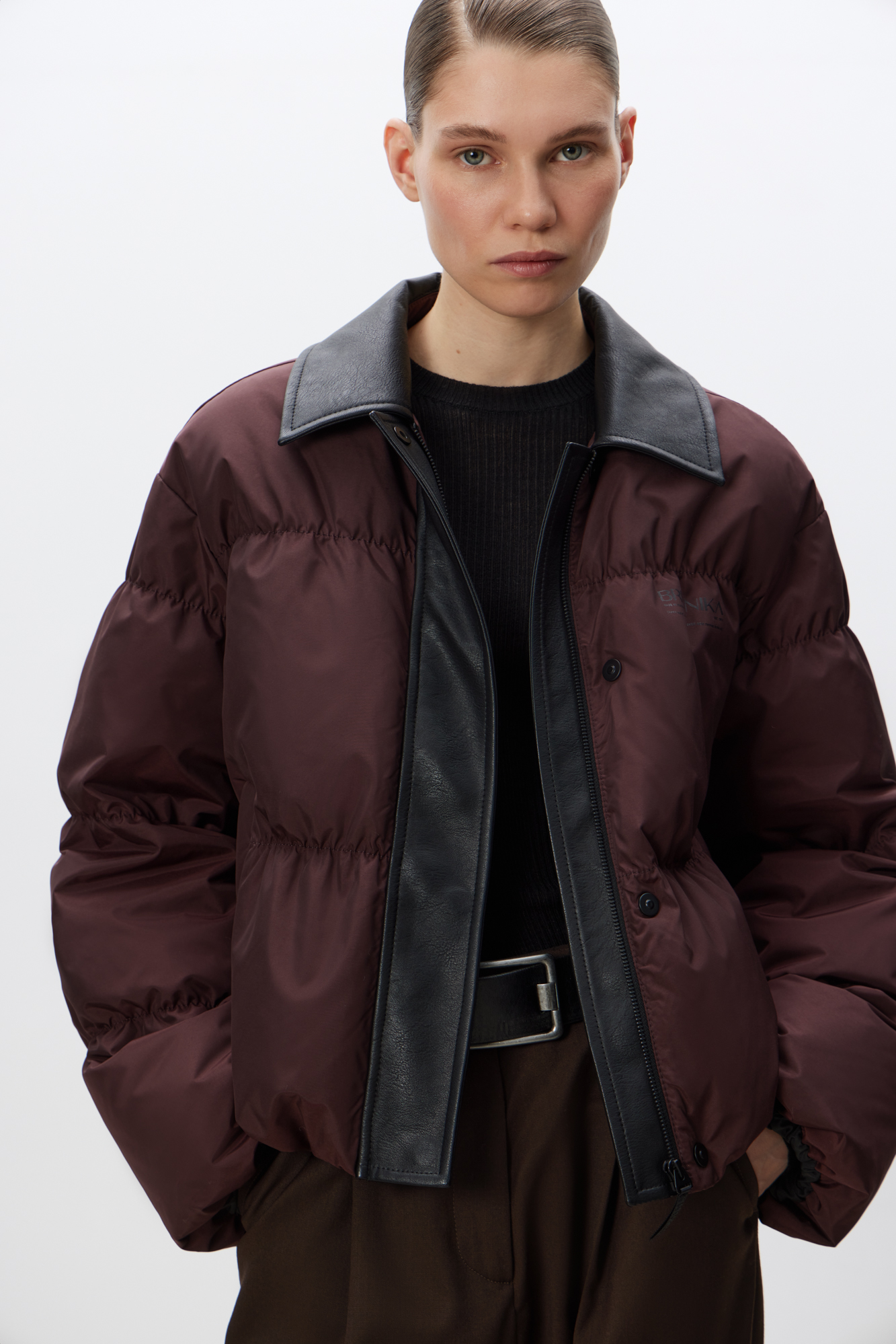 Пуховик с отложным воротником из экокожи