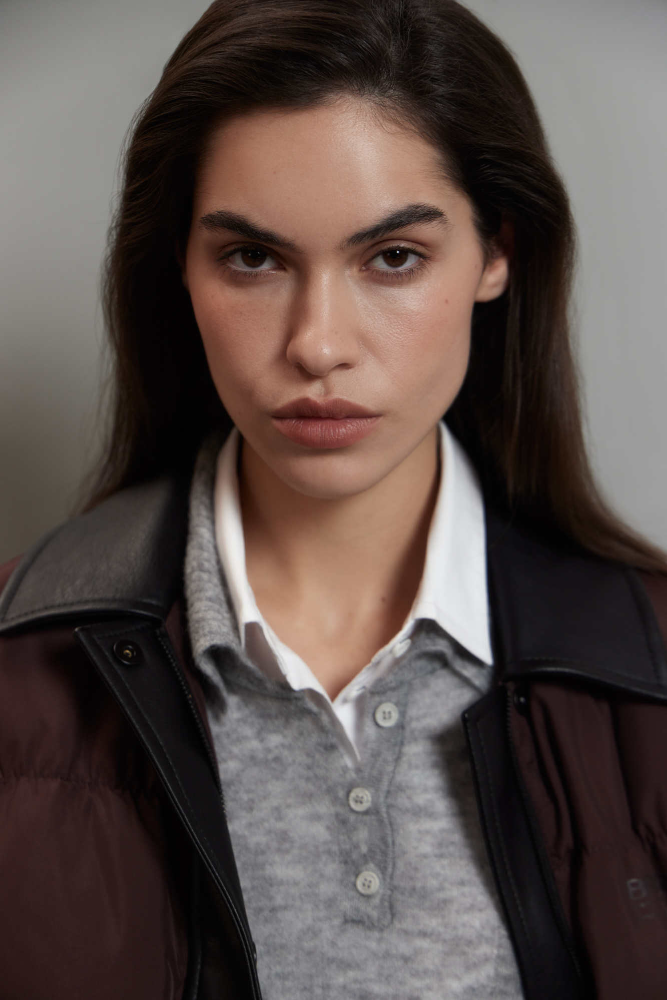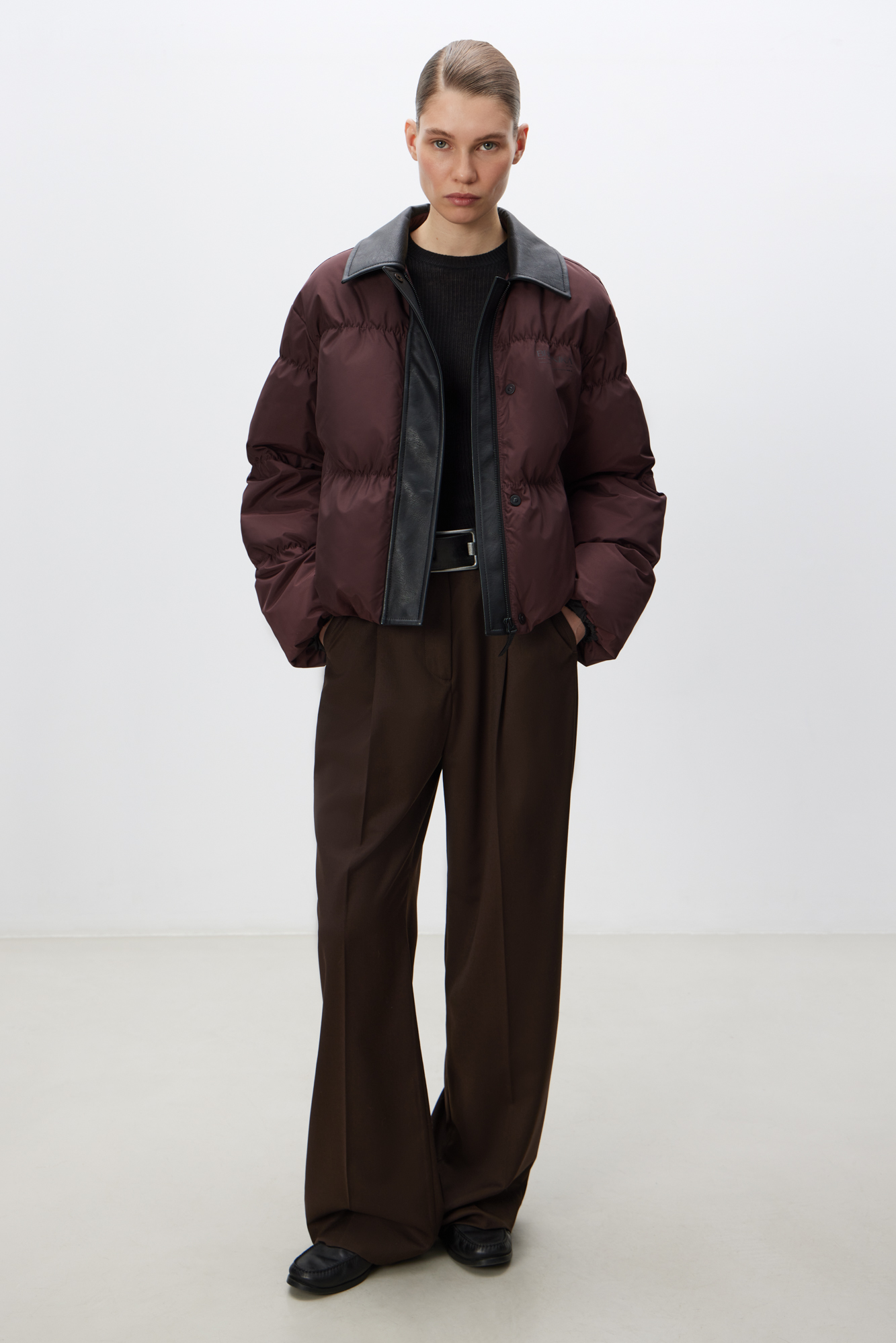 Стеганый пуховик с отложным воротником из экокожи. Модель свободного силуэта со спущенной линией плеч и боковыми карманами. Застежка на молнию и магнитные кнопки под вертикальной планкой из экокожи. Логотип на груди. Изделие выполнено на подкладке.