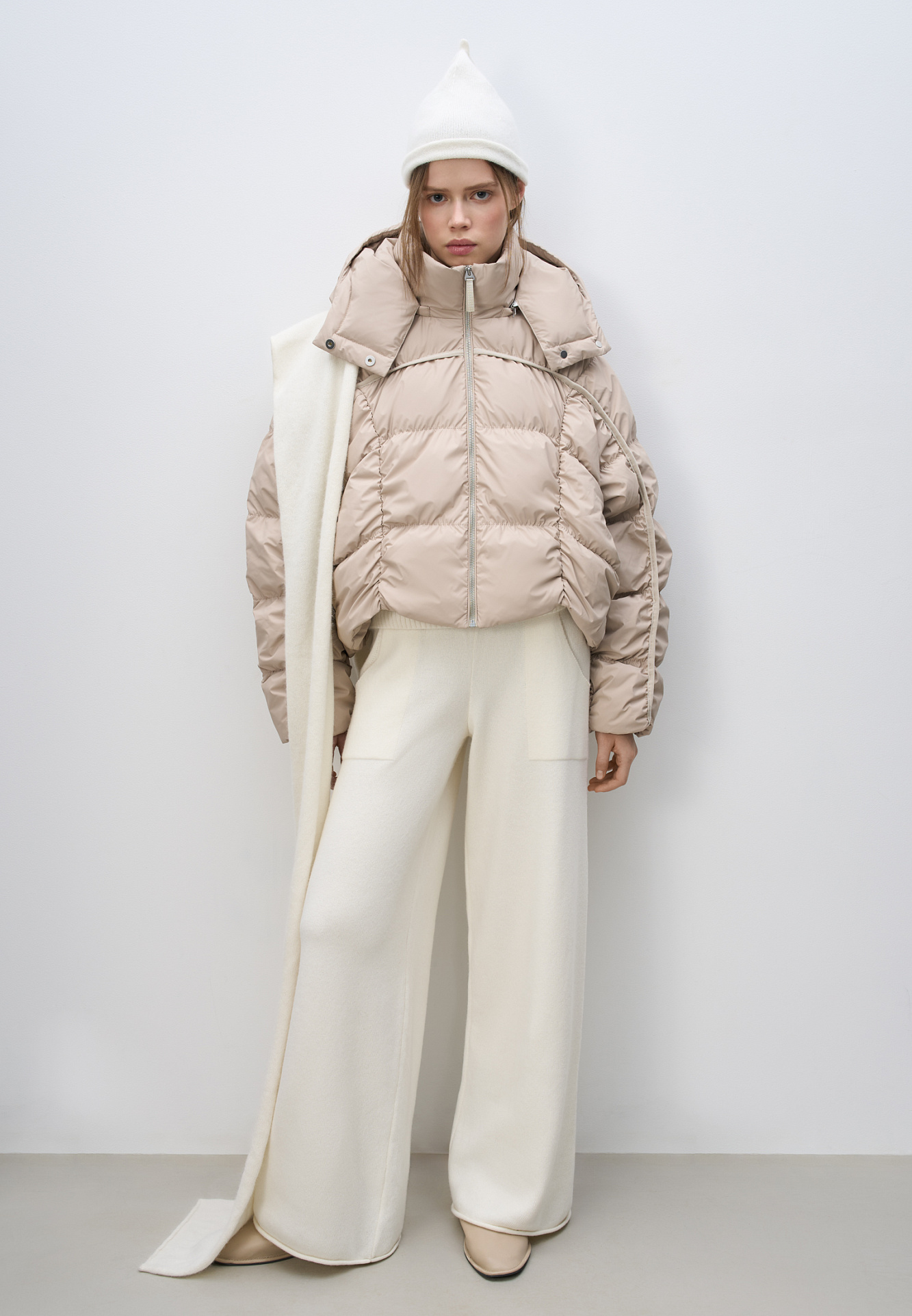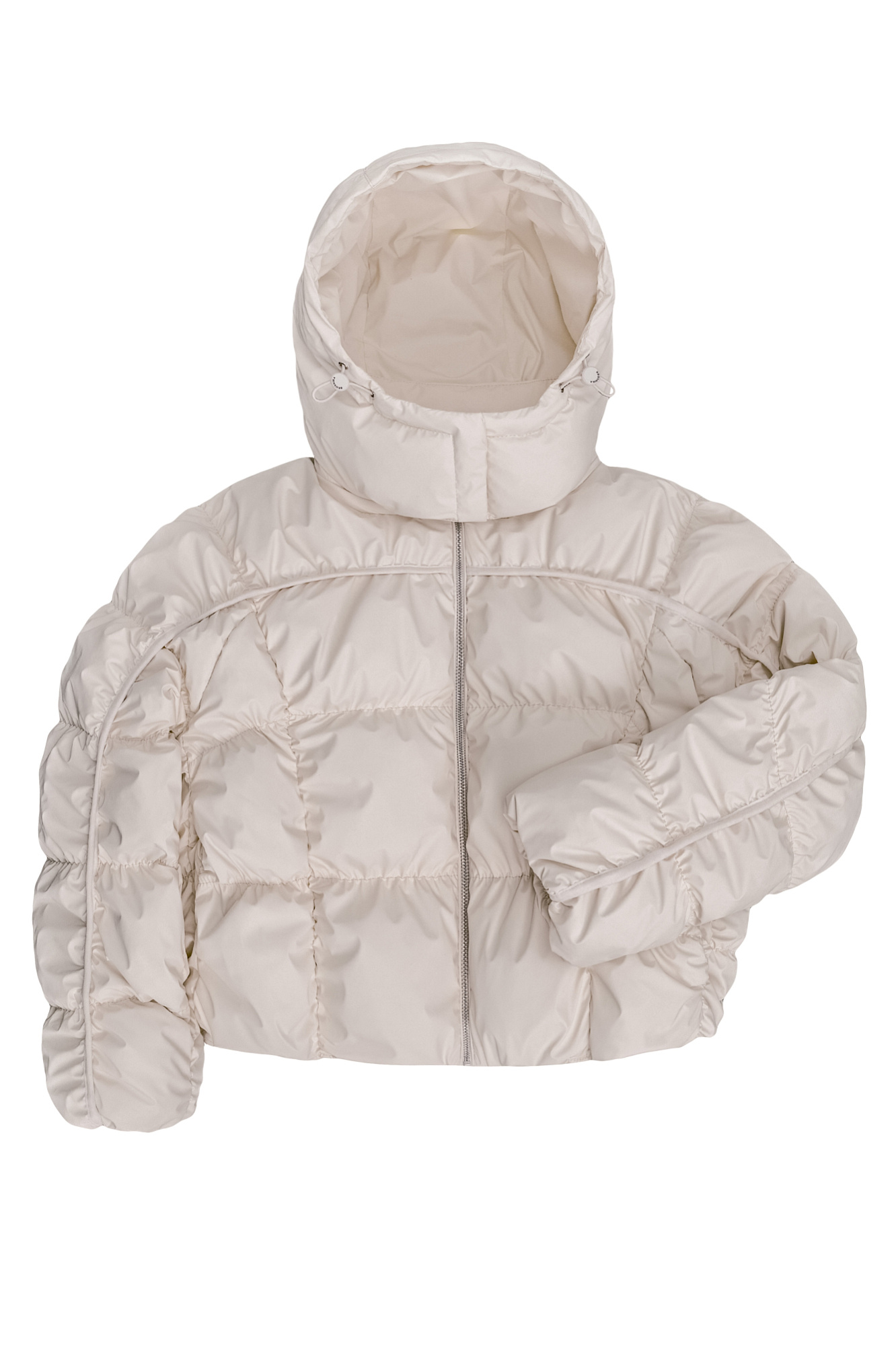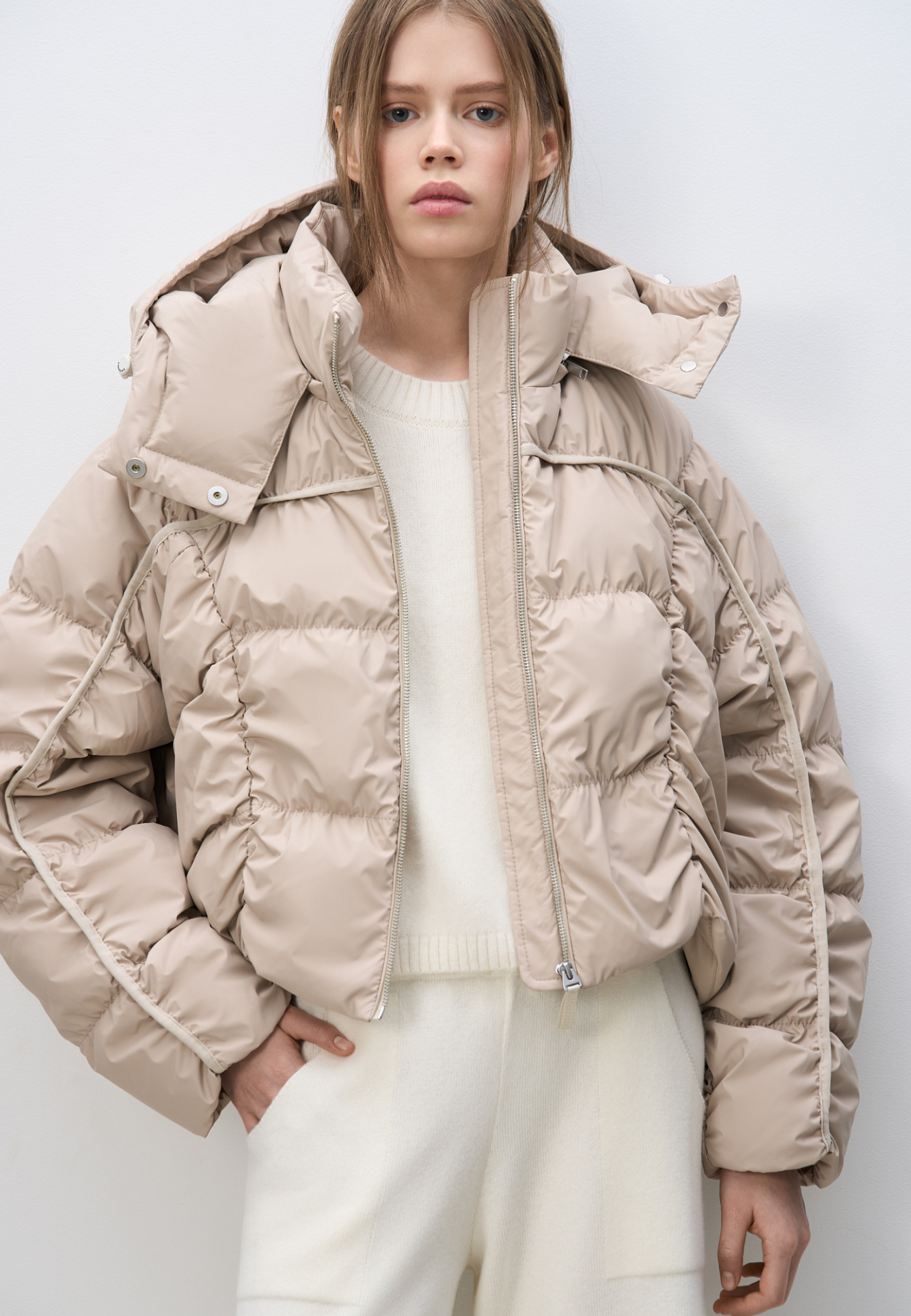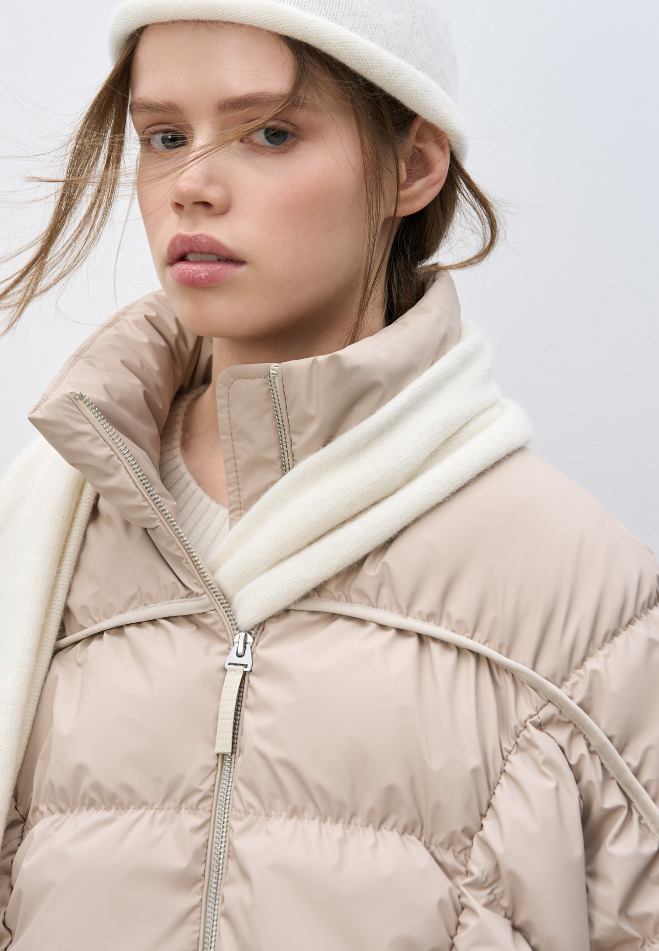 Объемный пуховик с геометрической стежкой и объемными швами. Изделие с капюшоном на кулиске и воротником-стойкой.