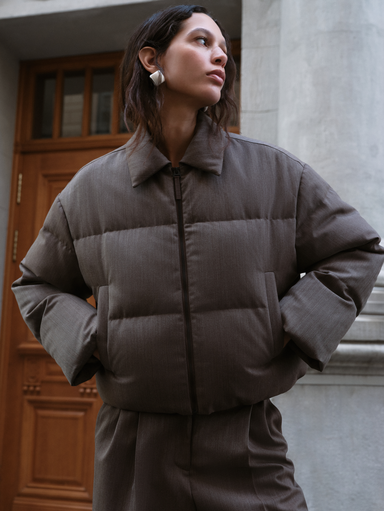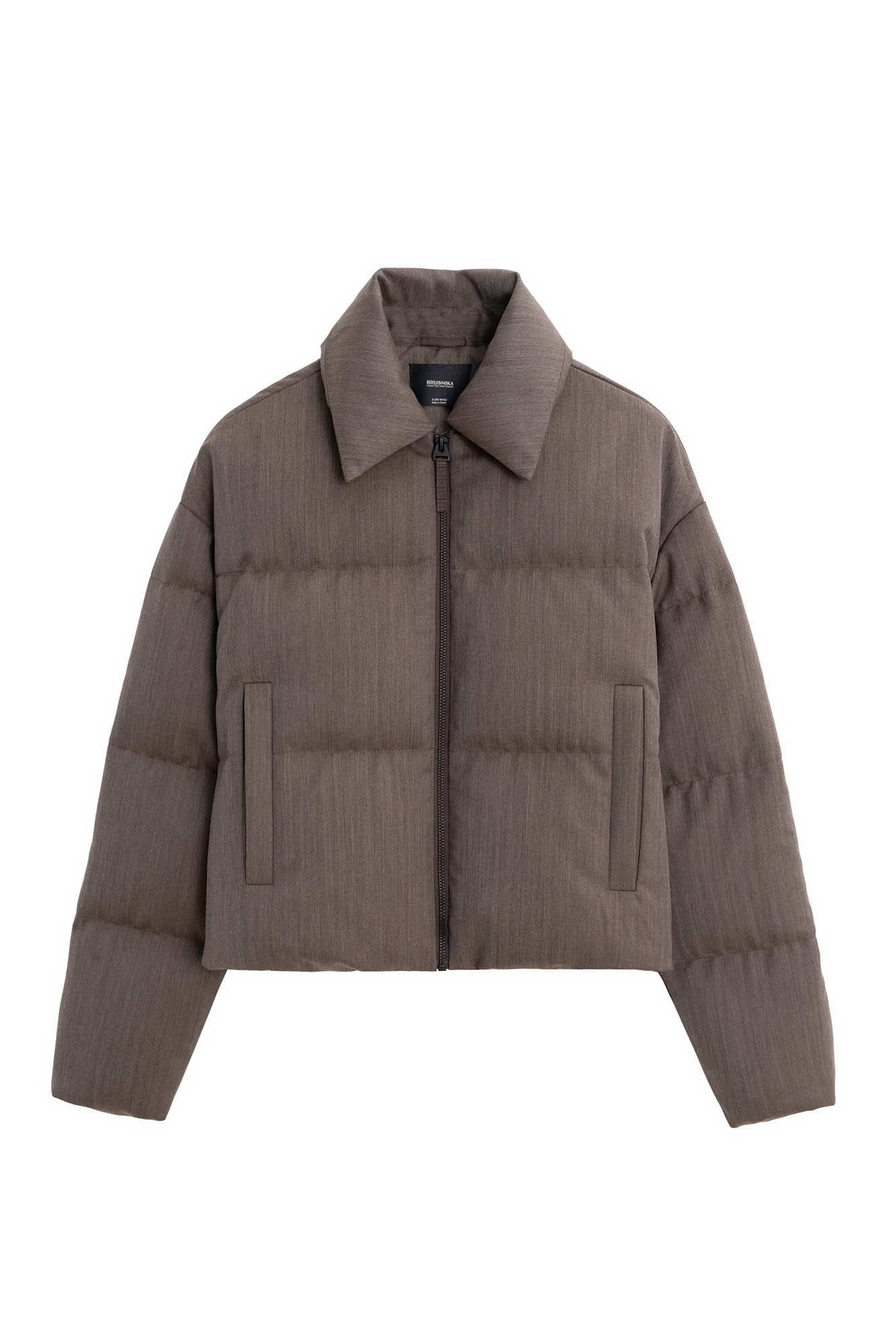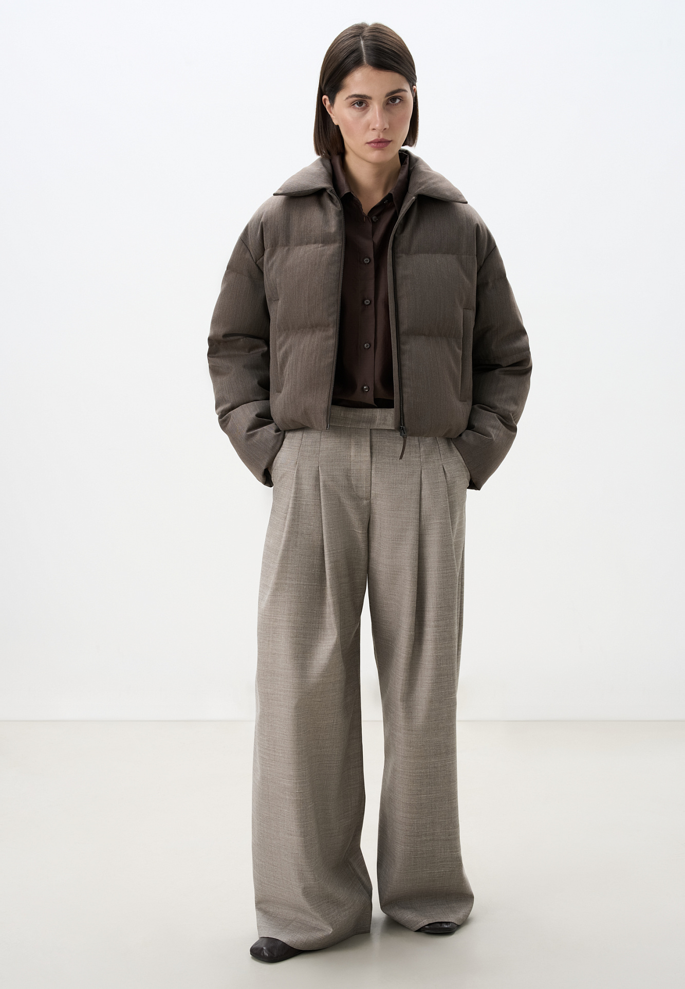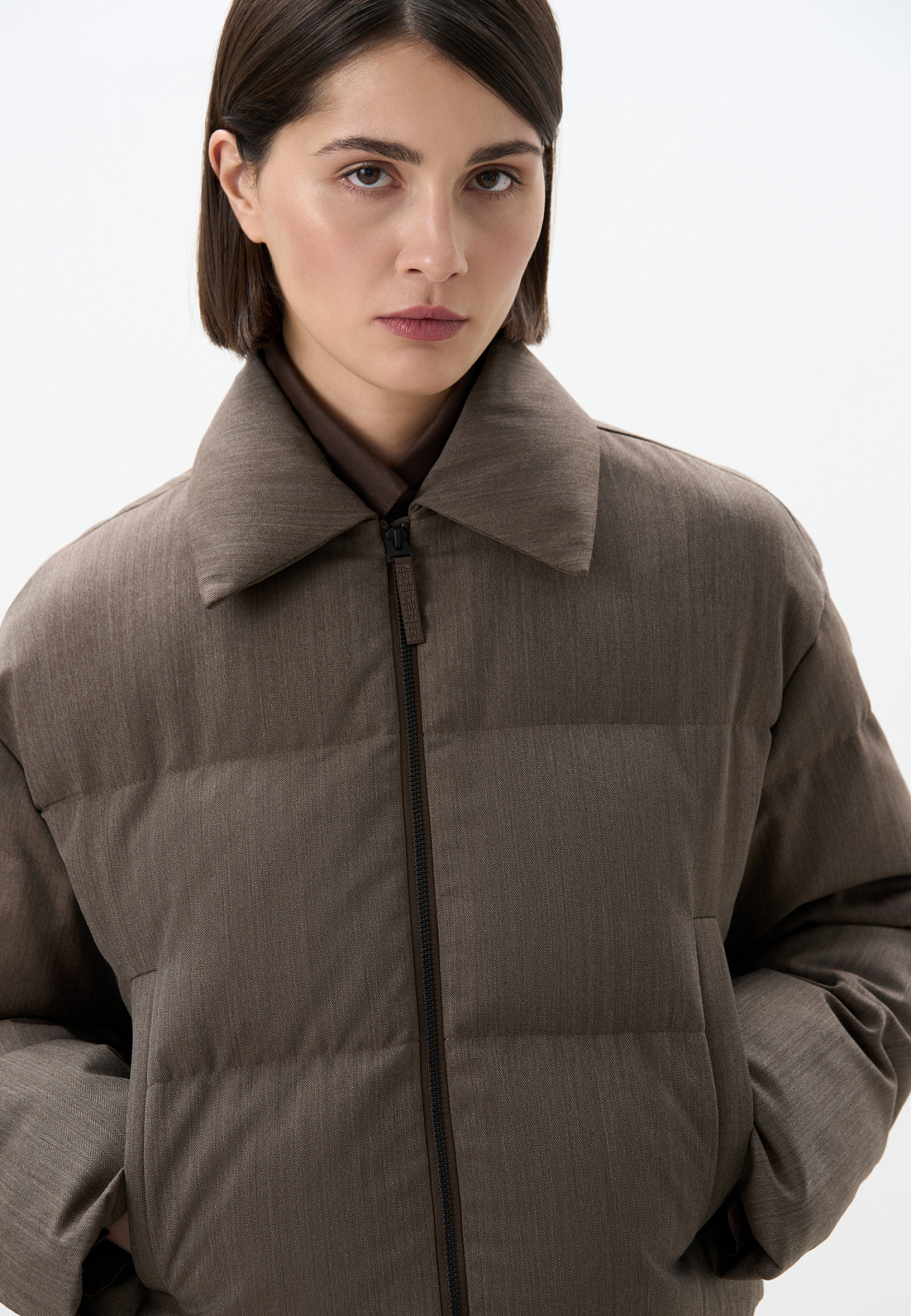 Пуховик с отложным воротником из шерстяной ткани. Модель свободного силуэта со спущенной линией плеч и боковыми карманами. Застежка на молнию. Изделие выполнено на подкладке.