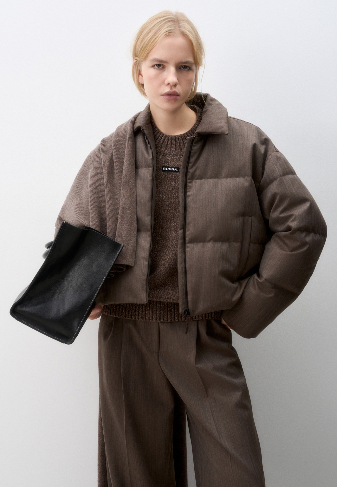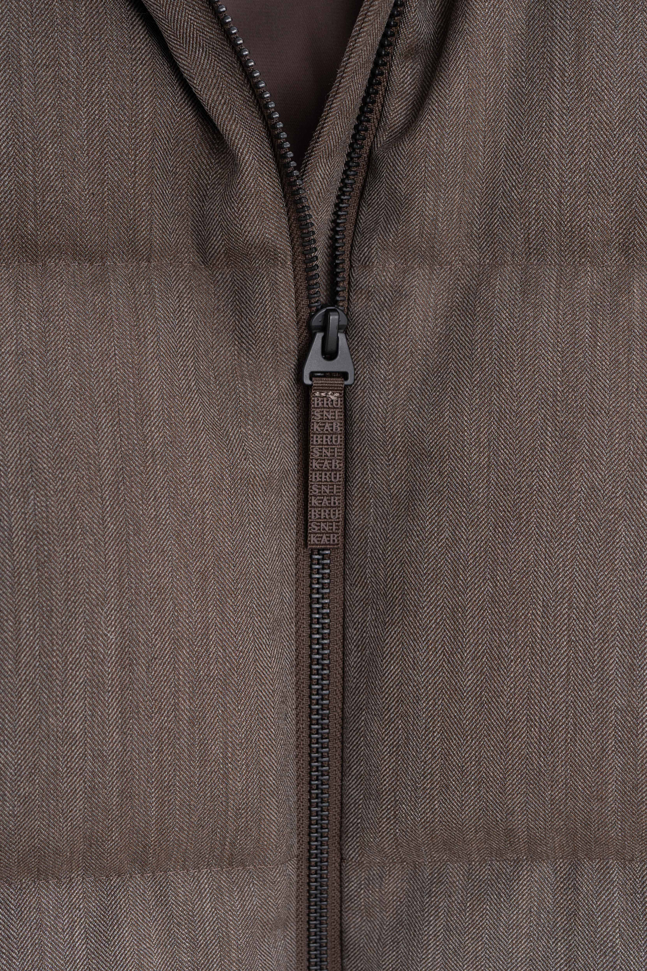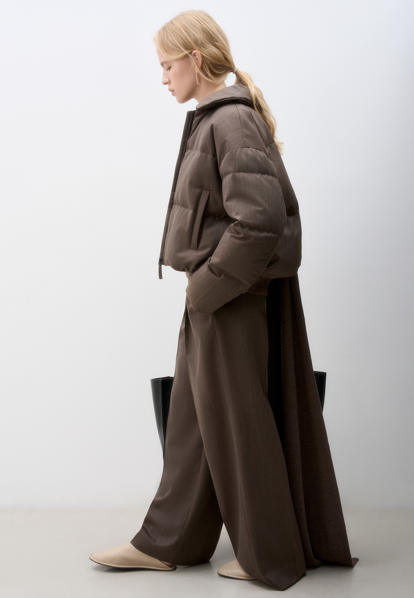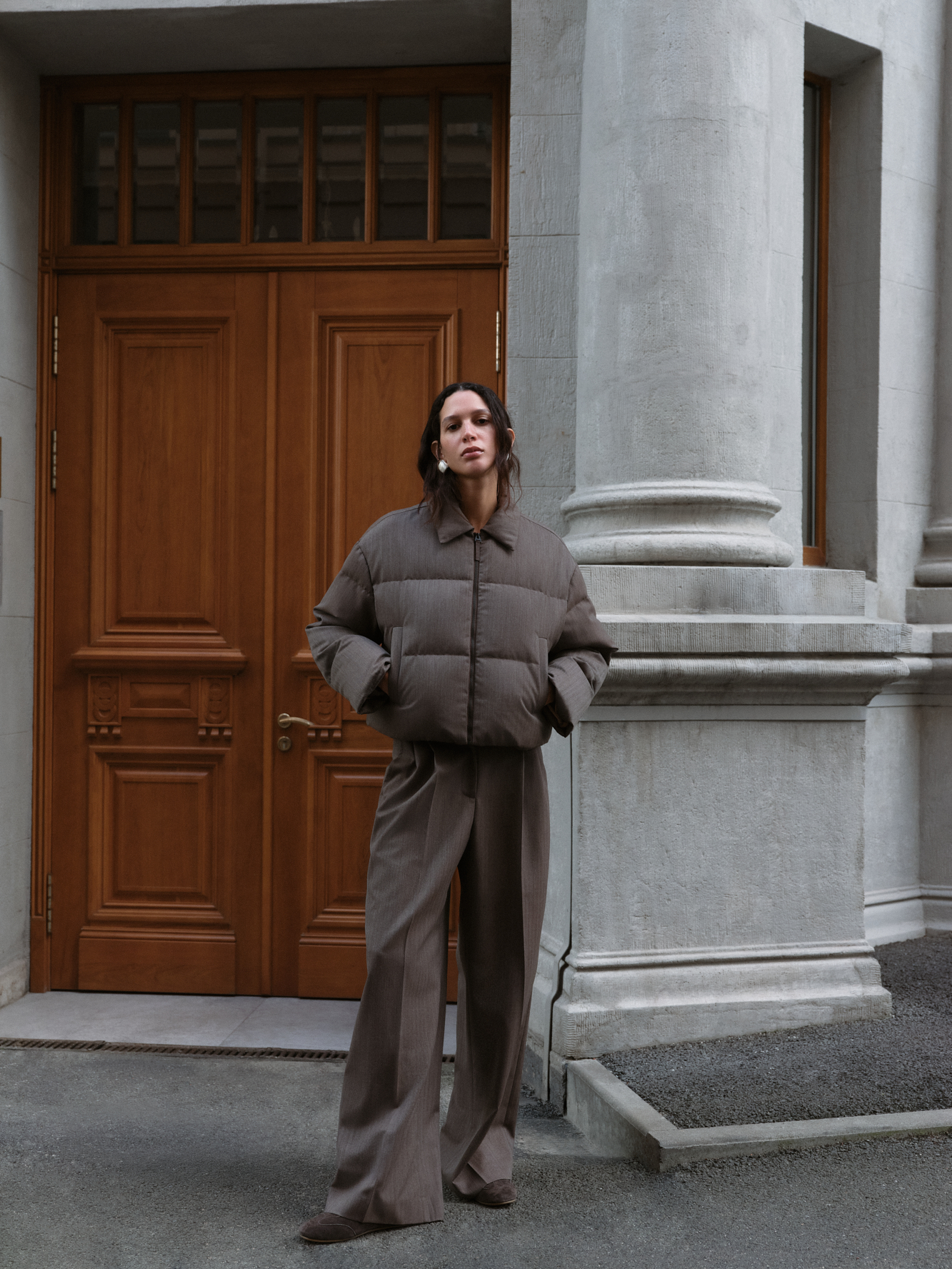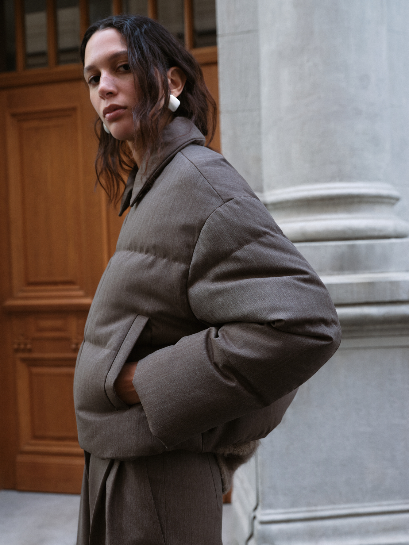 Пуховик с отложным воротником из шерстяной ткани. Модель свободного силуэта со спущенной линией плеч и боковыми карманами. Застежка на молнию. Изделие выполнено на подкладке.