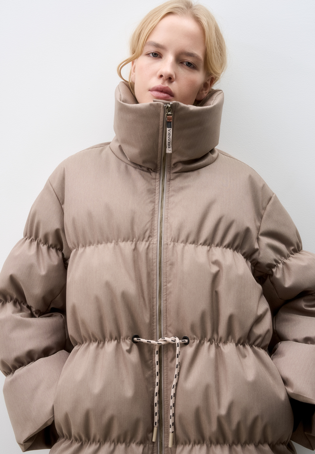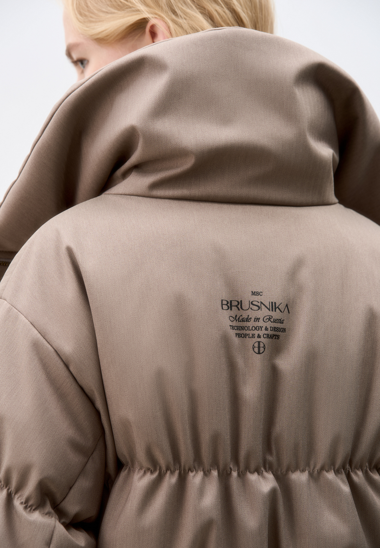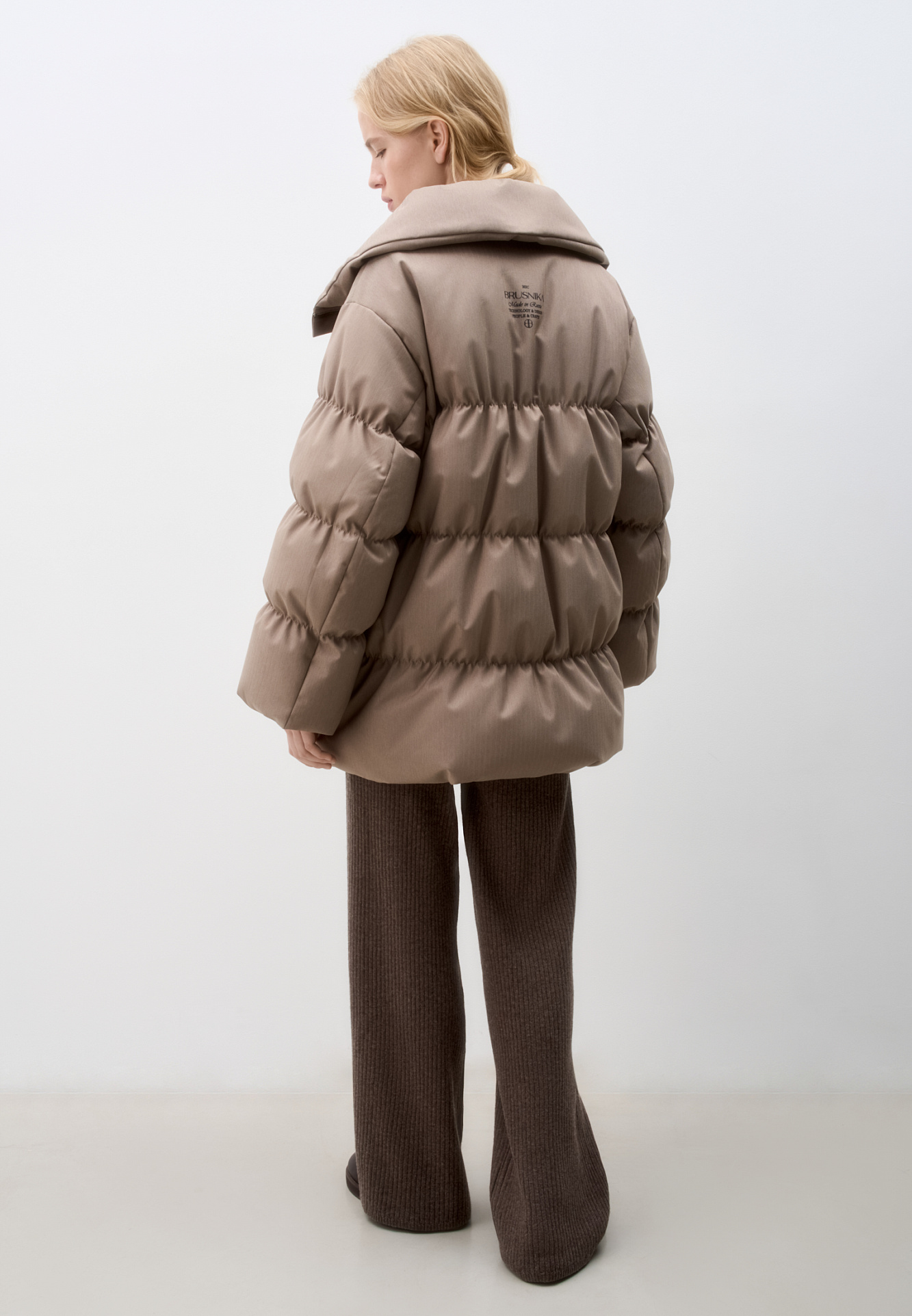 Стеганый объемный пуховик. Модель свободного силуэта, с воротником-стойкой, кулиской на талии и логотипом бренда на спине. Застежка на молнию.