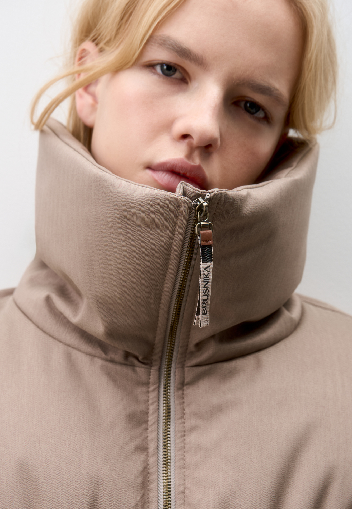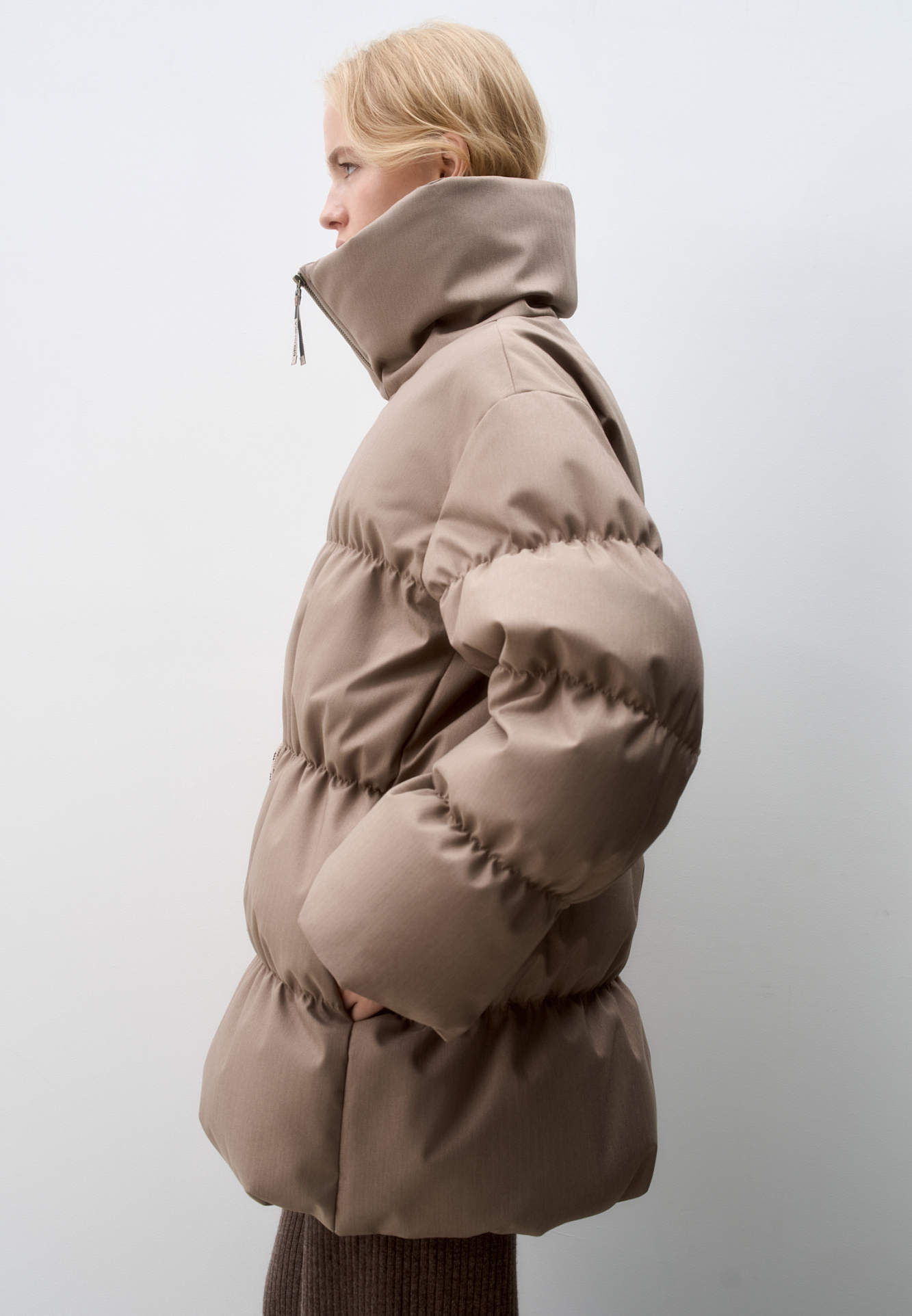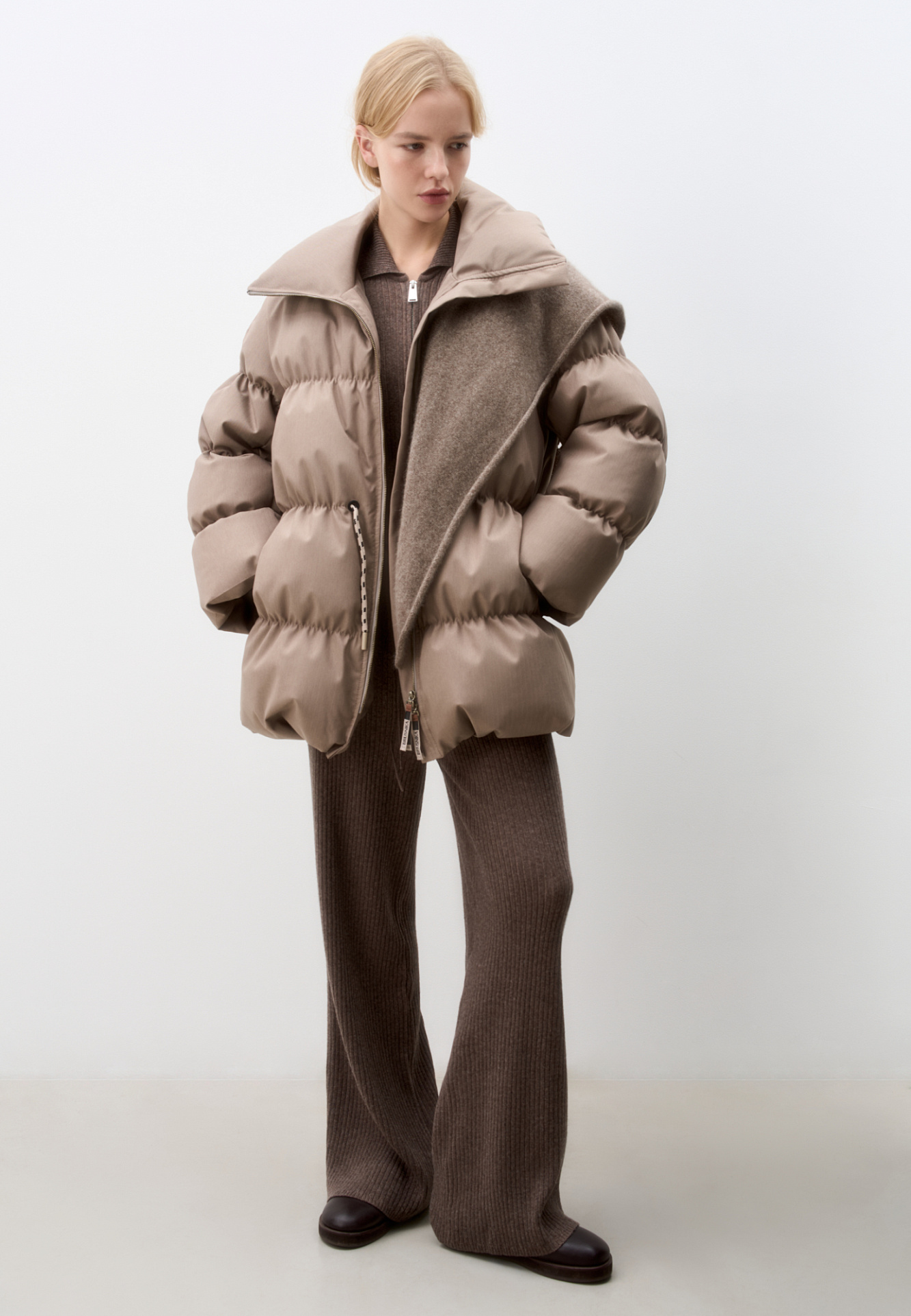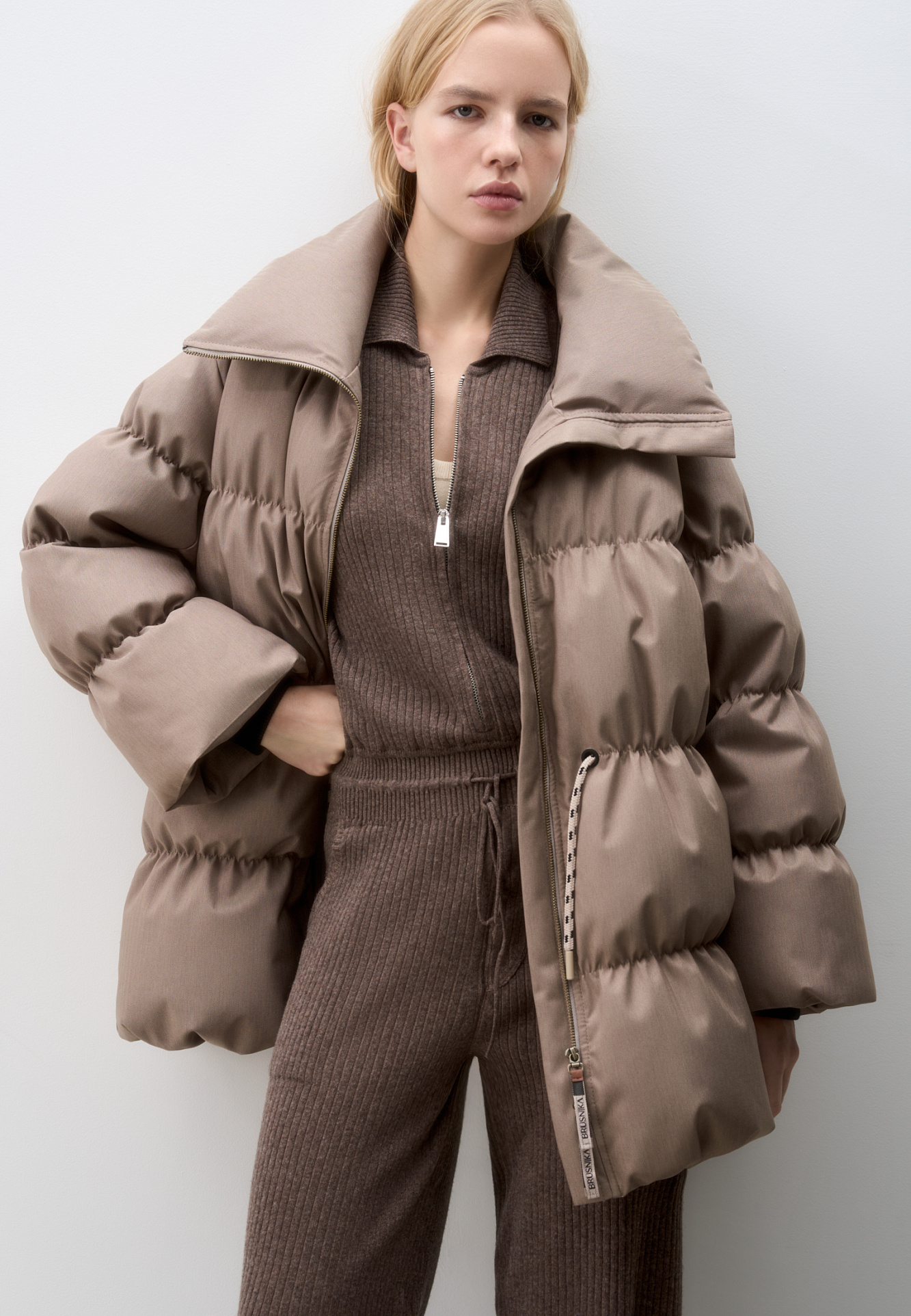 Стеганый объемный пуховик. Модель свободного силуэта, с воротником-стойкой, кулиской на талии и логотипом бренда на спине. Застежка на молнию.