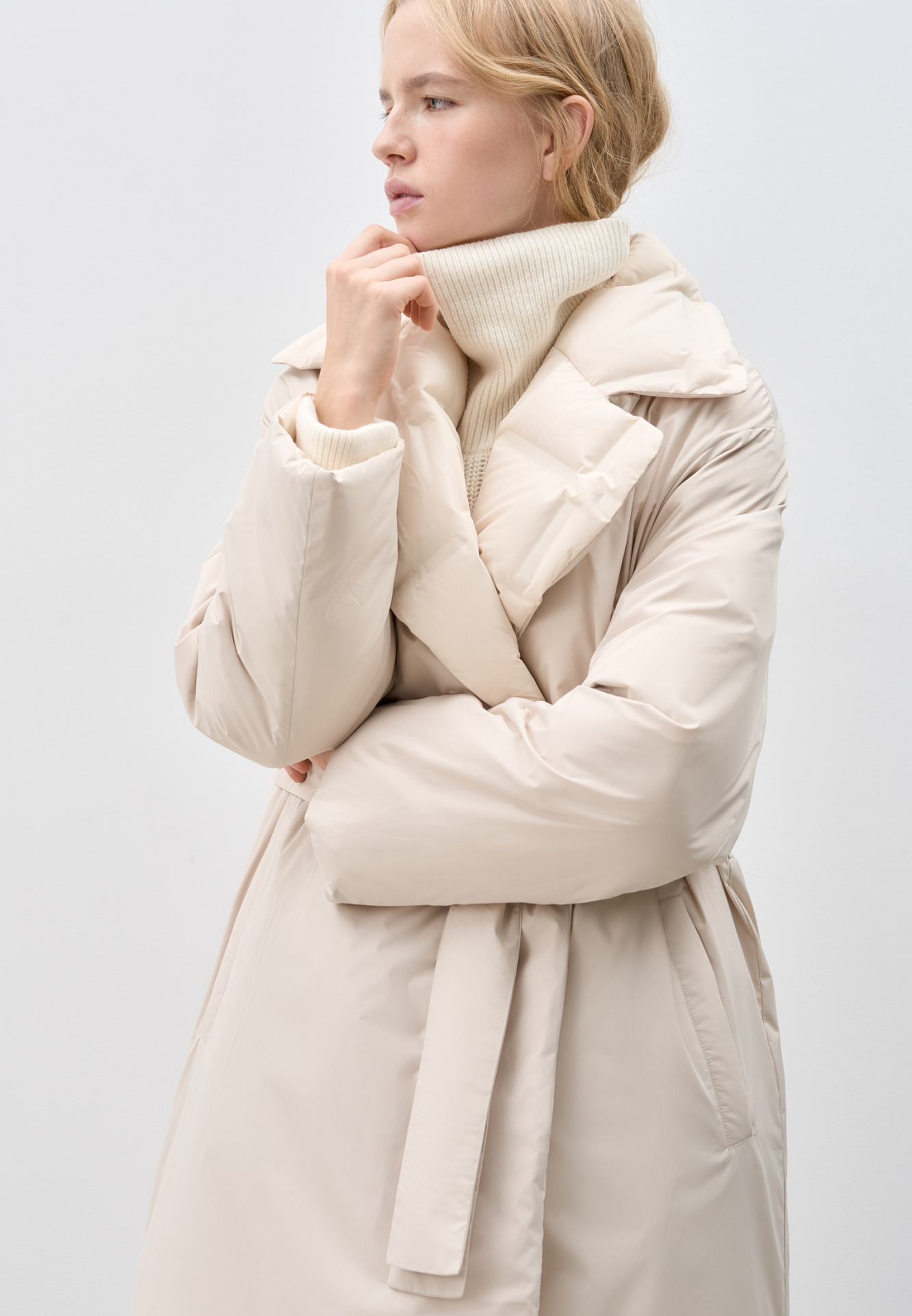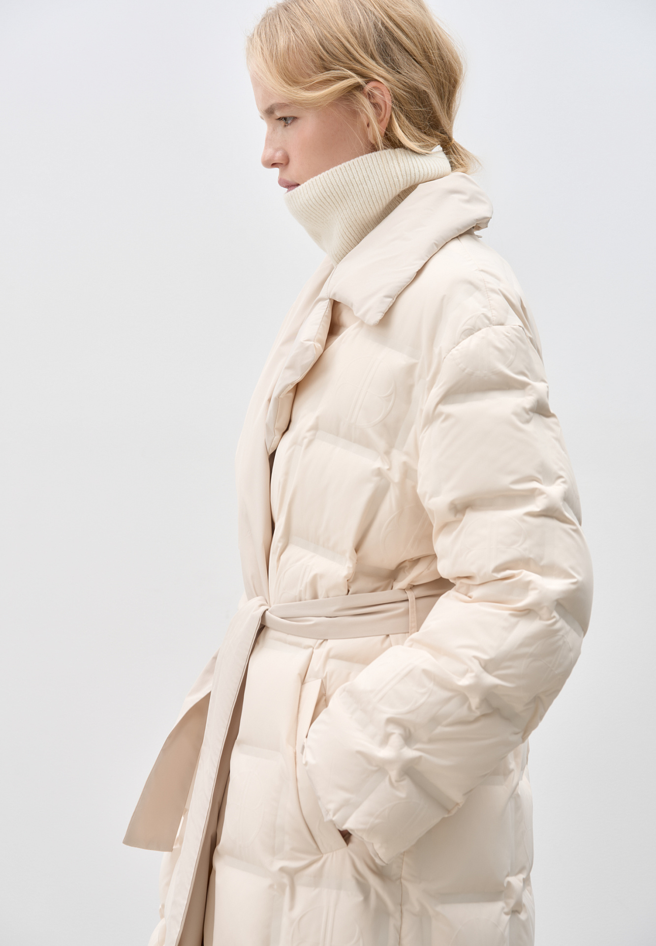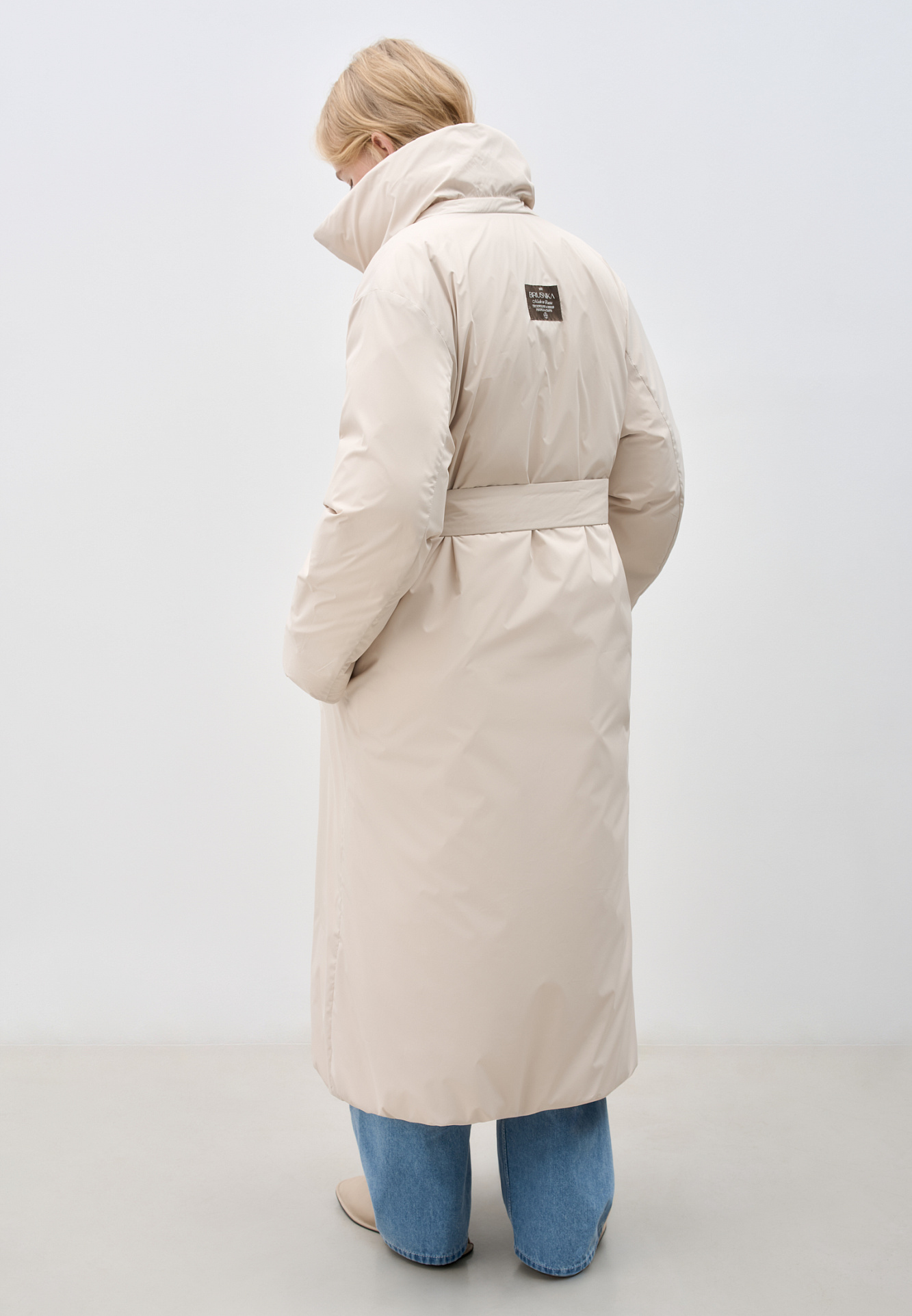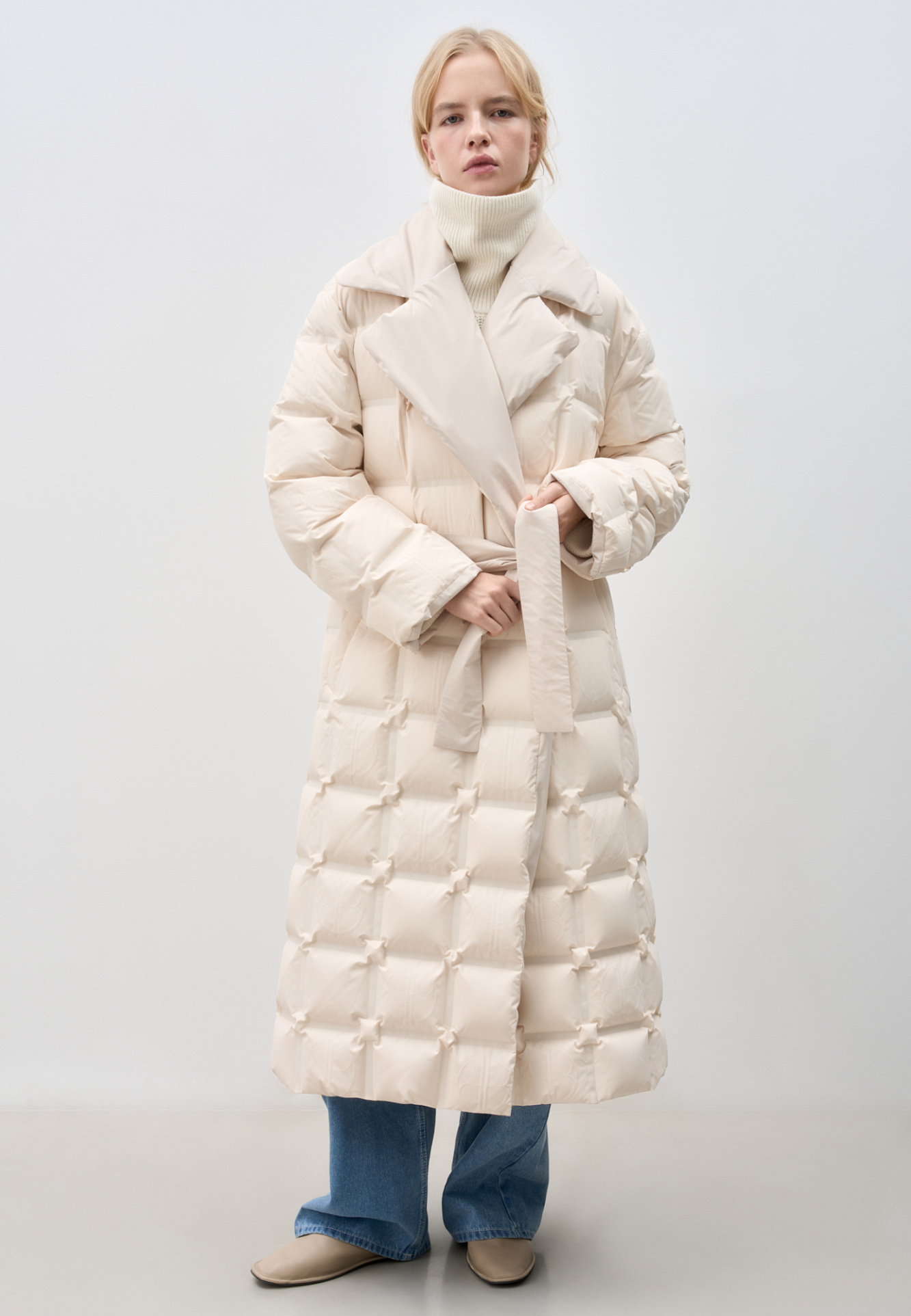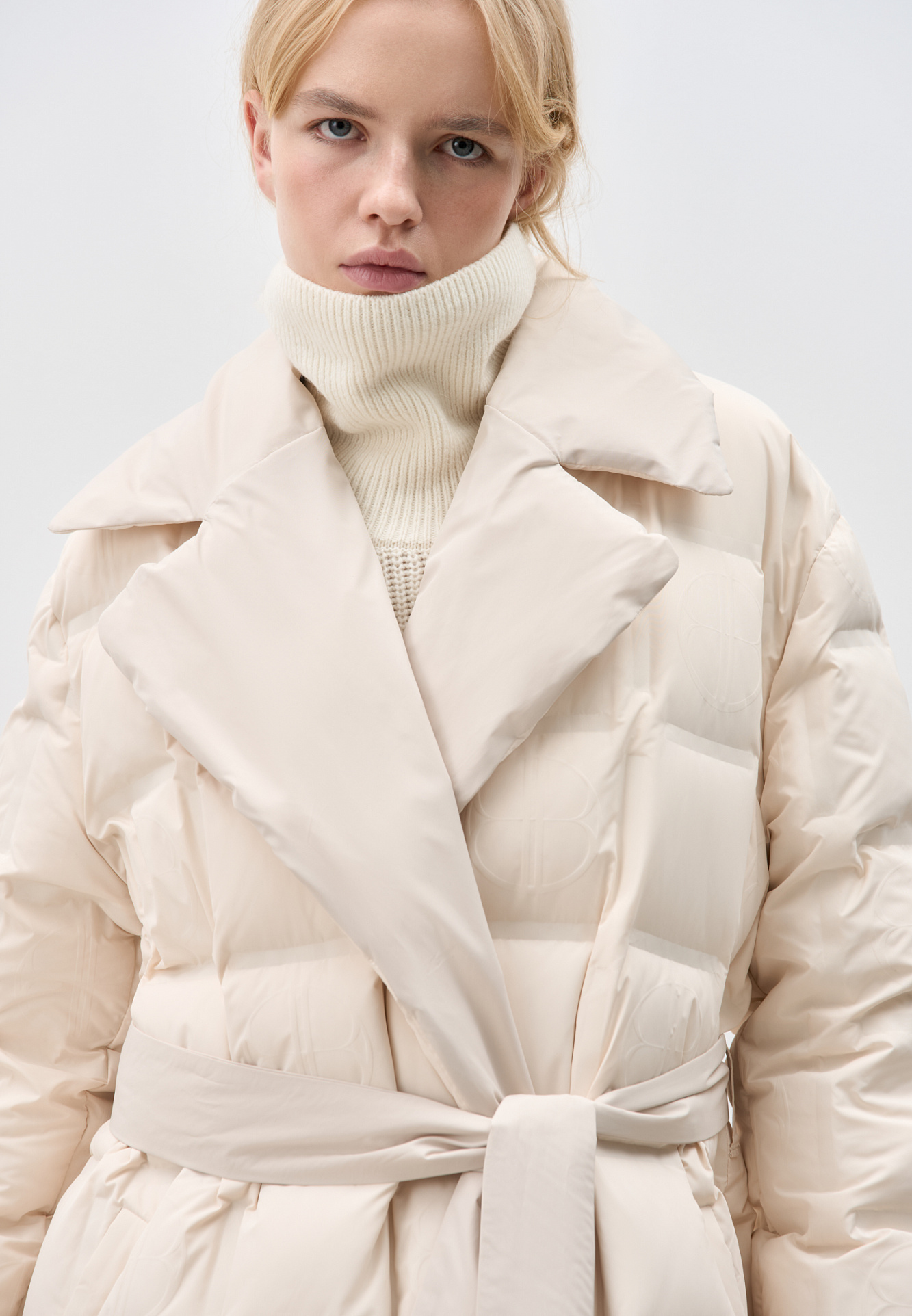 Двустороннее утепленное пальто на запах. Модель прямого кроя, с широкими лацканами и боковыми карманами. Пояс в комплекте. Изделие декорировано геометрической стежкой и брендированным тиснением.
