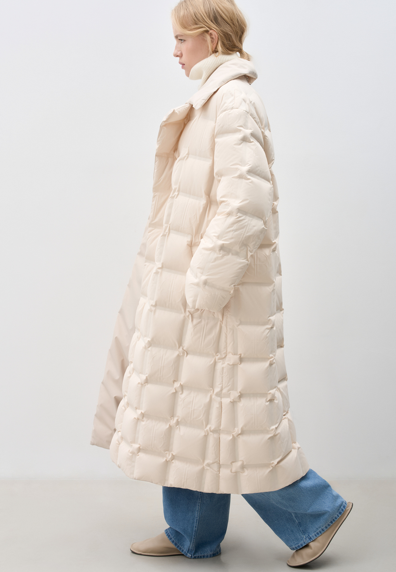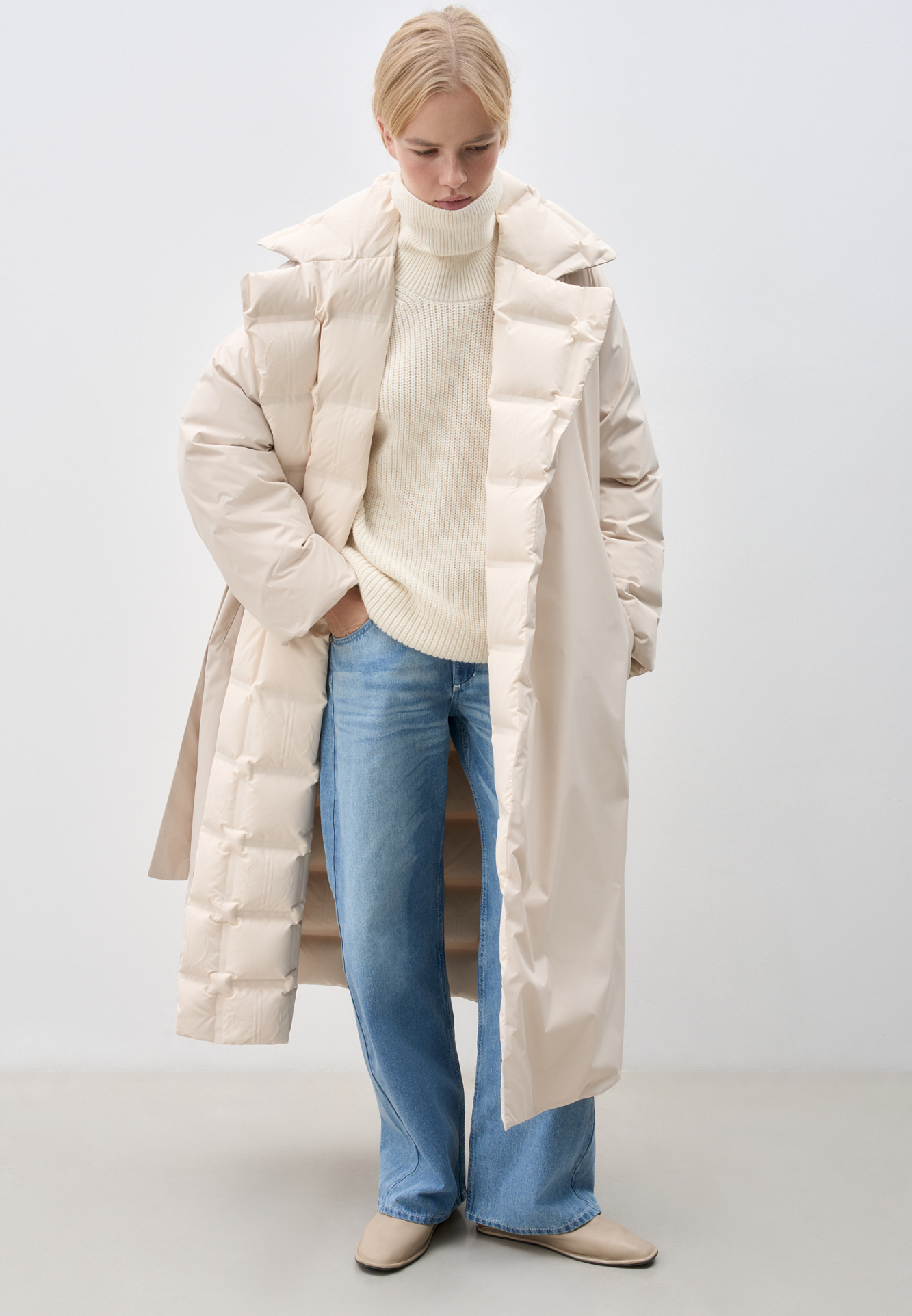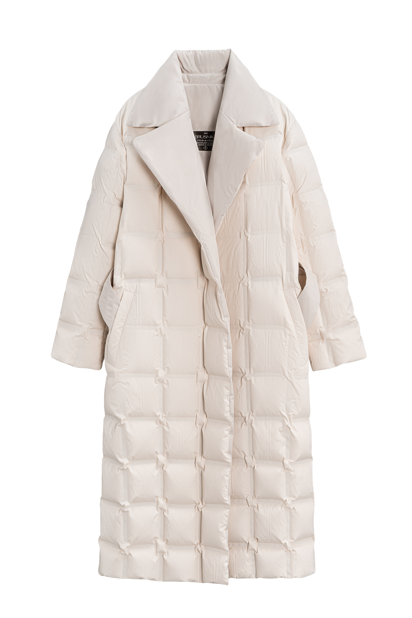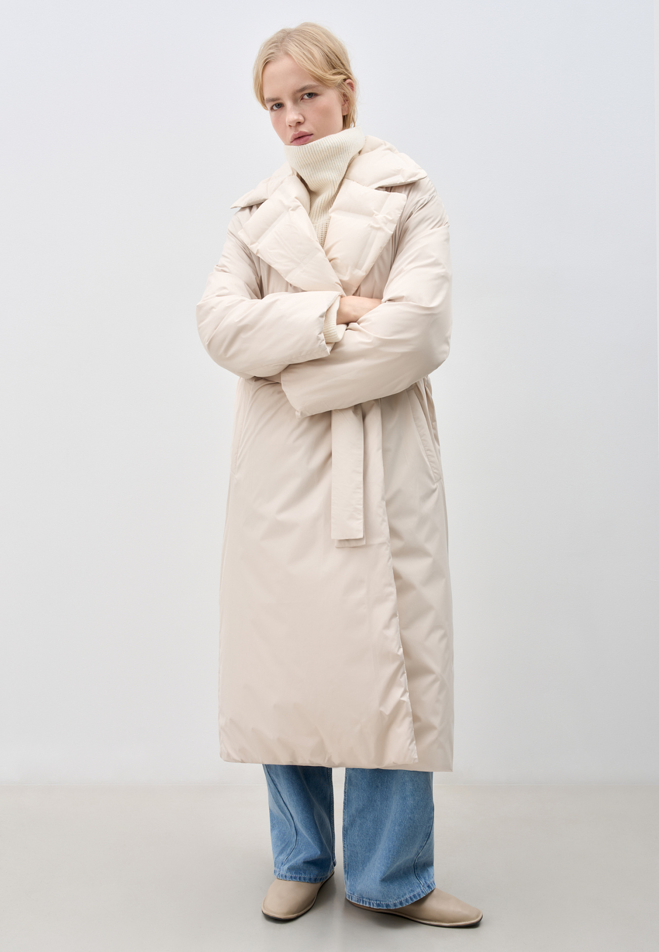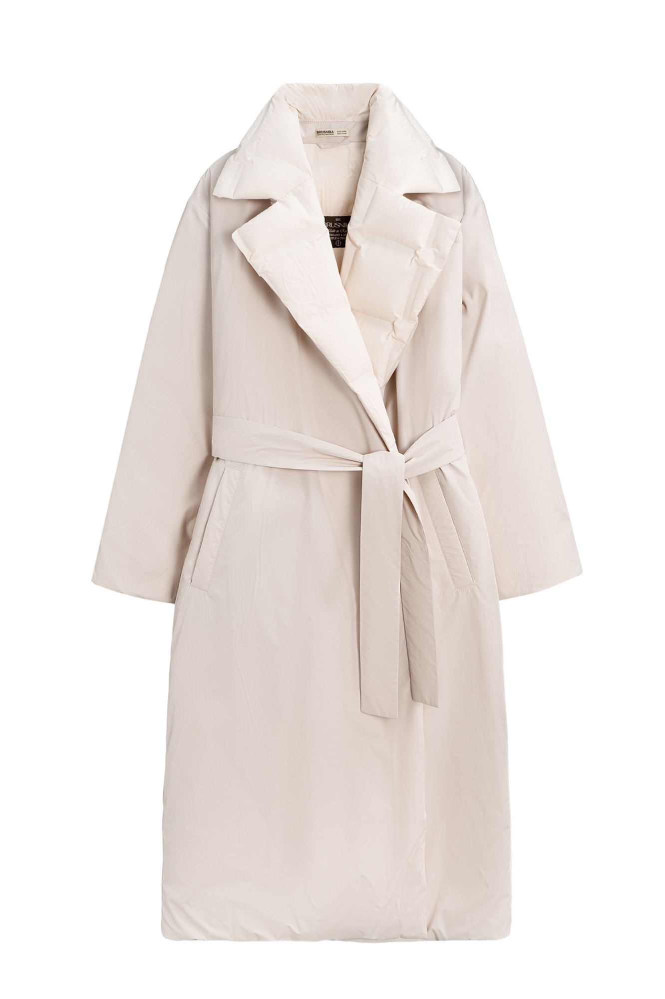 Двустороннее утепленное пальто на запах. Модель прямого кроя, с широкими лацканами и боковыми карманами. Пояс в комплекте. Изделие декорировано геометрической стежкой и брендированным тиснением.