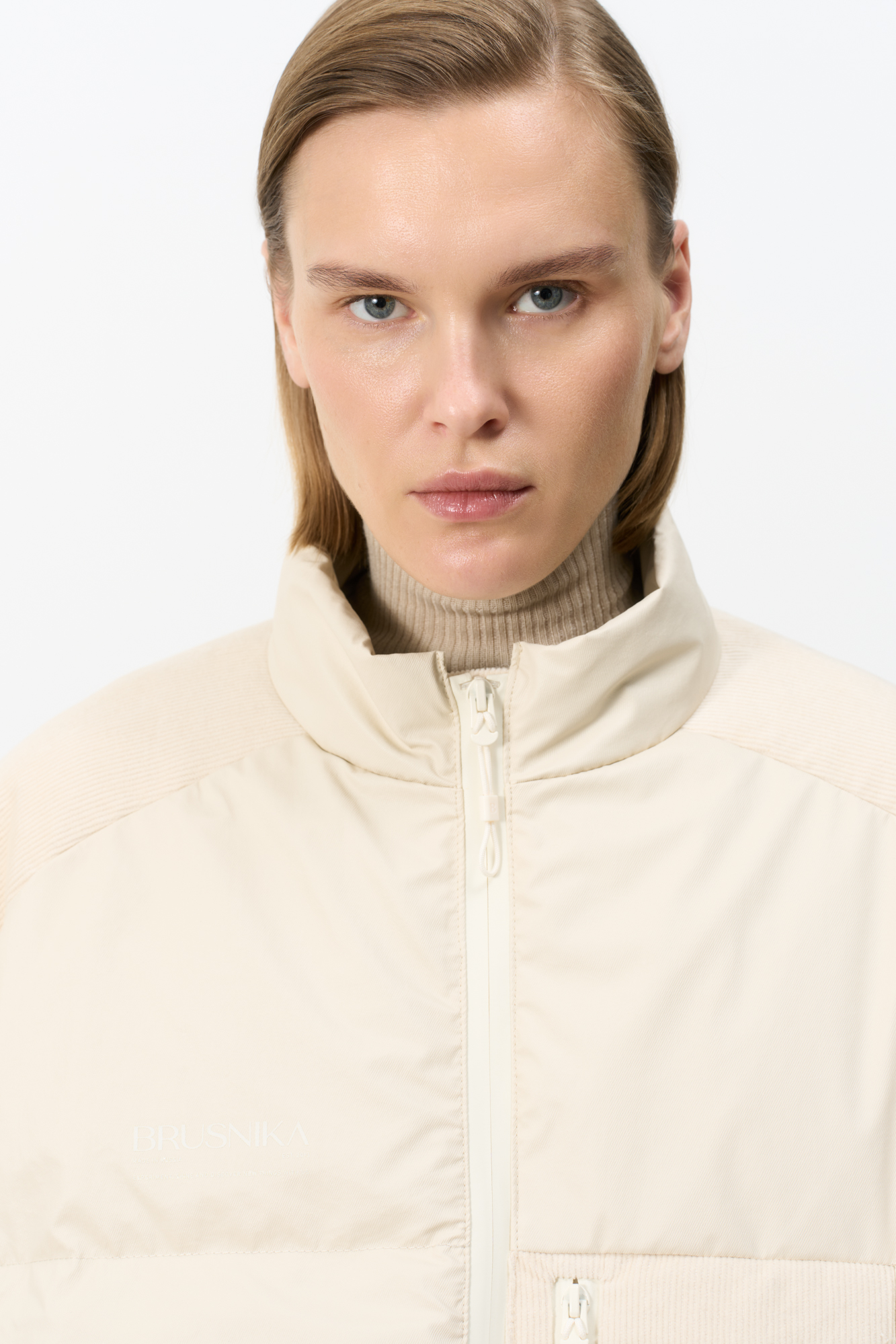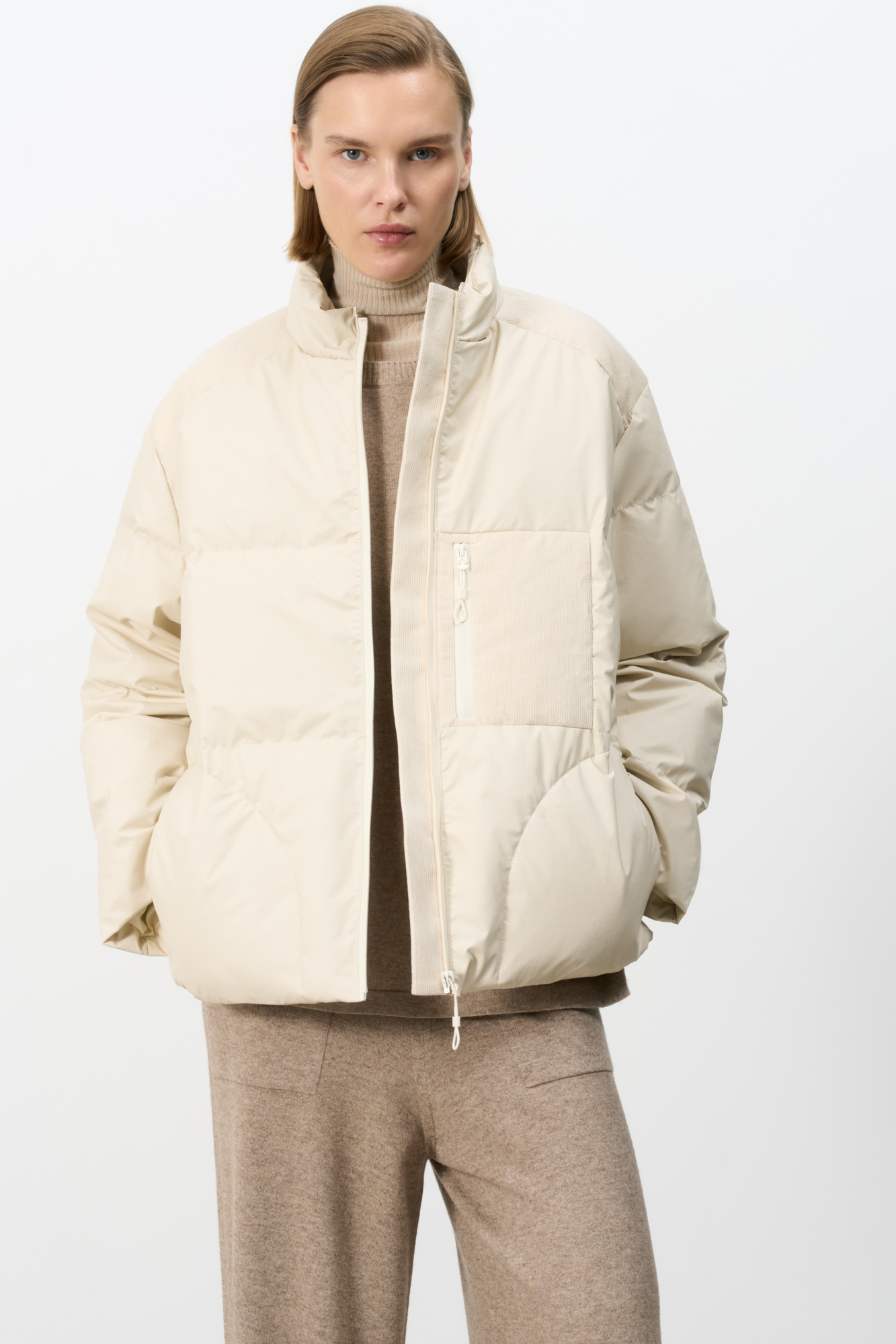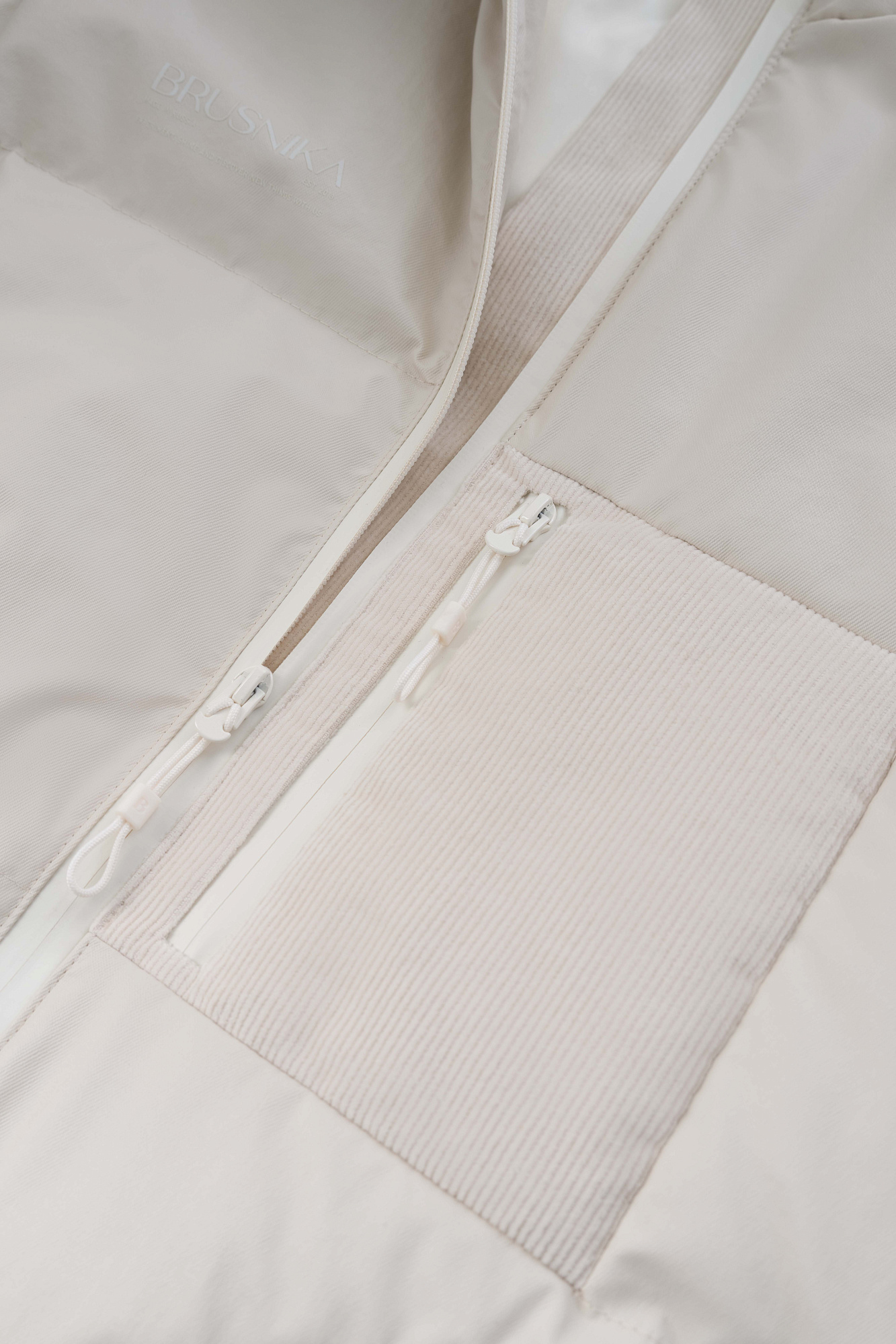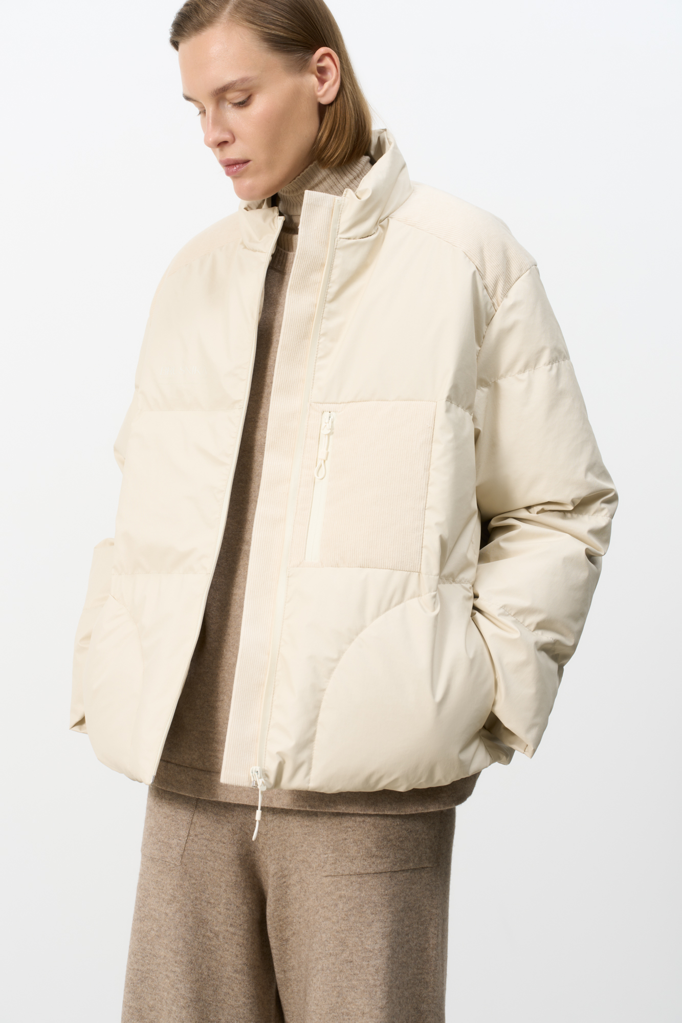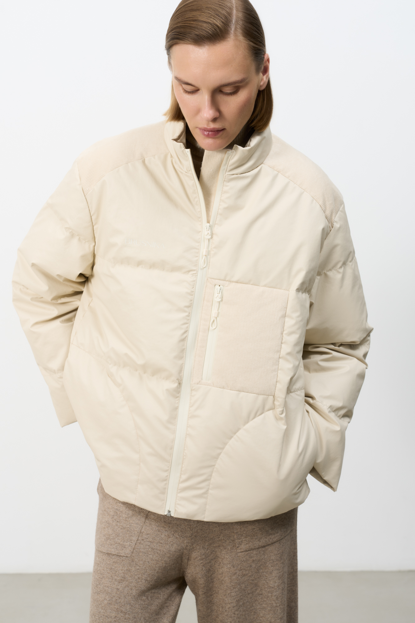 Пуховик свободного силуэта со спущенной линией плеча, карманом на молнии и декоративными элементами из вельвета. Застежка на молнию. На подкладке.