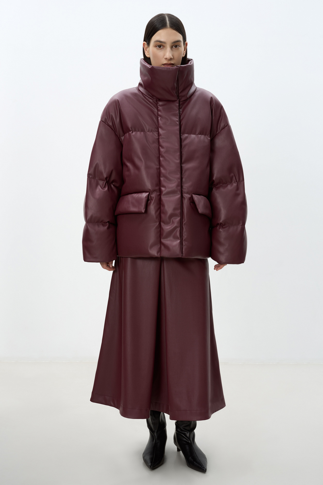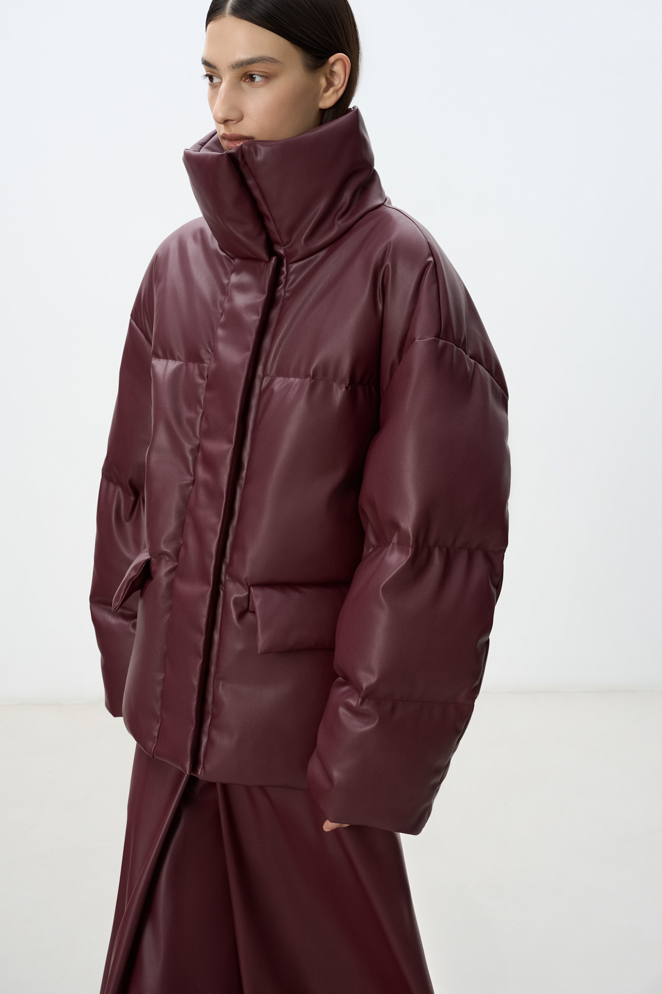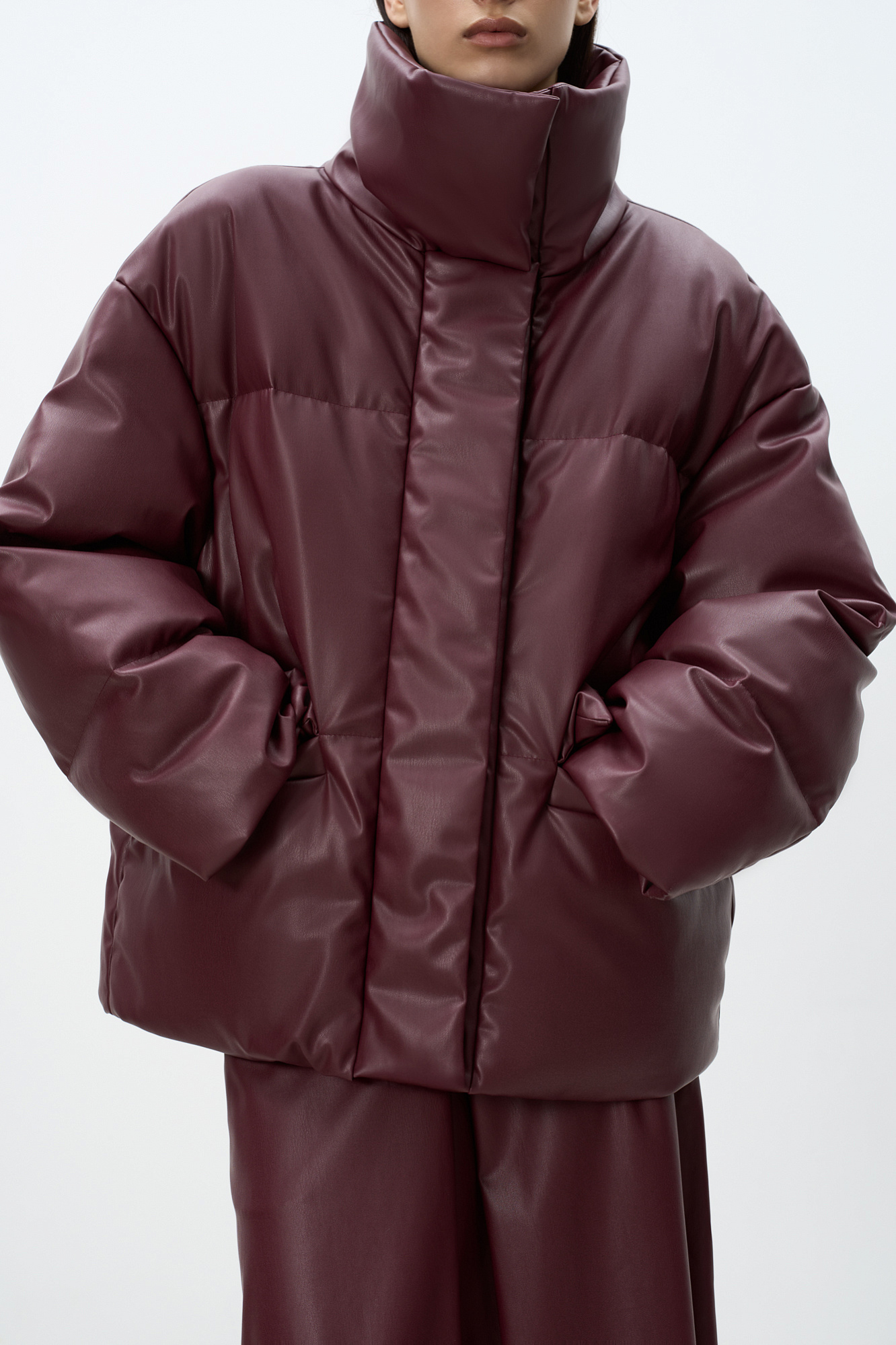 Утепленный пуховик из экокожи. Модель свободного силуэта с боковыми карманами и воротником-стойкой. Застежка на потайную молнию и магнитные пуговицы. На подкладке.