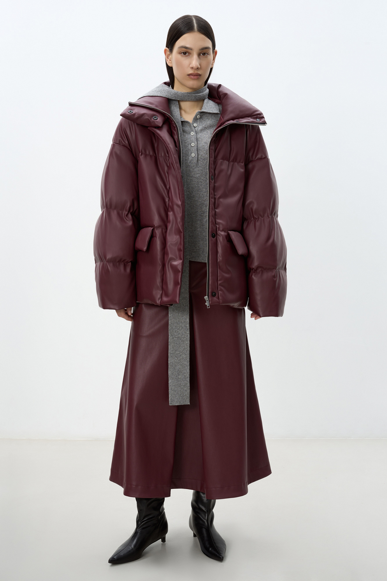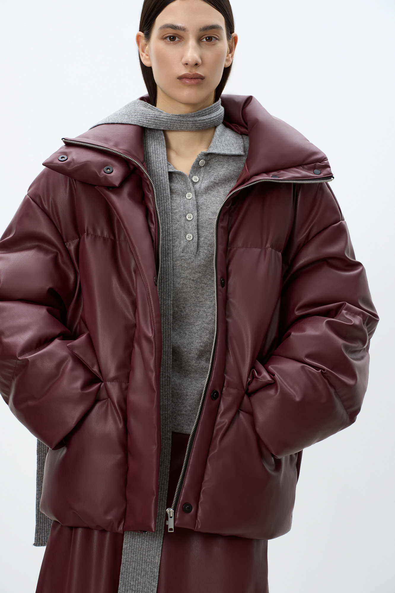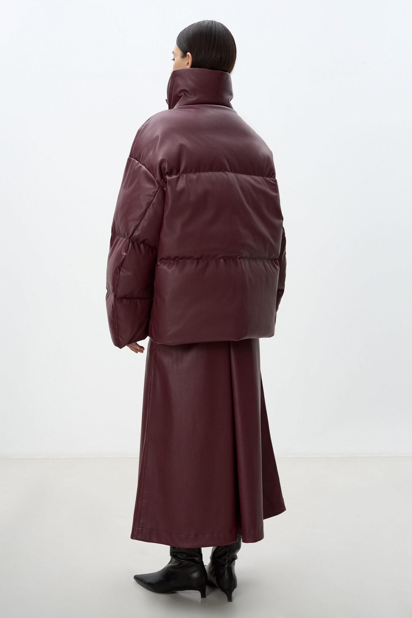 Утепленный пуховик из экокожи. Модель свободного силуэта с боковыми карманами и воротником-стойкой. Застежка на потайную молнию и магнитные пуговицы. На подкладке.