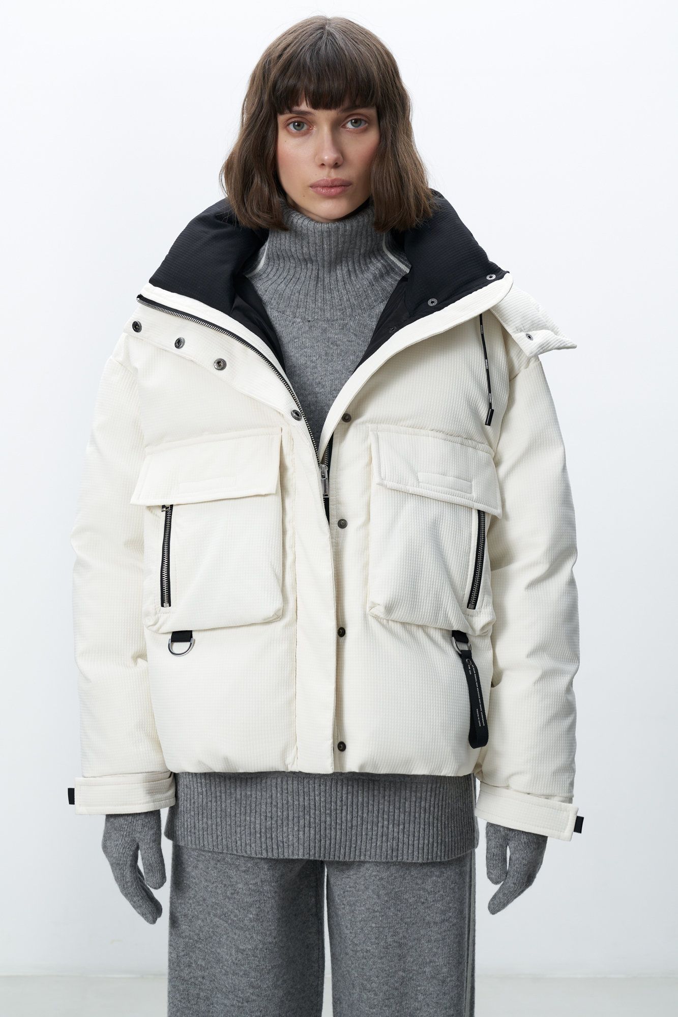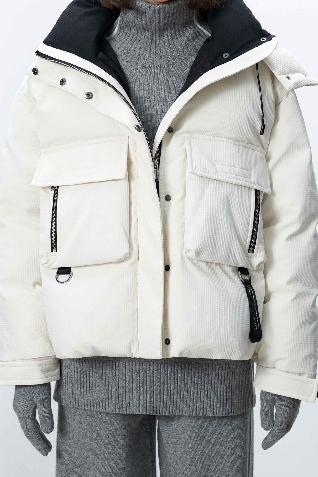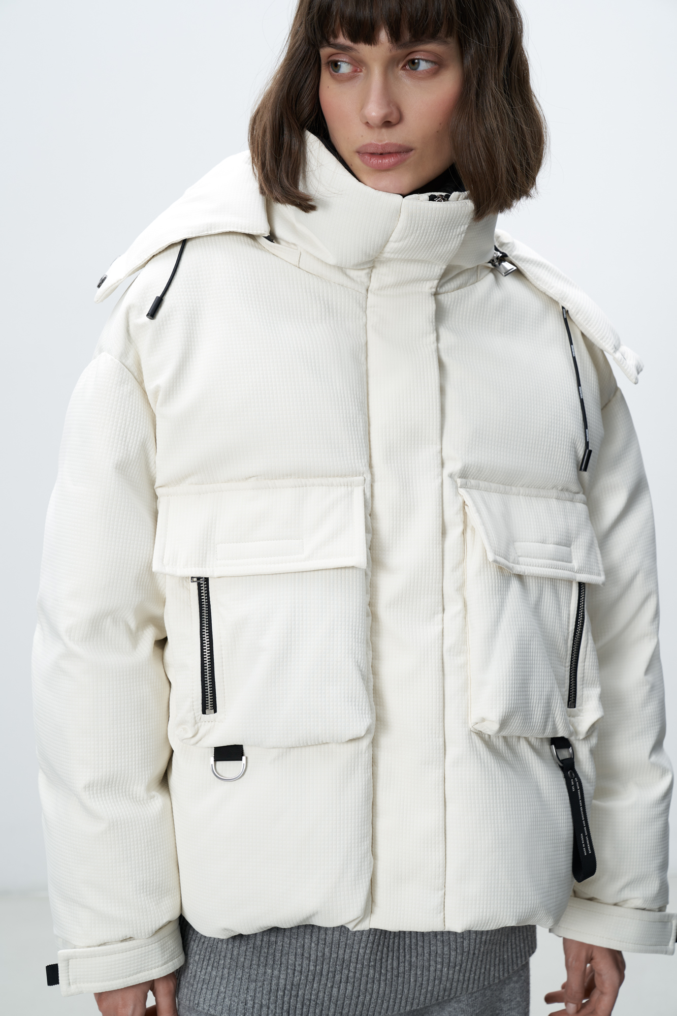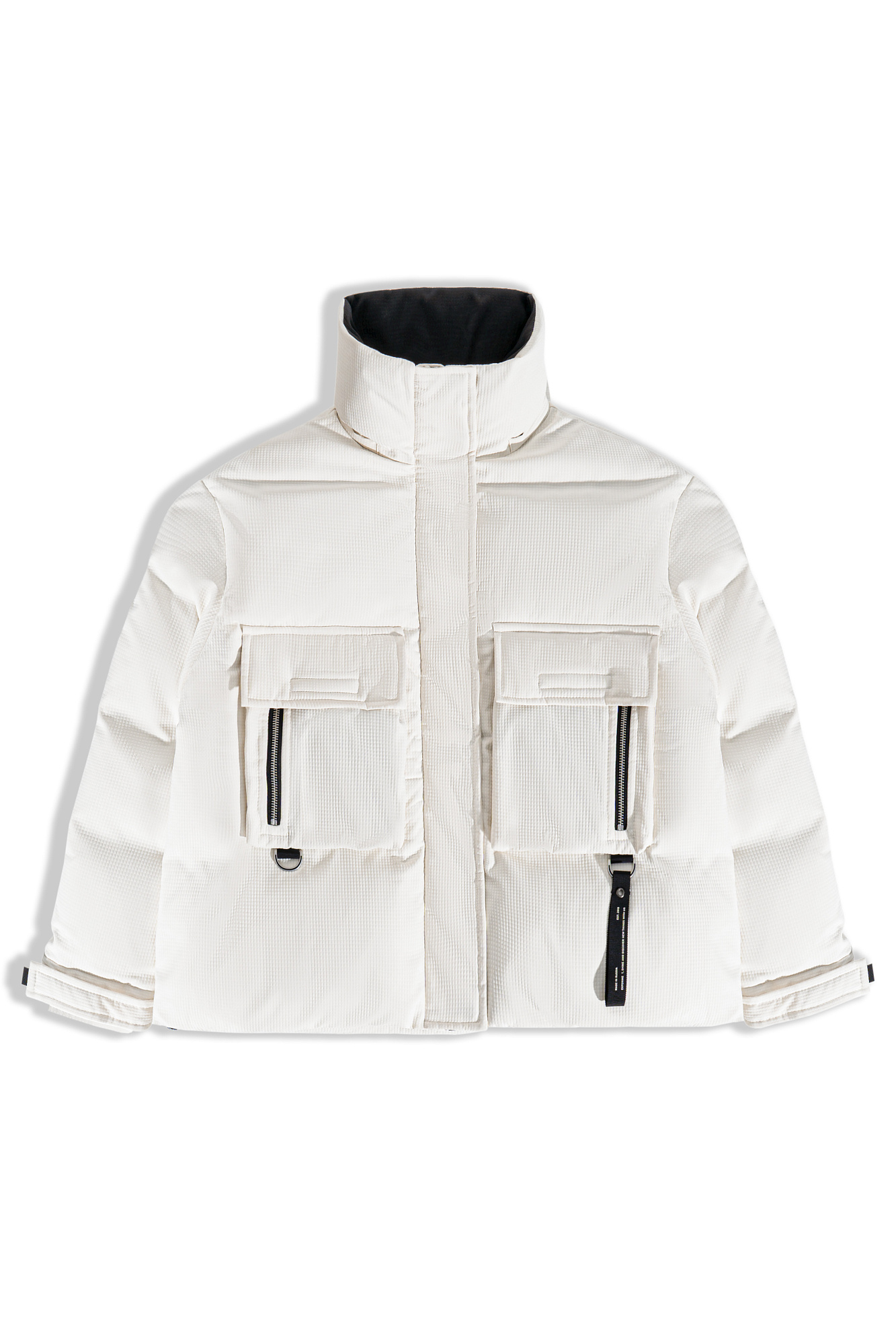 Пуховик с двумя нагрудными накладными карманами, воротником-стойкой и капюшоном. Застежка на молнию под планкой. Манжеты рукавов фиксируются липучкой. Низ изделия выполнен на регулируемой кулиске.