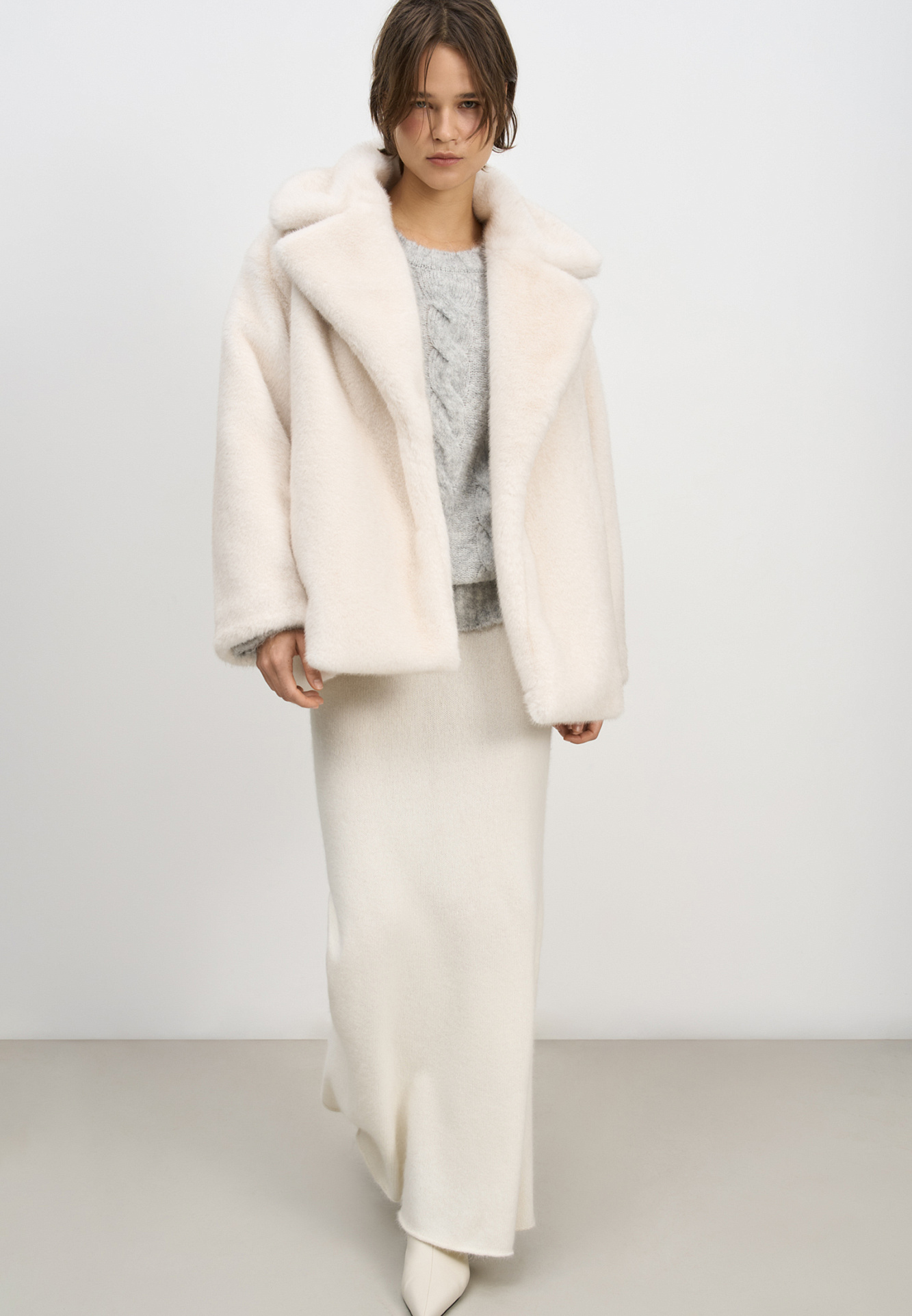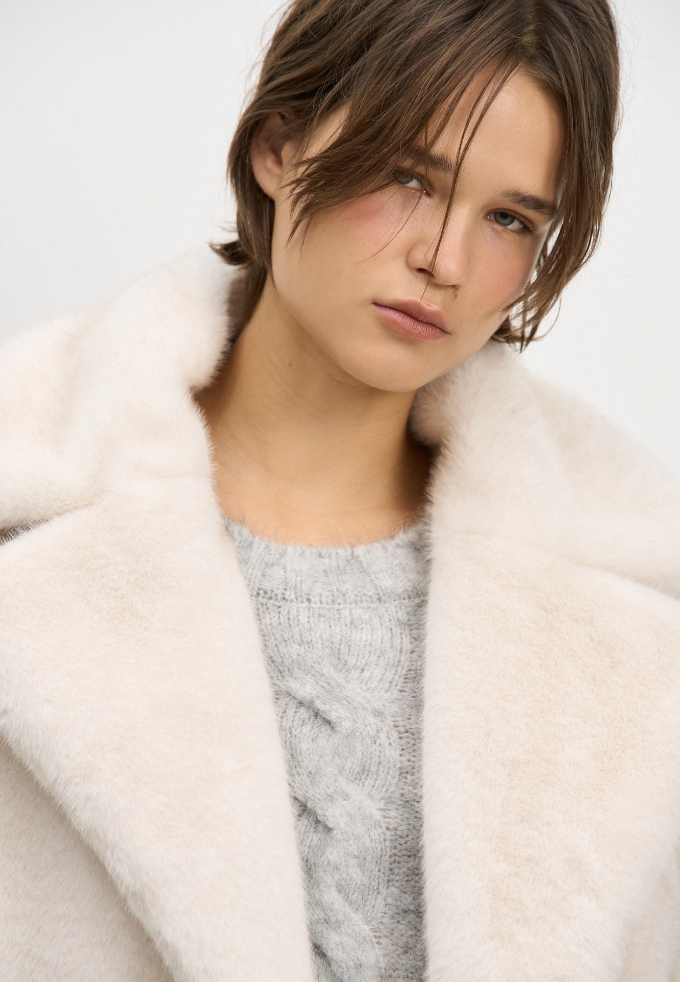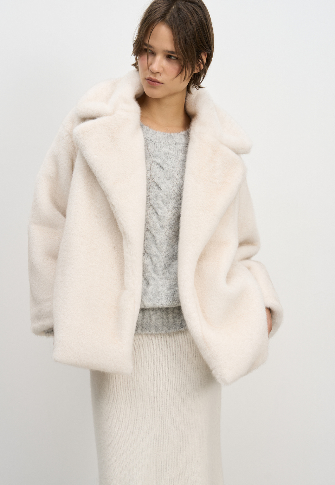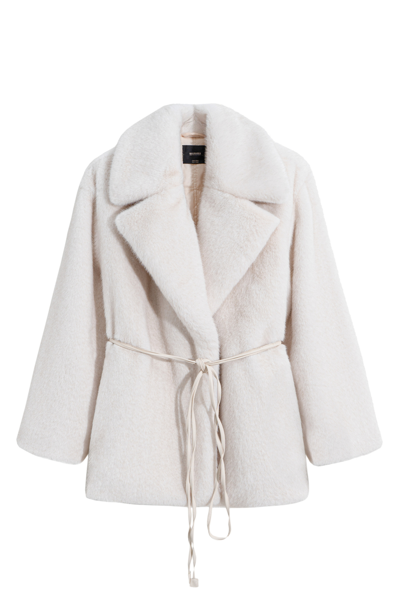 Шуба из экомеха на синтепоне. Модель с широким отложным воротником, шлевками для пояса из экокожи и врезными карманами. Изделие выполнено на подкладке.