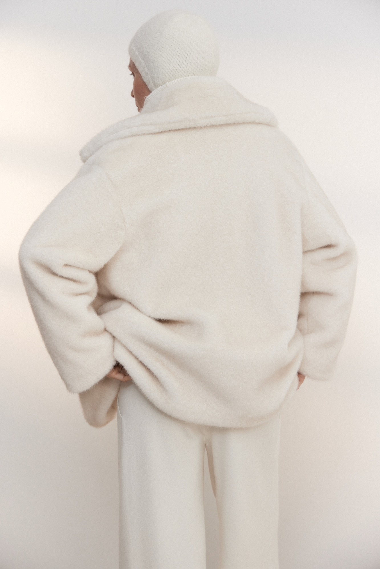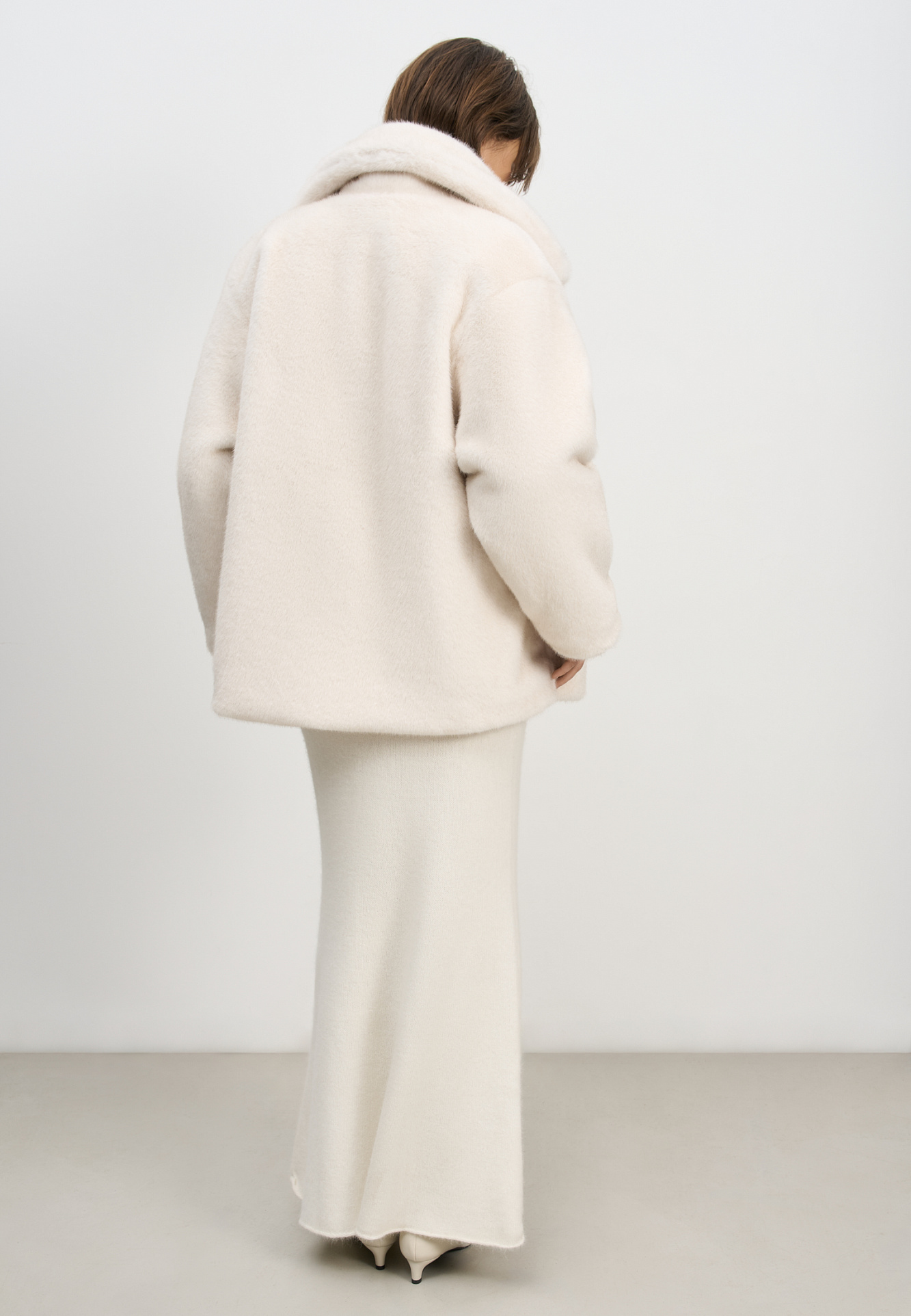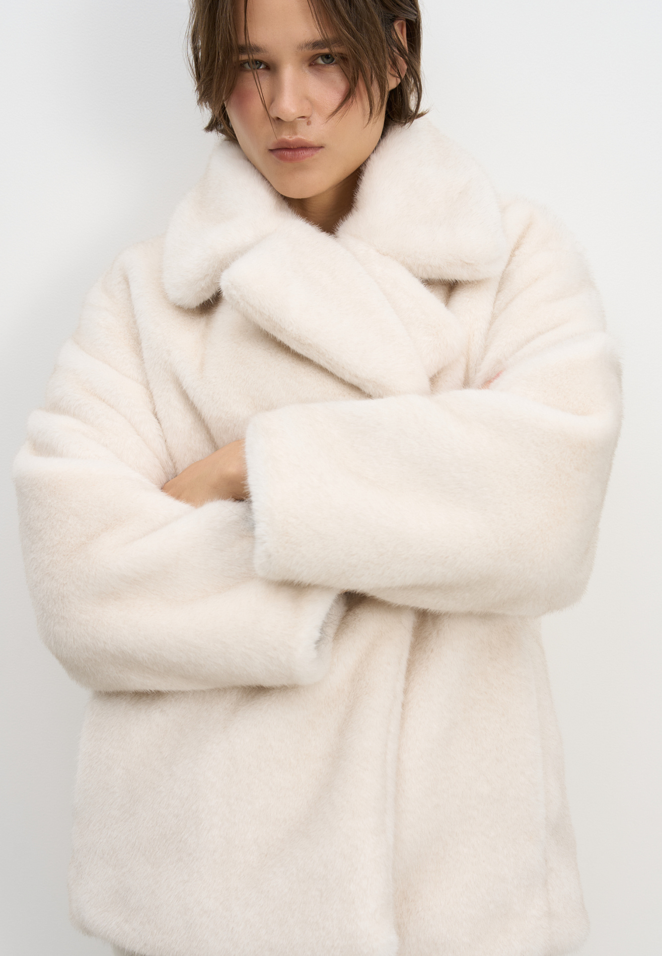 Шуба из экомеха на синтепоне. Модель с широким отложным воротником, шлевками для пояса из экокожи и врезными карманами. Изделие выполнено на подкладке.