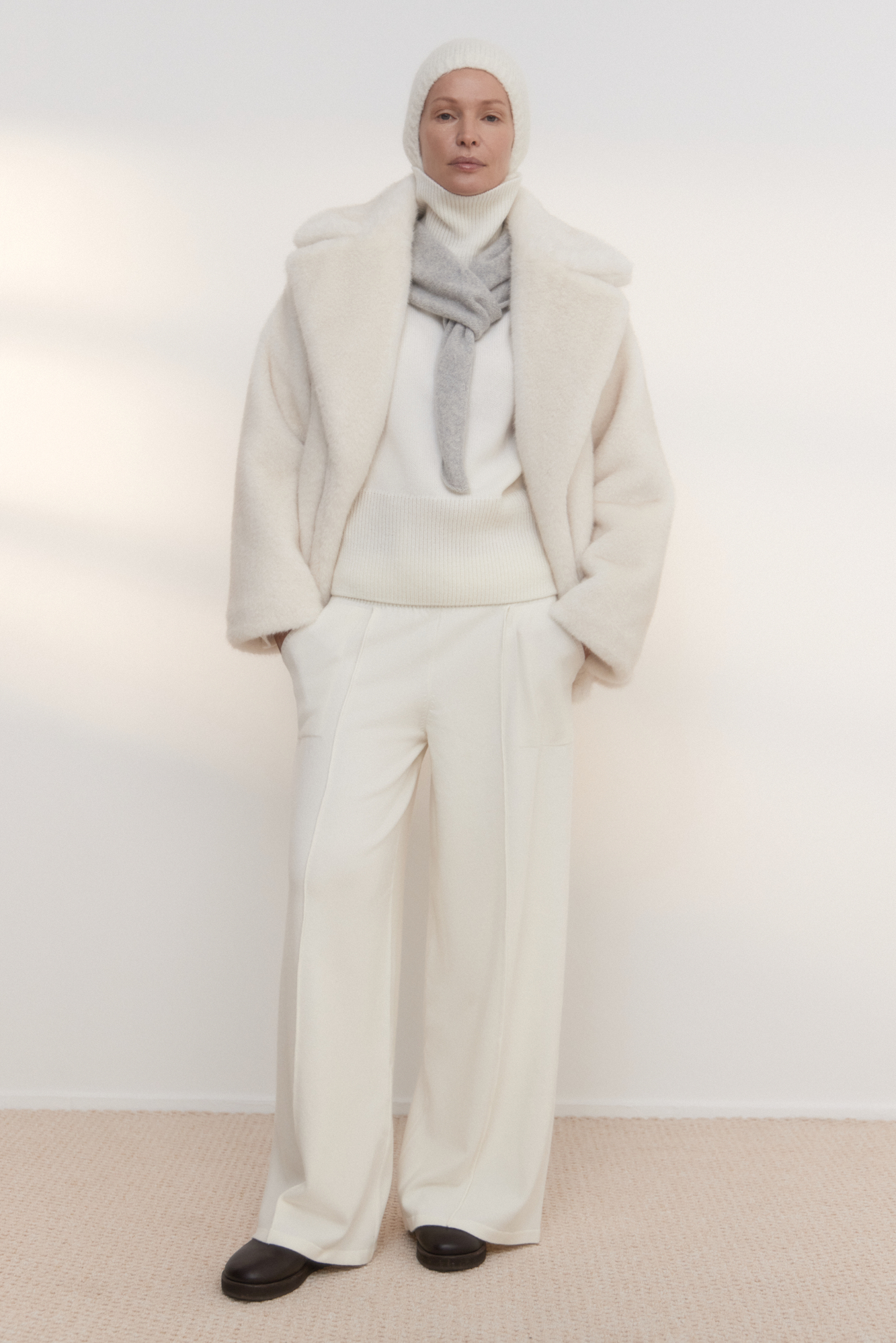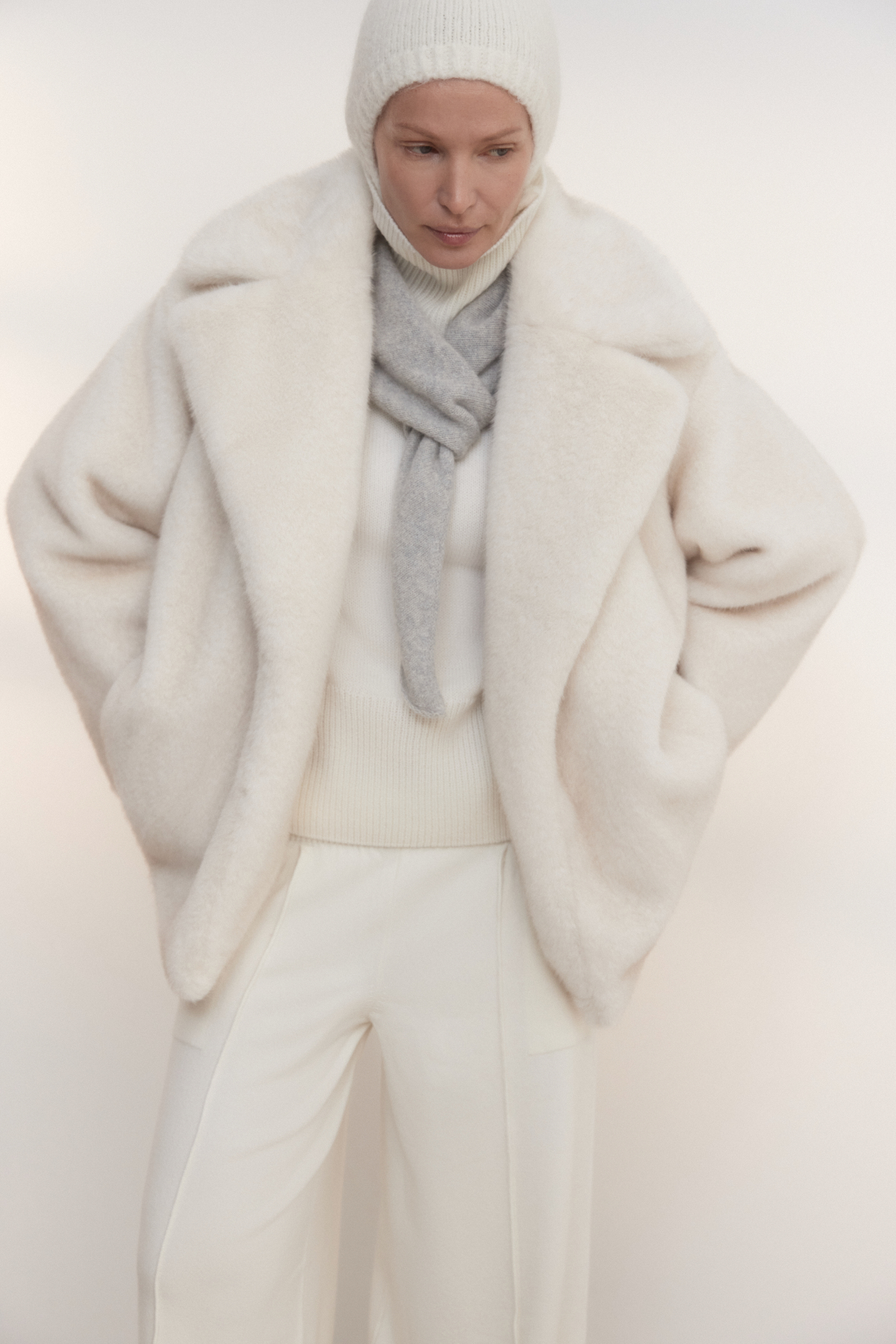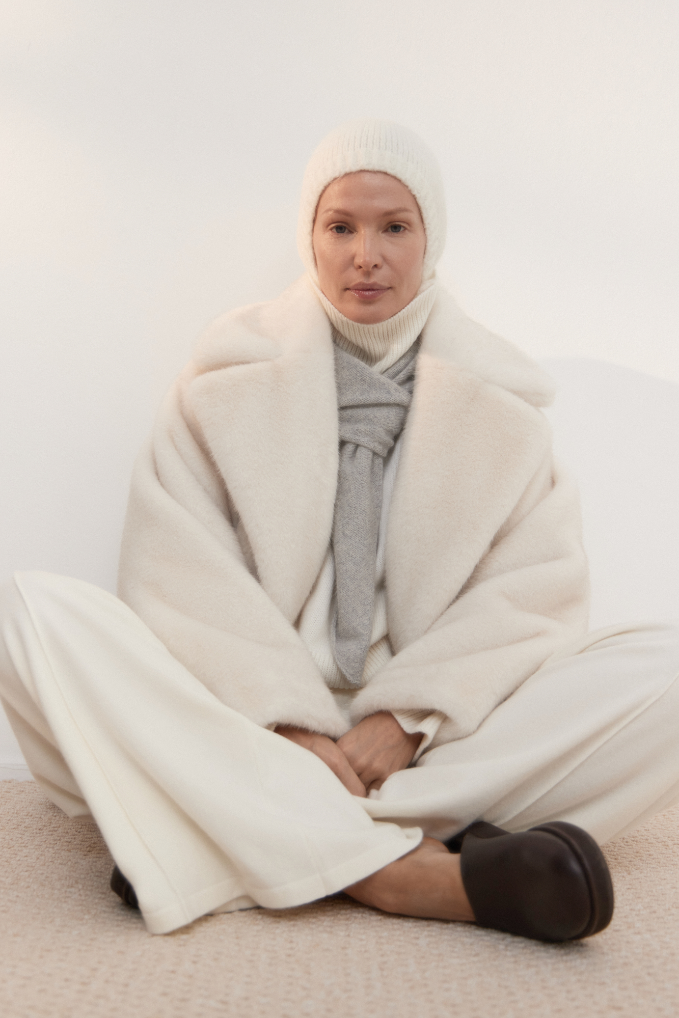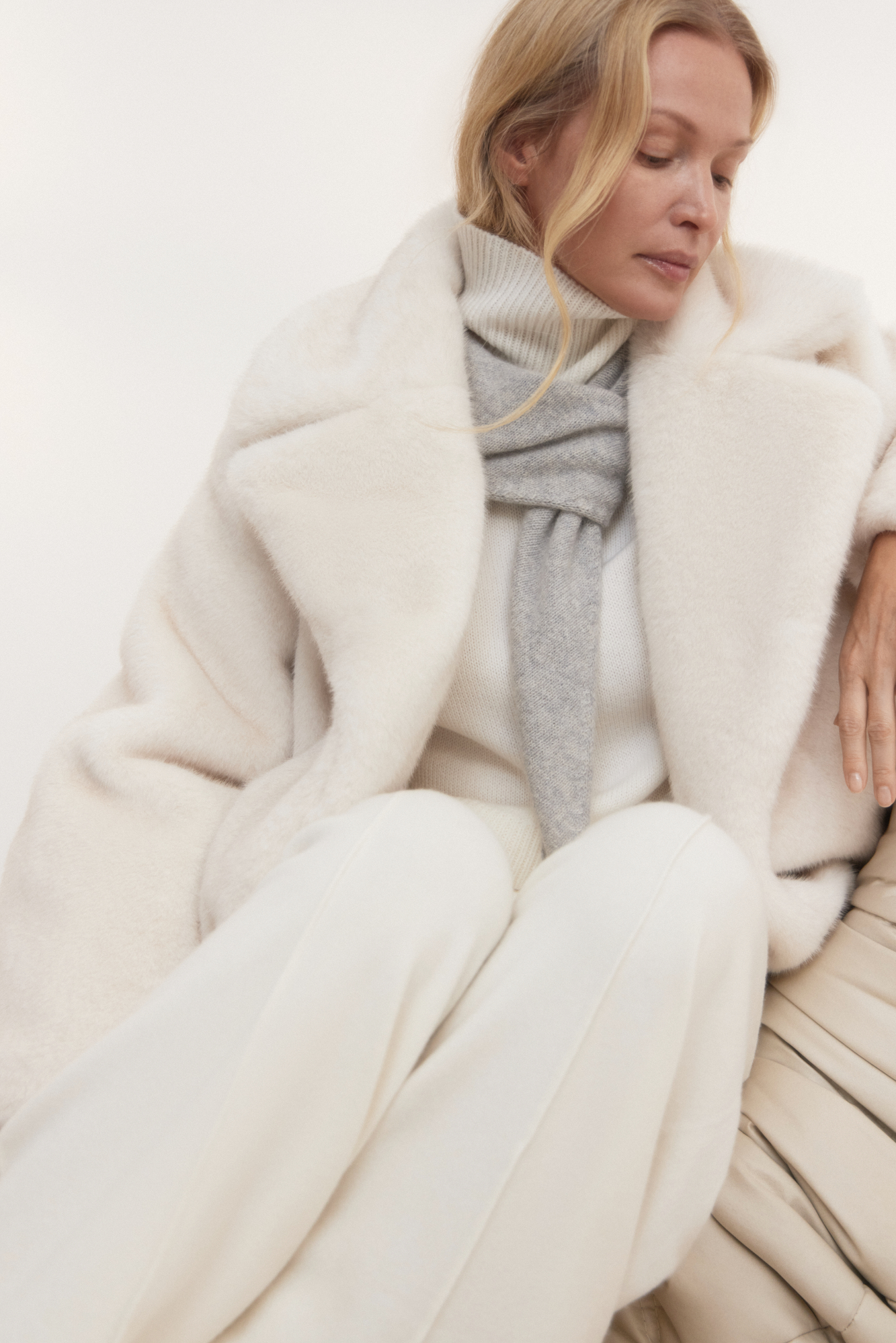 Шуба из экомеха на синтепоне. Модель с широким отложным воротником, шлевками для пояса из экокожи и врезными карманами. Изделие выполнено на подкладке.