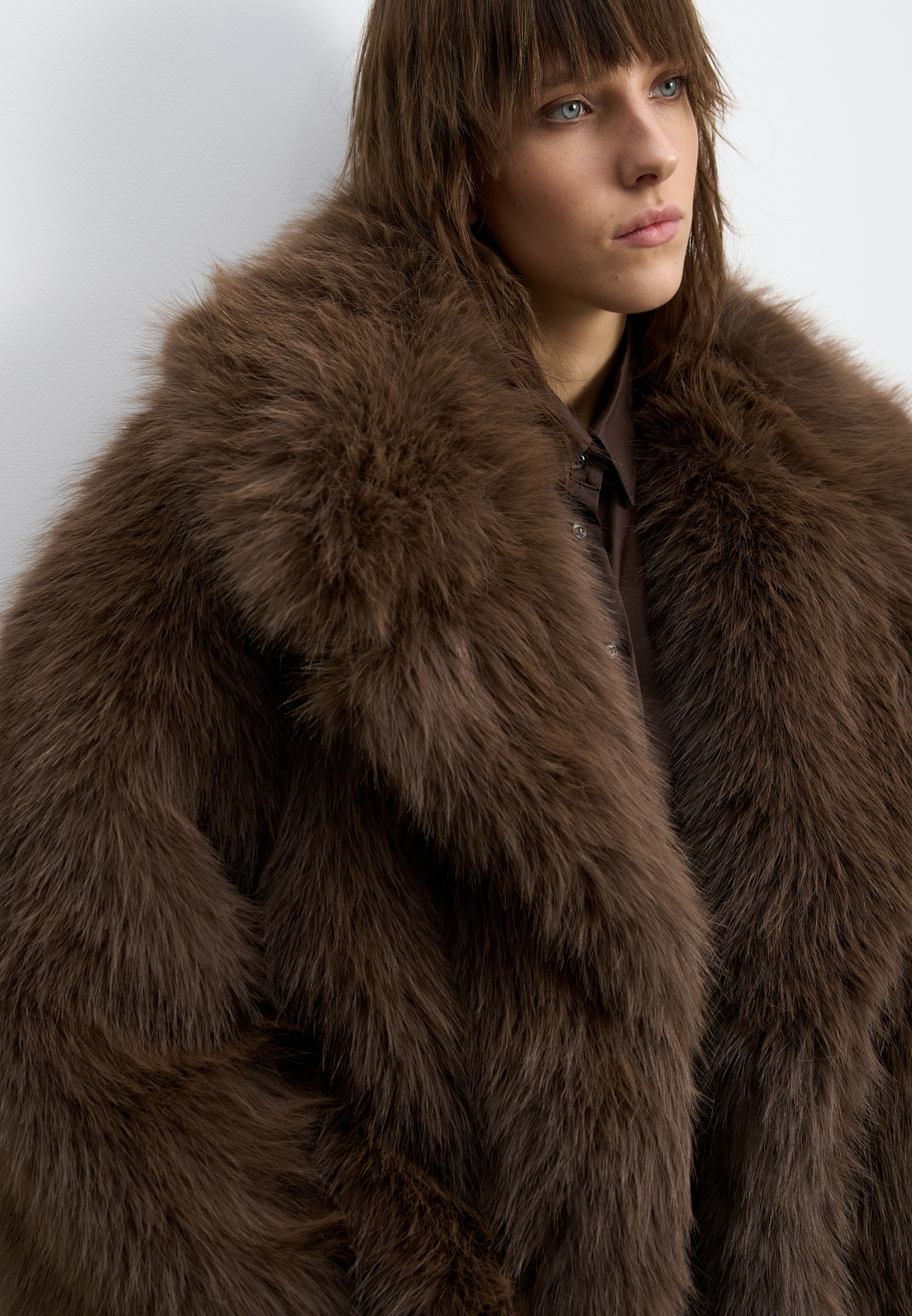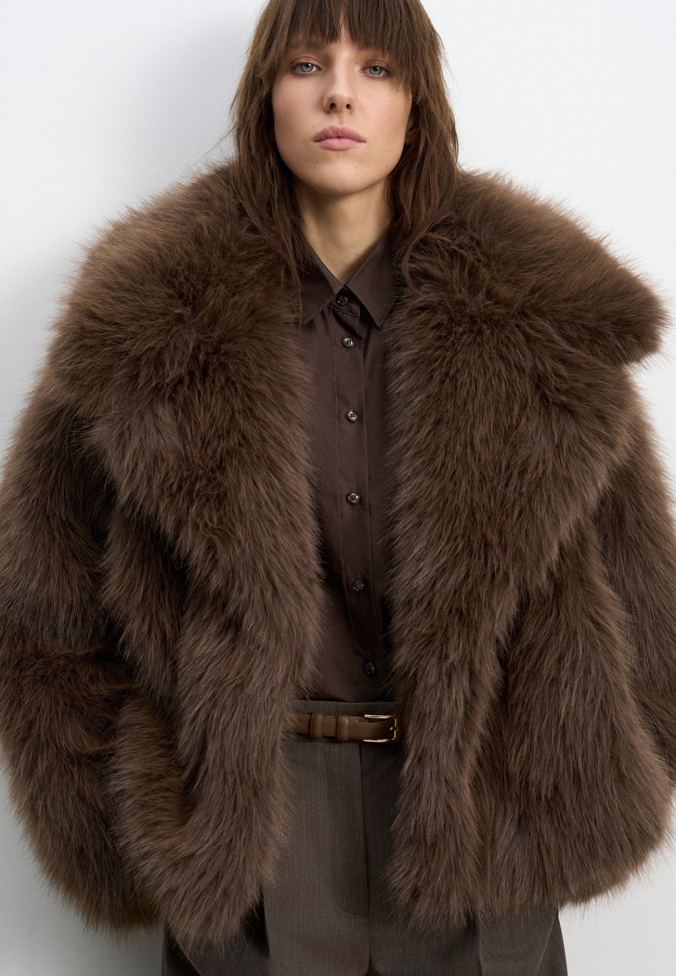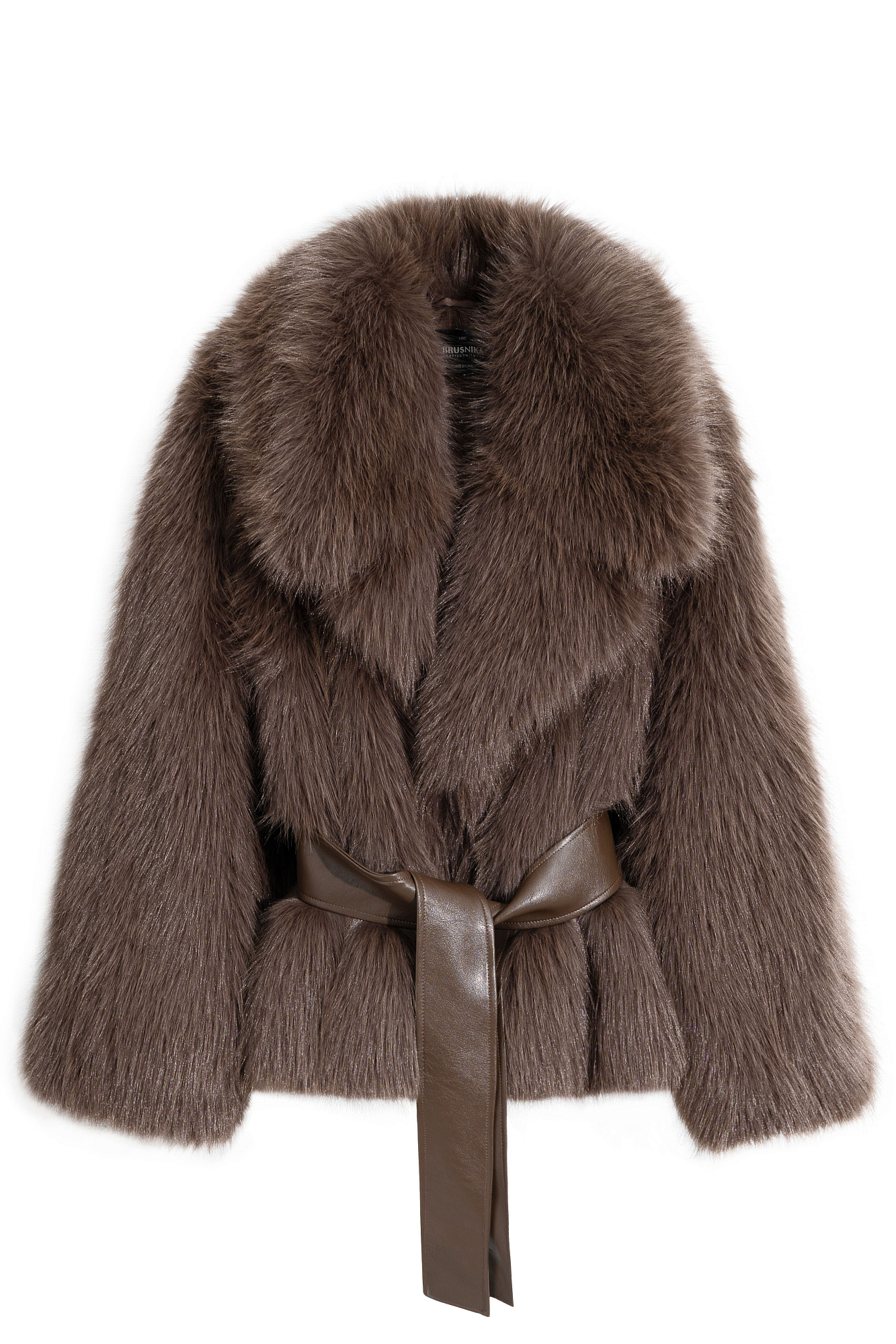 Шуба из экомеха на запах. Модель с широким отложным воротником, шлевками для пояса из экокожи и врезными карманами. Изделие выполнено на подкладке.