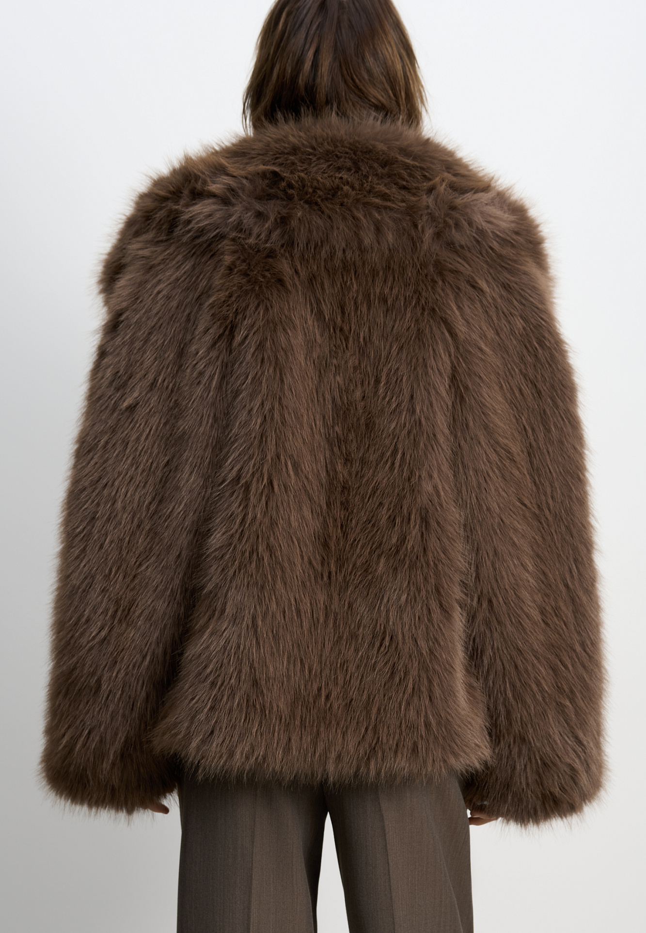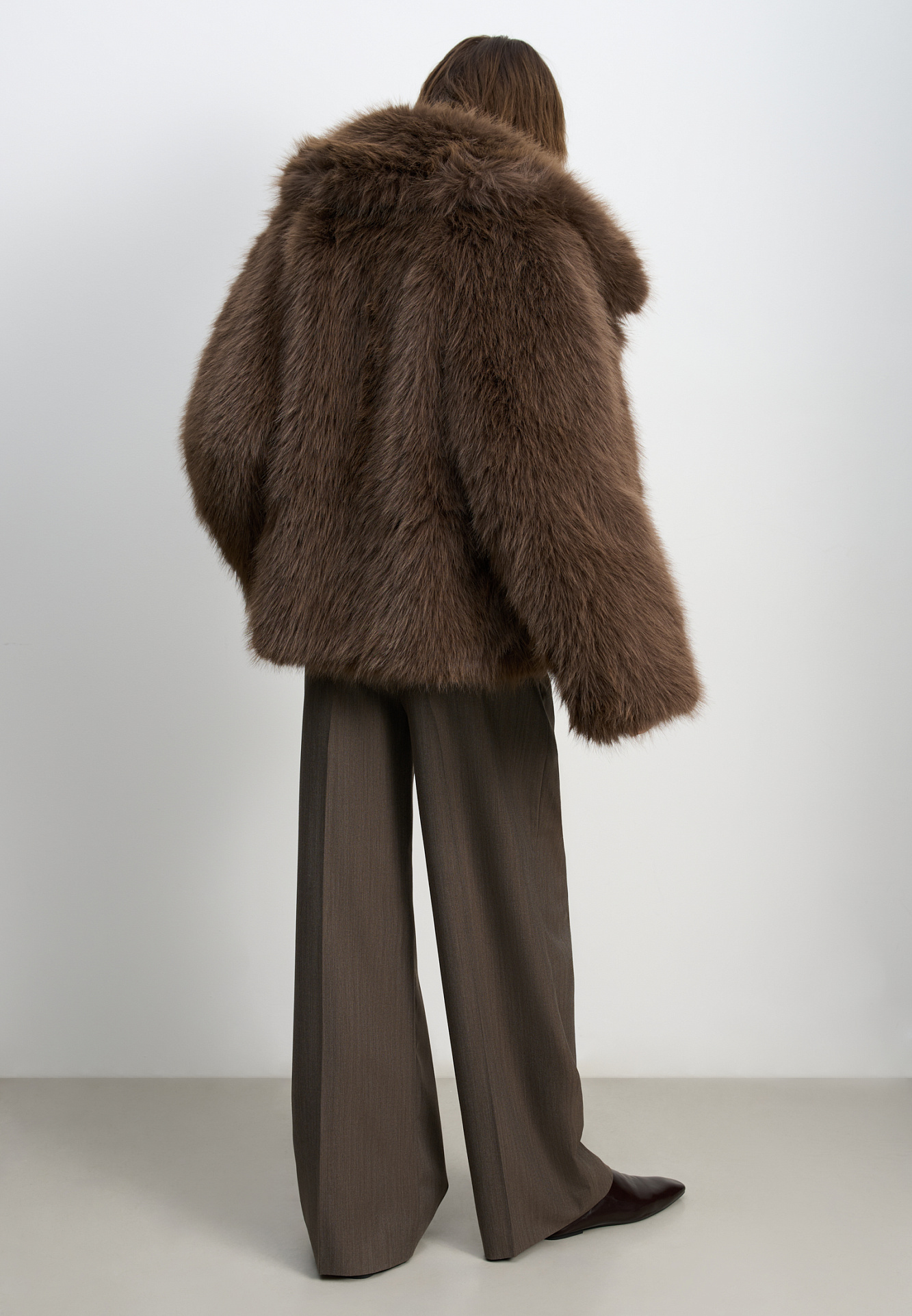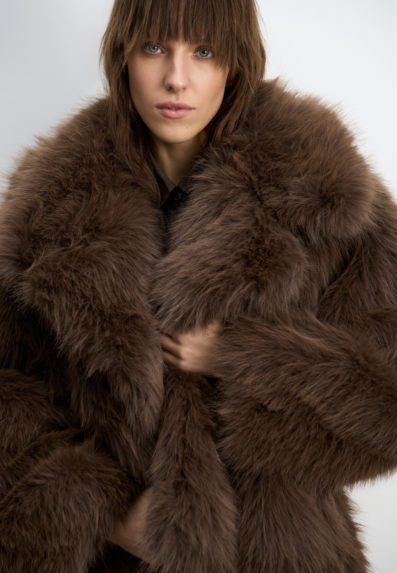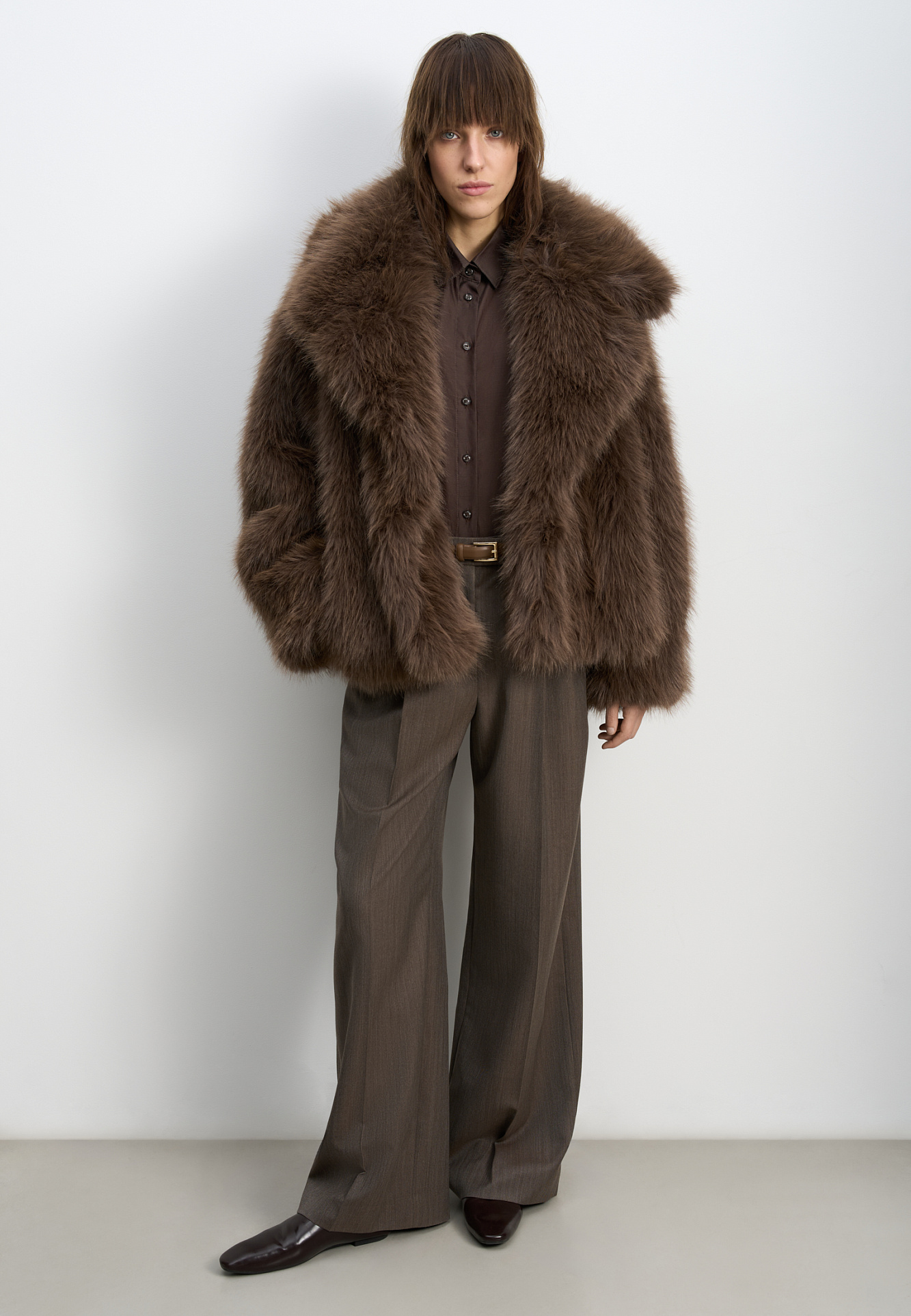 Шуба из экомеха на запах. Модель с широким отложным воротником, шлевками для пояса из экокожи и врезными карманами. Изделие выполнено на подкладке.