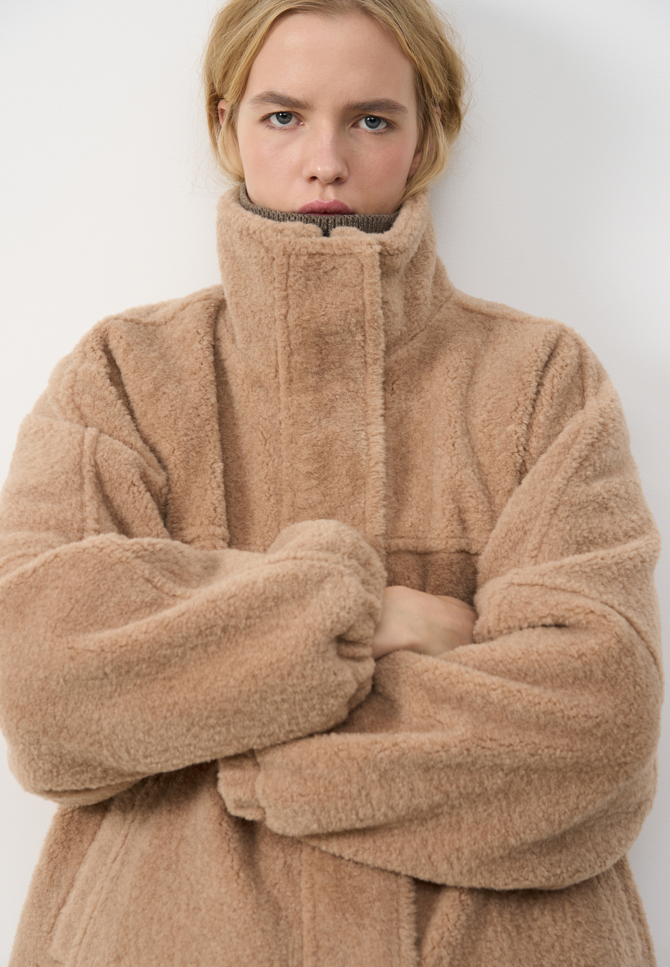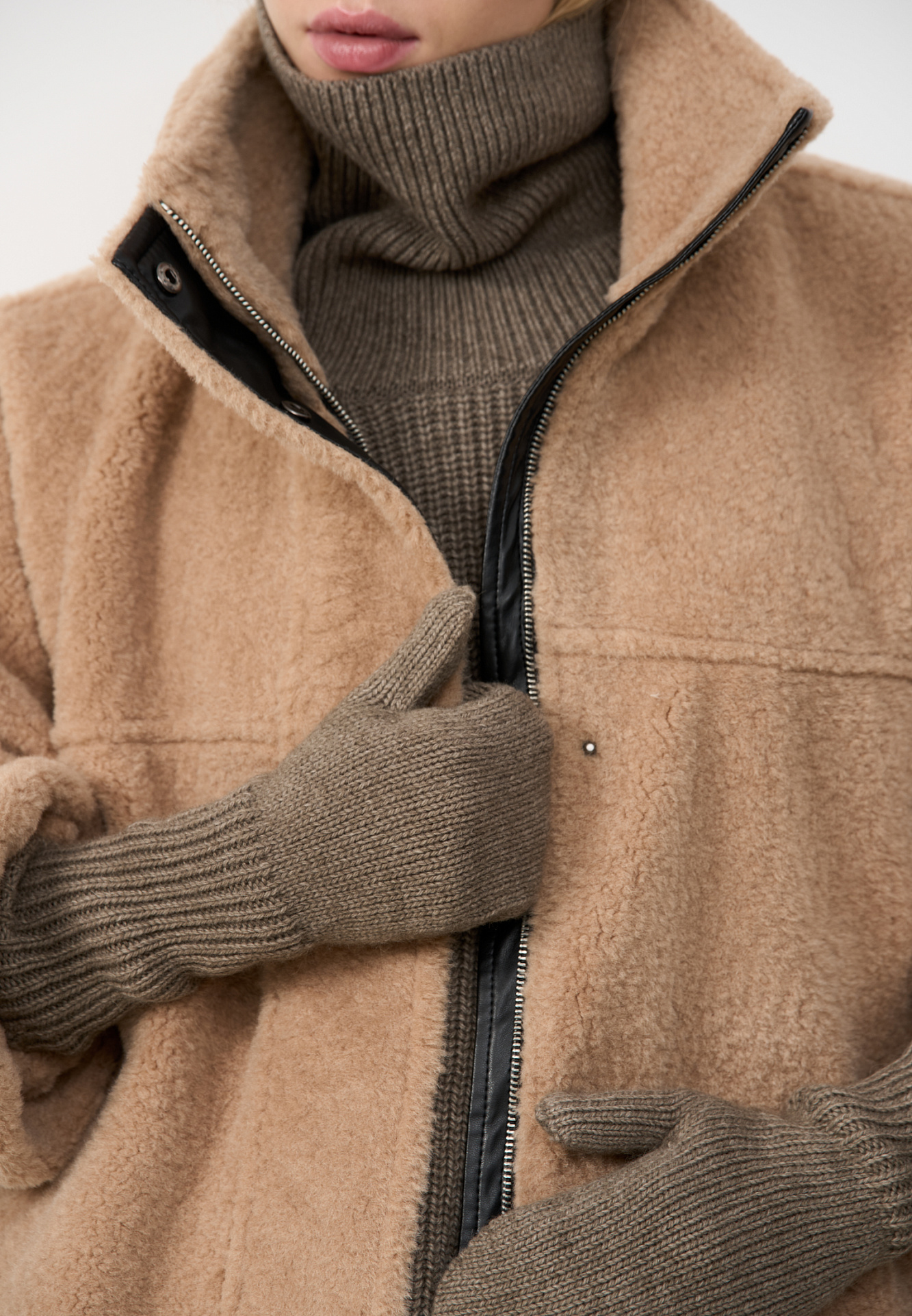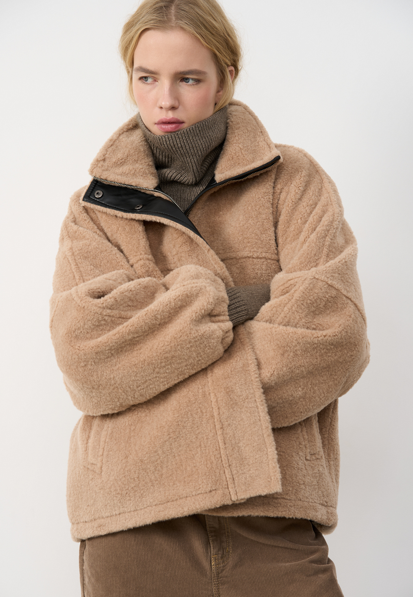 Шуба из экомеха с воротником-стойкой. Модель свободного силуэта с боковыми карманами, объемными швами и манжетами на резинке. Застежка на молнию под планкой с кнопками, декорированной экокожей.