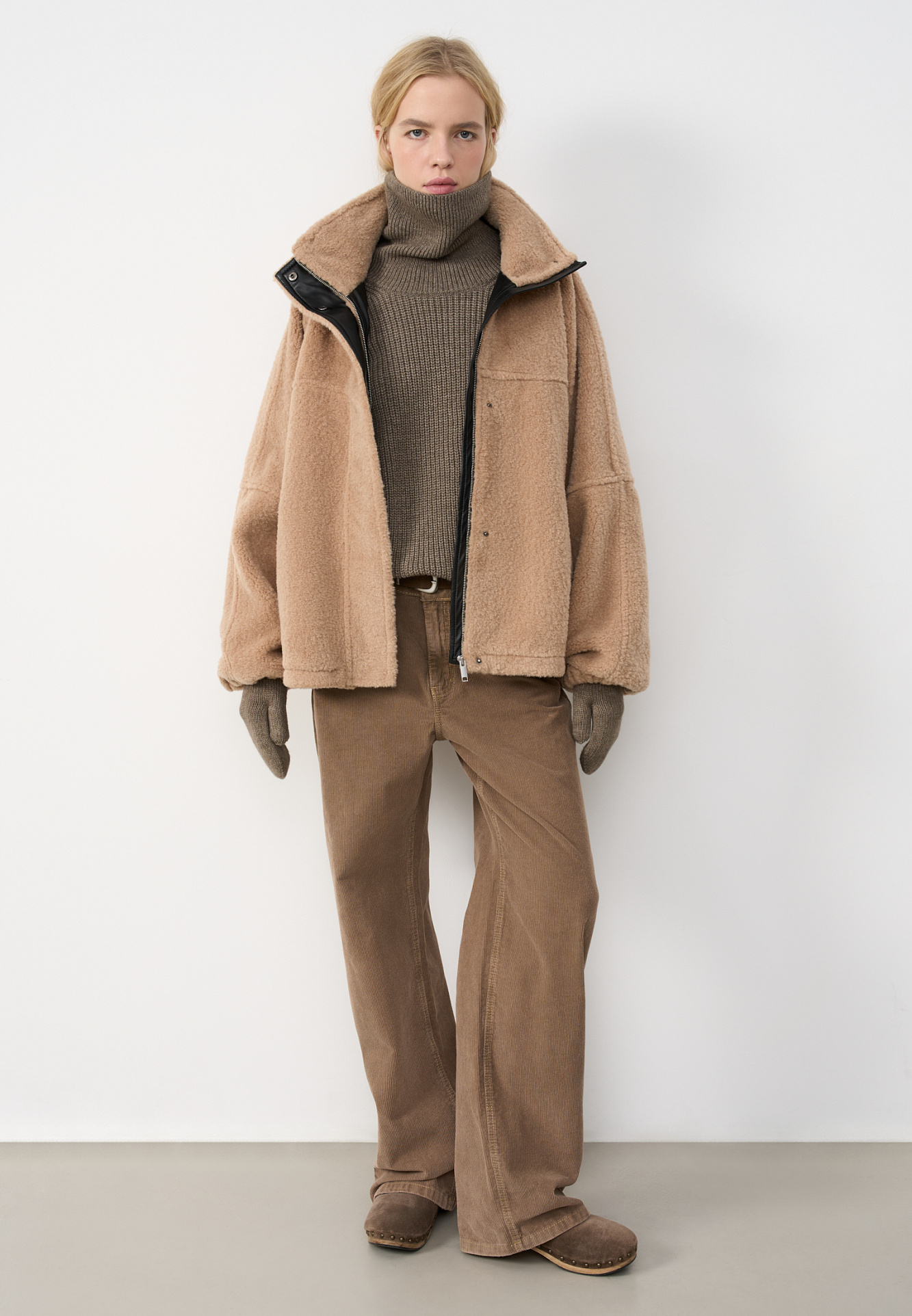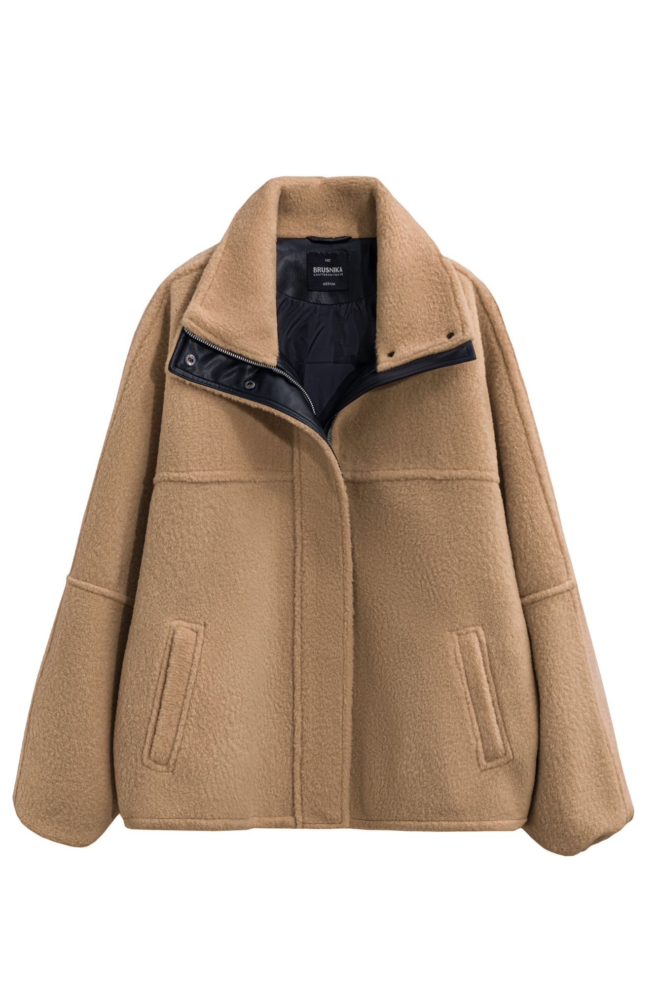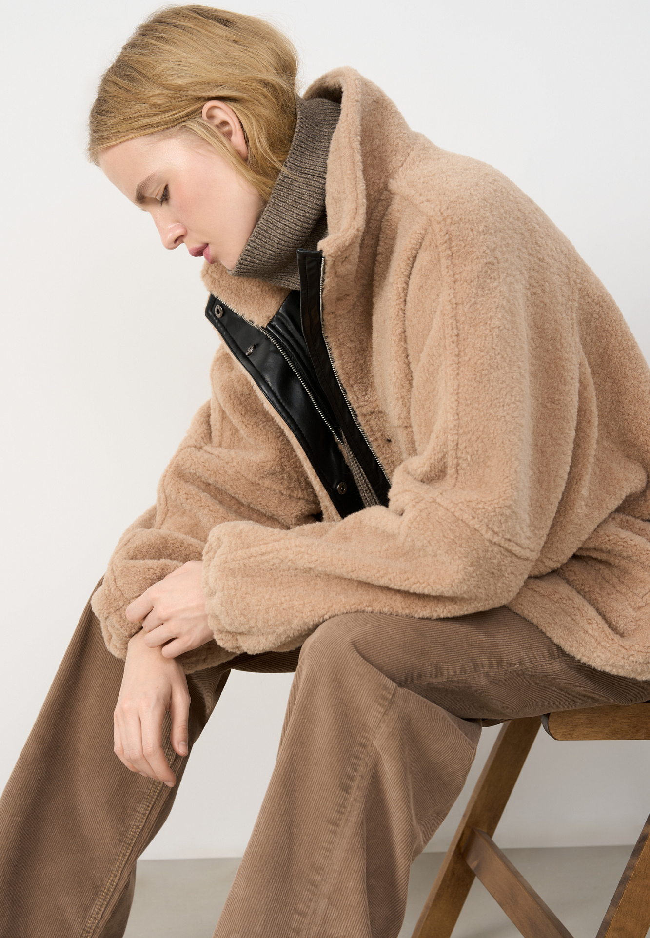 Шуба из экомеха с воротником-стойкой. Модель свободного силуэта с боковыми карманами, объемными швами и манжетами на резинке. Застежка на молнию под планкой с кнопками, декорированной экокожей.