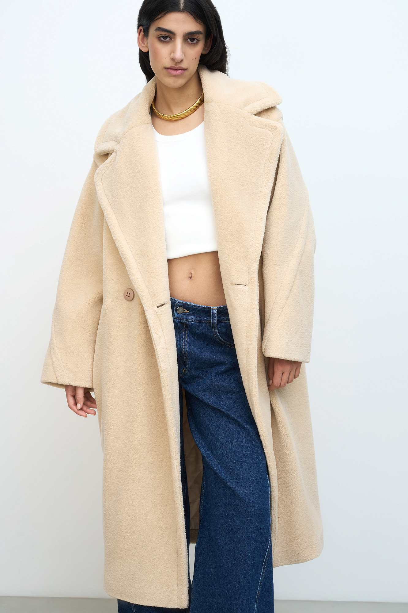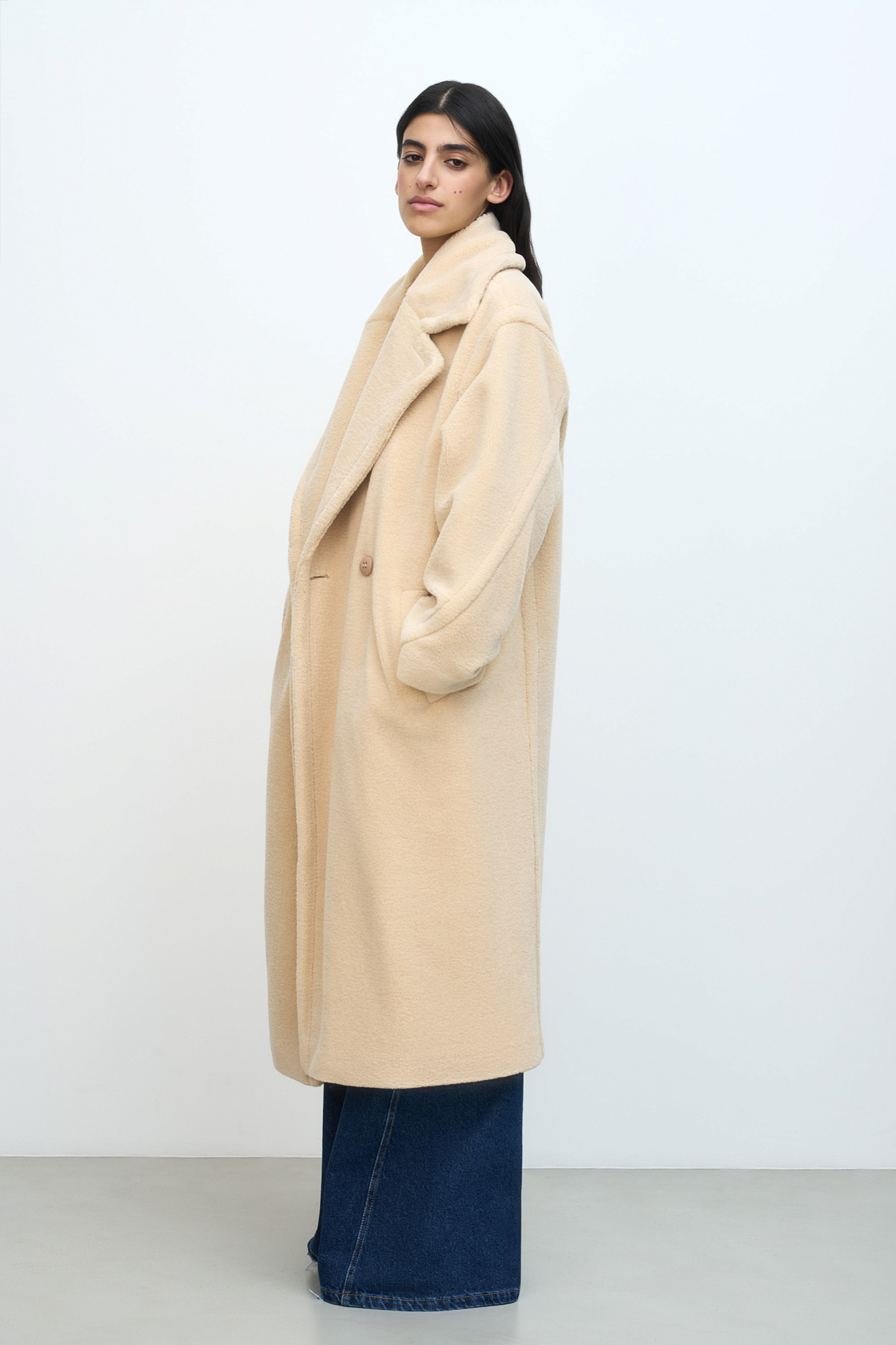 Объемная шуба из экомеха. Модель свободного силуэта с английским воротником, боковыми карманами и застежкой на пуговицы.