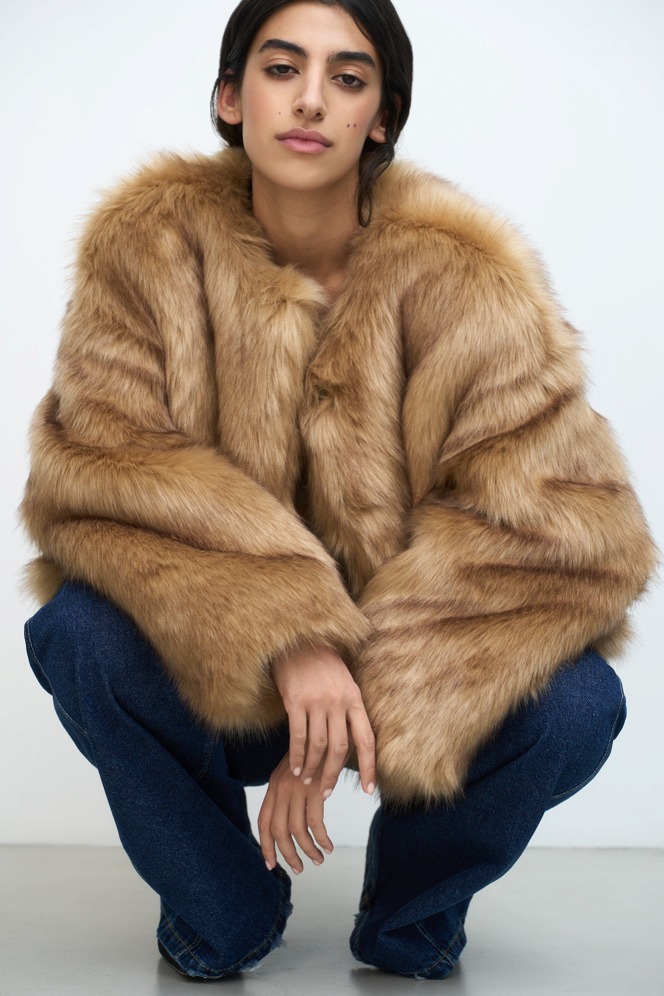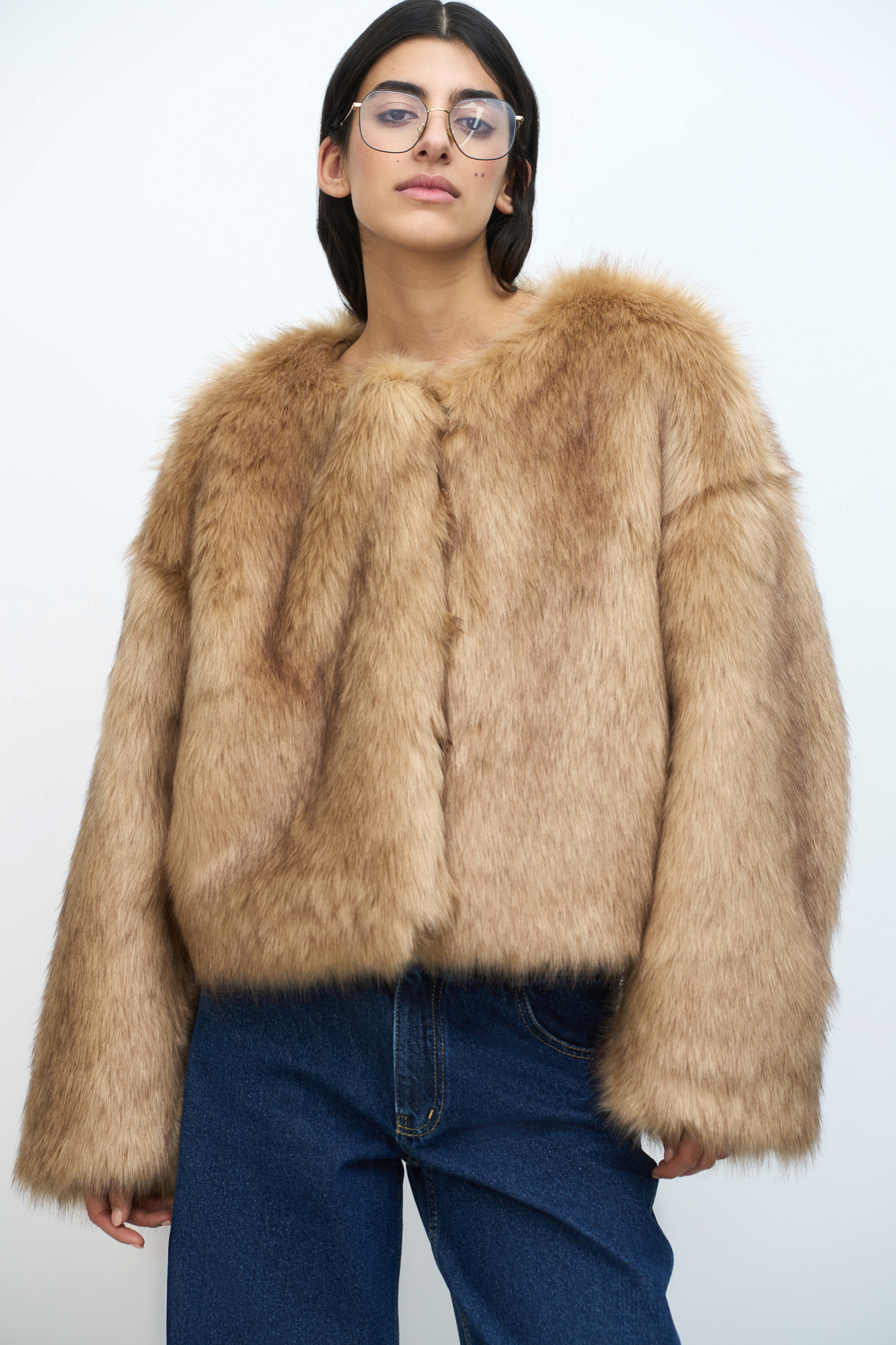 Легкая шуба из искуственного меха со спущенной линией плеча. Круглый вырез. Застежка на крючки.