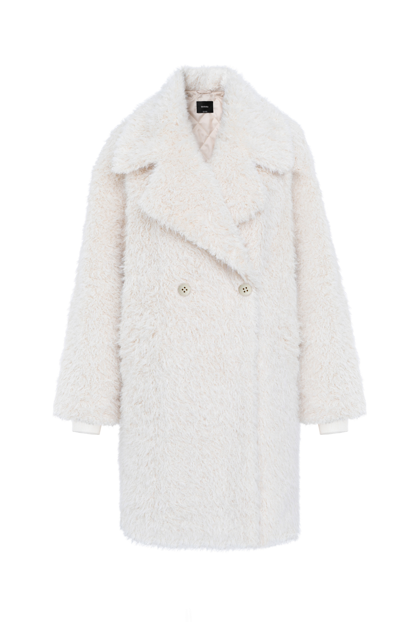 Объемная двубортная шуба длины миди из экомеха. Модель свободного силуэта со спущенной линией плеча, длинными трикотажными манжетами и застежкой на пуговицы. Изделие выполнено на подкладке.