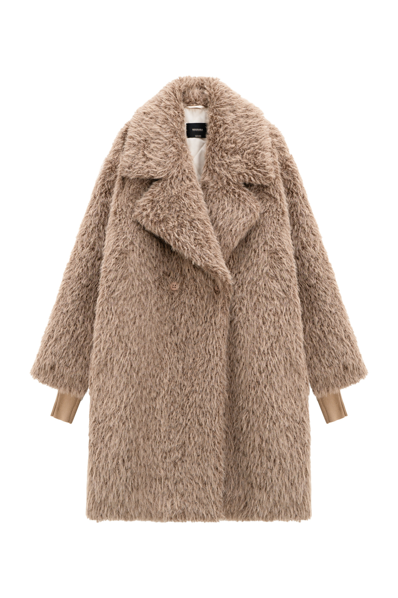 Объемная двубортная шуба длины миди из экомеха. Модель свободного силуэта со спущенной линией плеча, длинными трикотажными манжетами и застежкой на пуговицы. Изделие выполнено на подкладке.