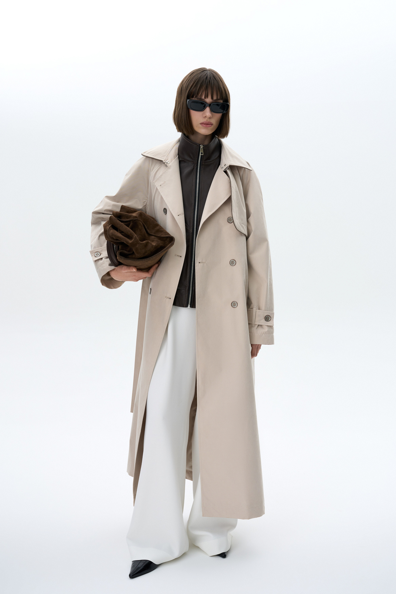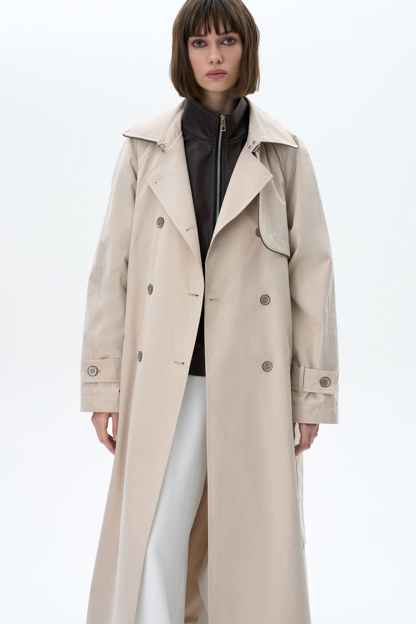 Двубортный тренч свободного кроя с отложным воротником, застежка на вороте, асимметричная отлетная кокетка и боковые карманы. В комплекте съемный пояс из основного материала. На подкладке.