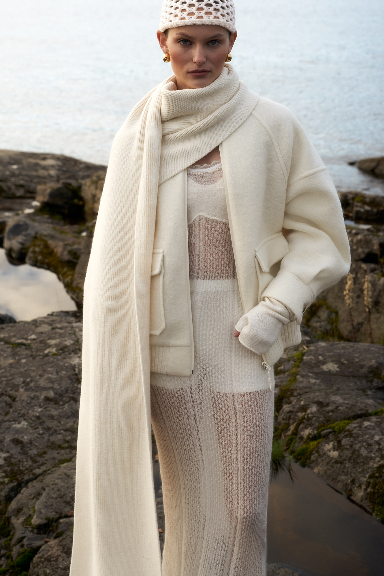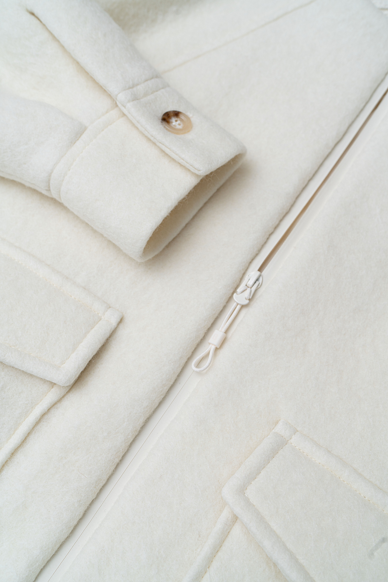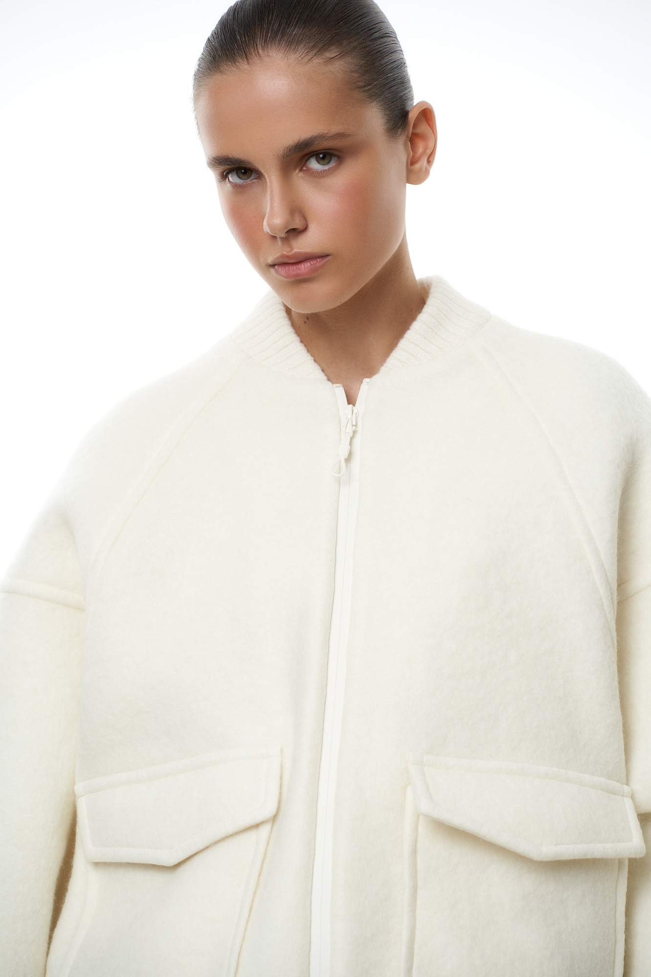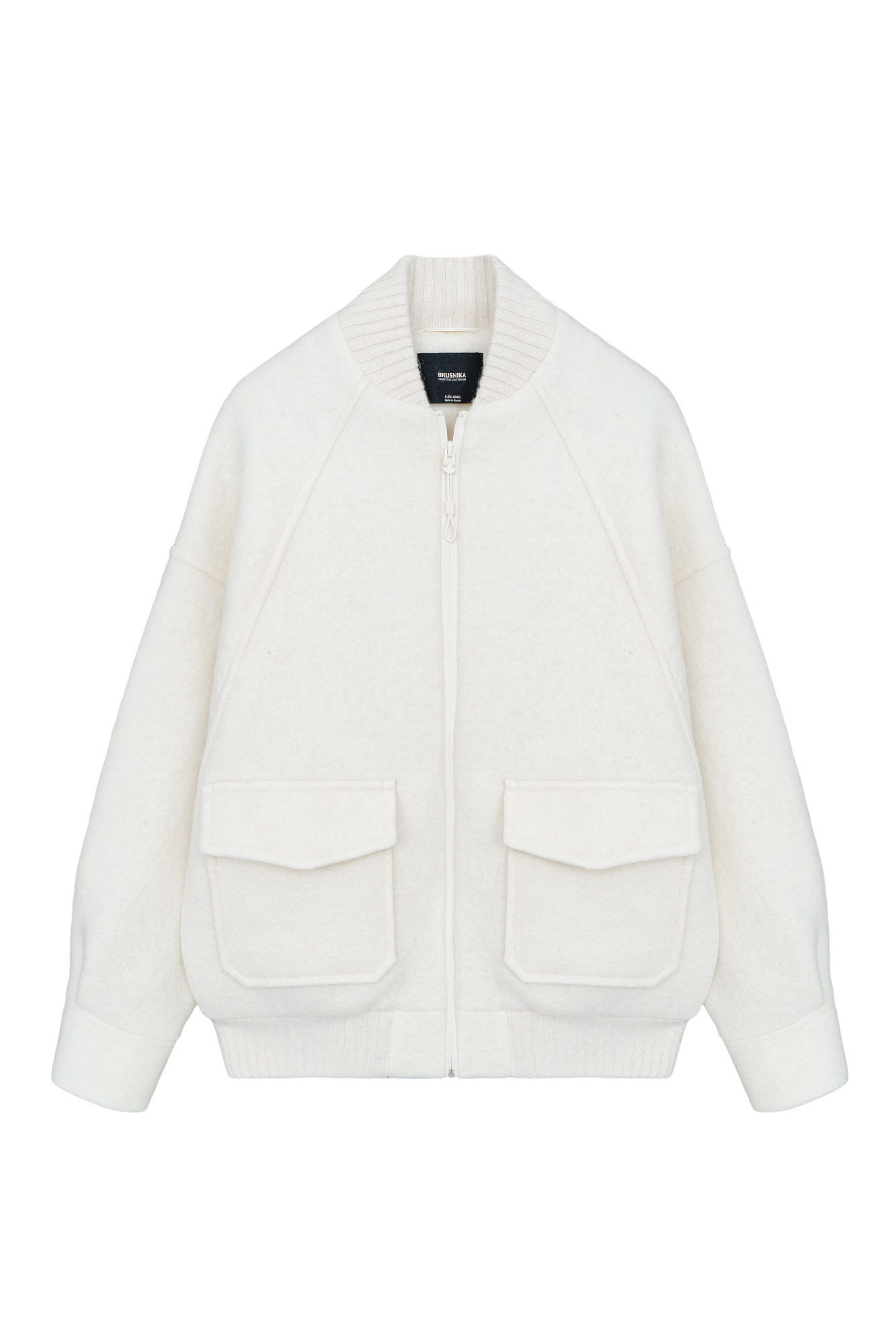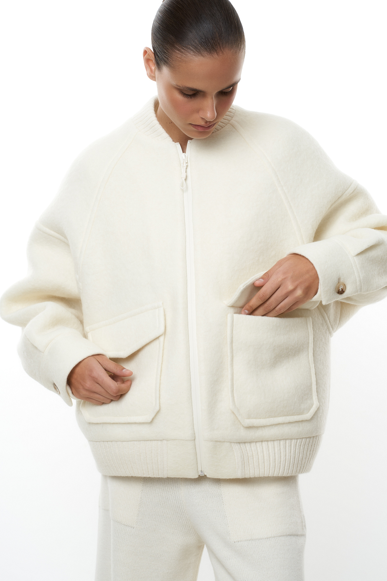 Свободный бомбер из валяной шерсти. Горловина и низ на резинке, манжеты застегиваются на пуговицы. Два передних кармана на клапанах. Застежка на молнию.