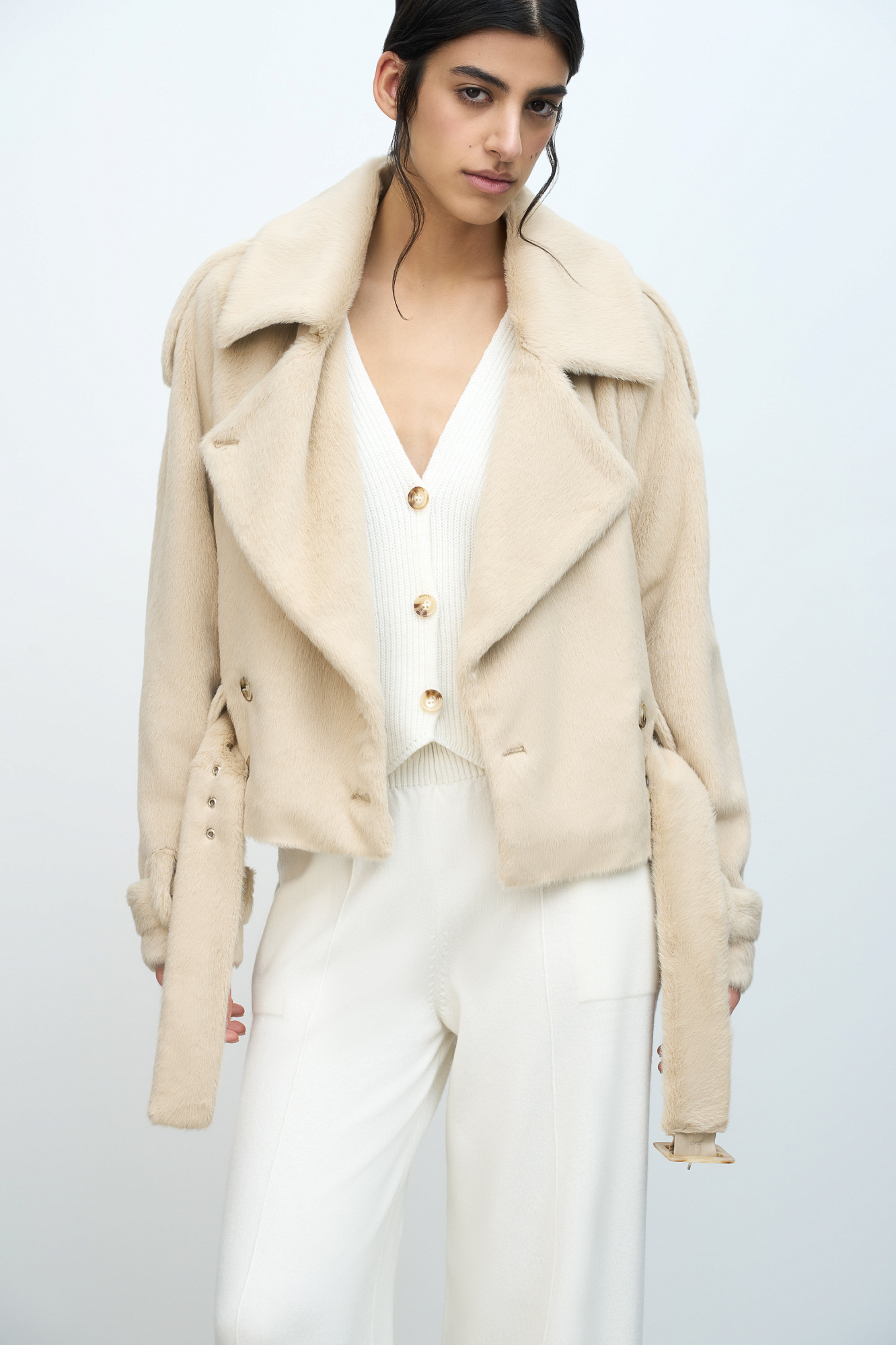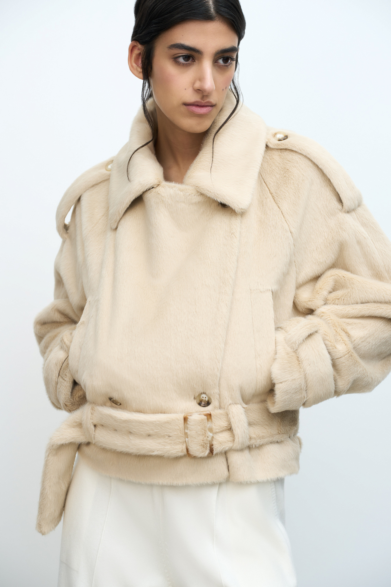Укороченная шуба из экомеха с отложным воротником, карманами, патами и поясом из основного материала. Застежка на пуговицы. Изделие на подкладке.
