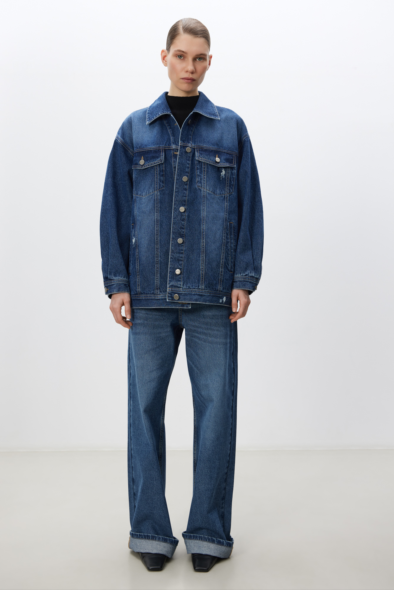 Джинсовый жакет из 100% хлопка. Модель прямого кроя, с отложным воротником, длинными рукавами с манжетами на пуговицах. Изделие декорировано накладными карманами на груди и боковыми карманами спереди. Застежка на пуговицы.