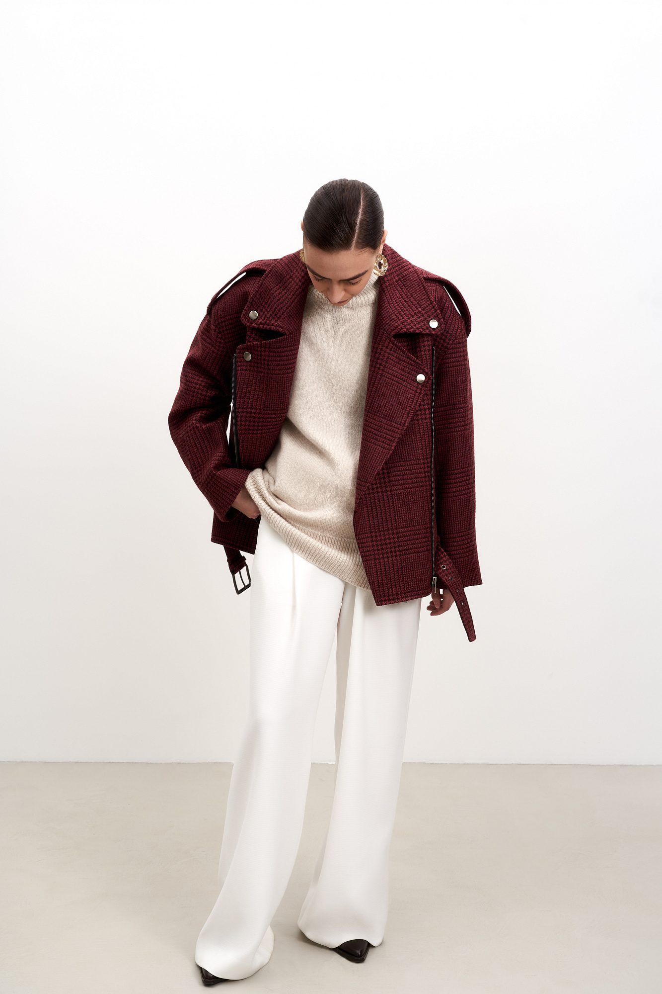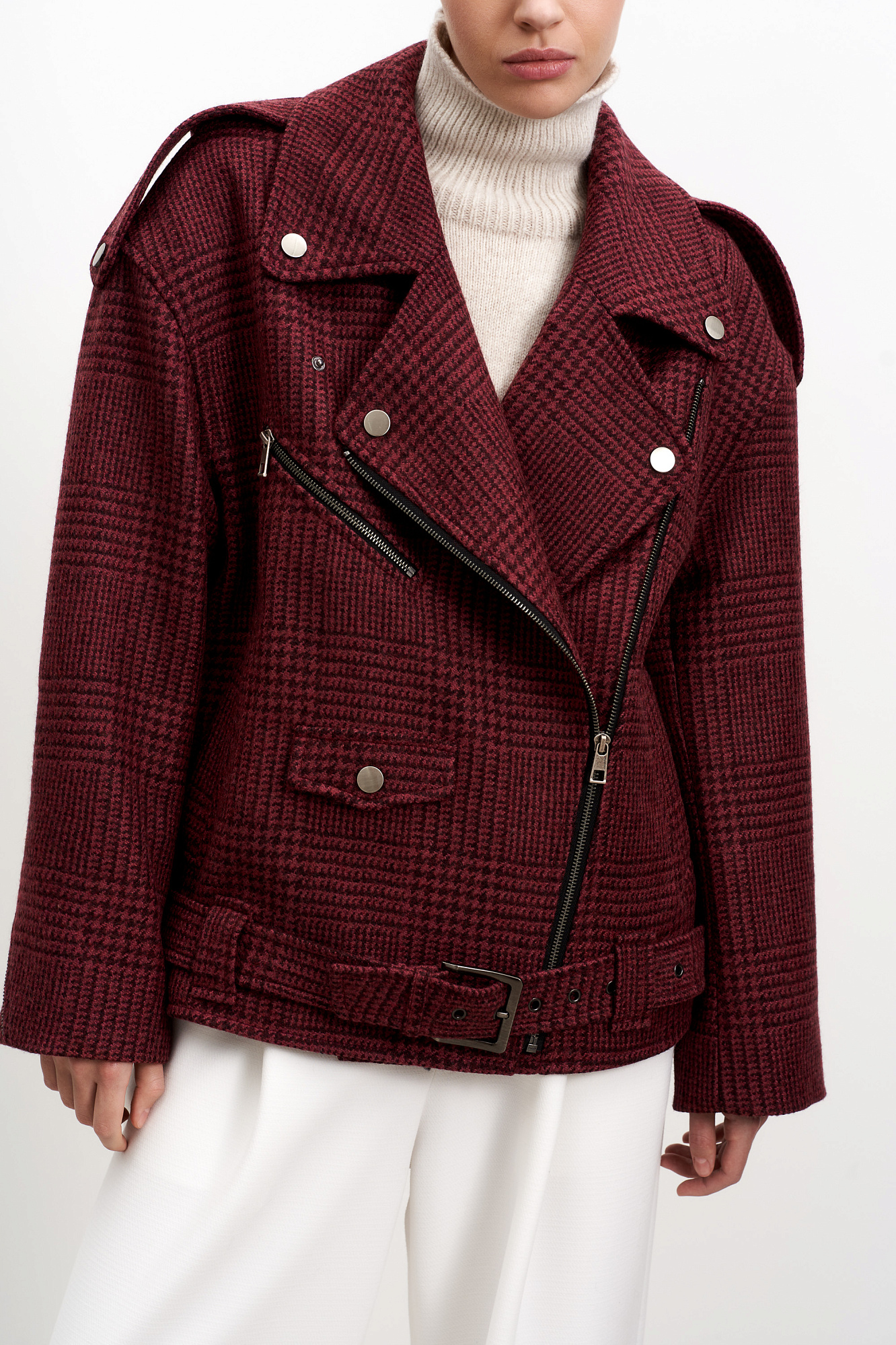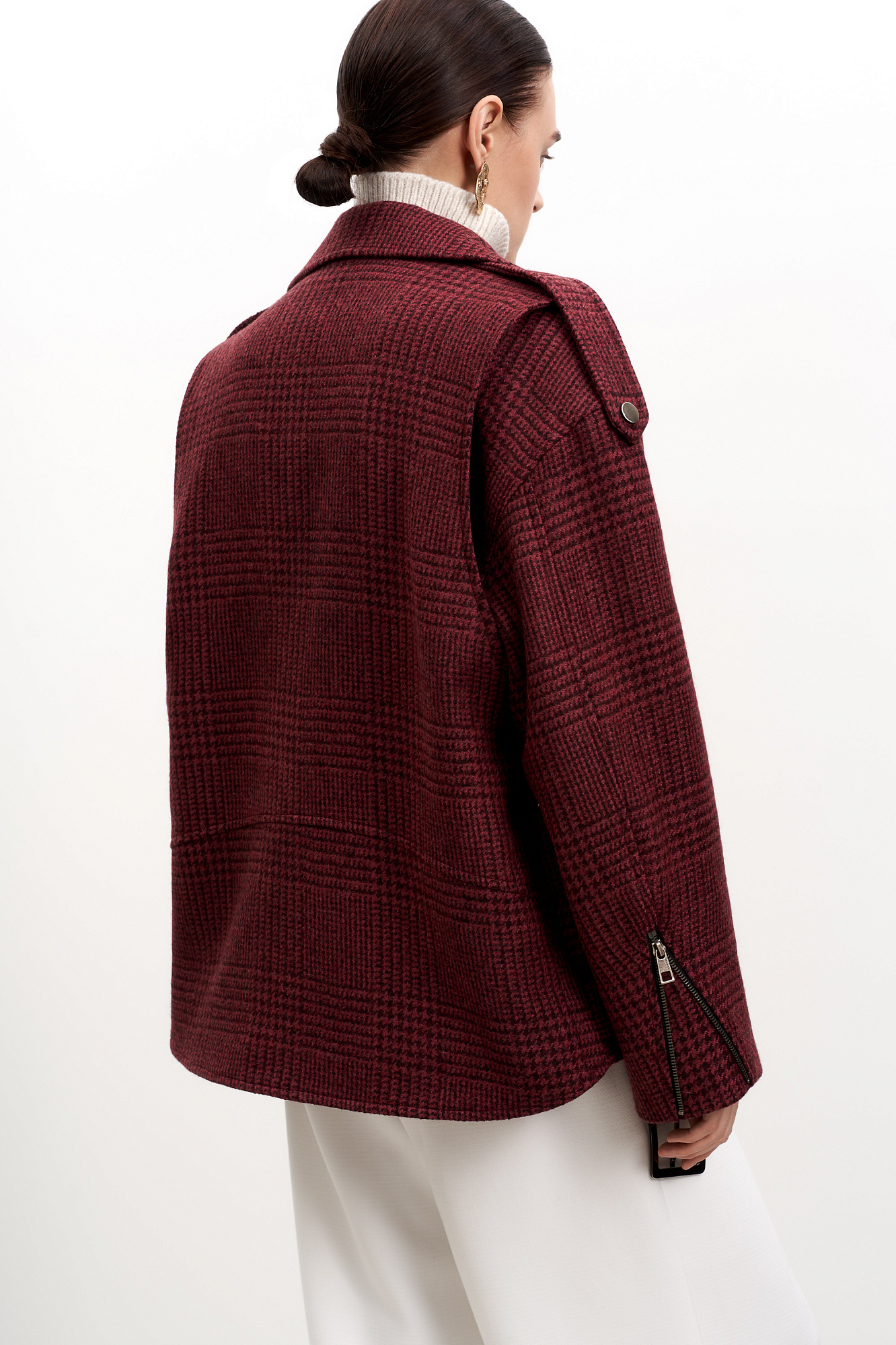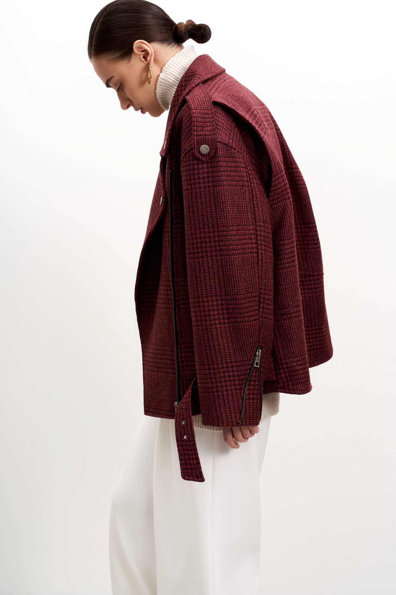 Жакет-косуха из смесовой шерсти. Модель свободного силуэта со спущенным плечом и косой застежкой. Боковые карманы, манжеты на молнии.