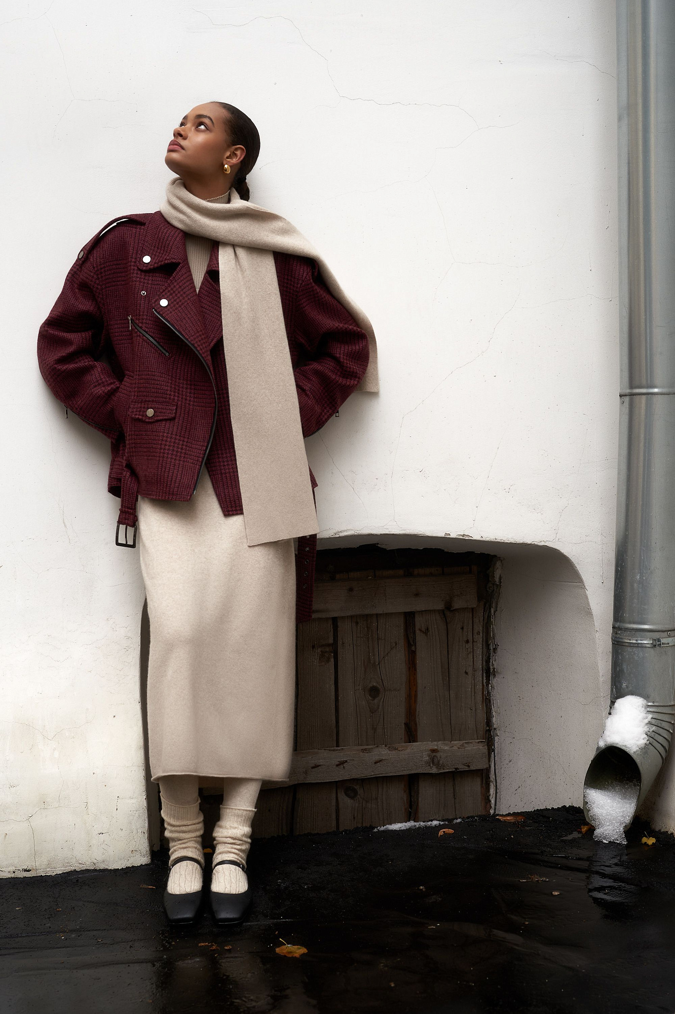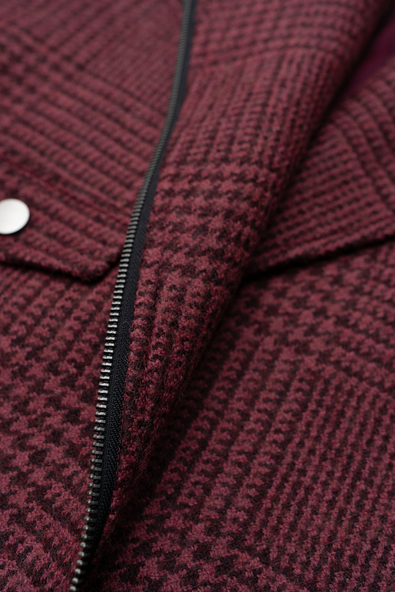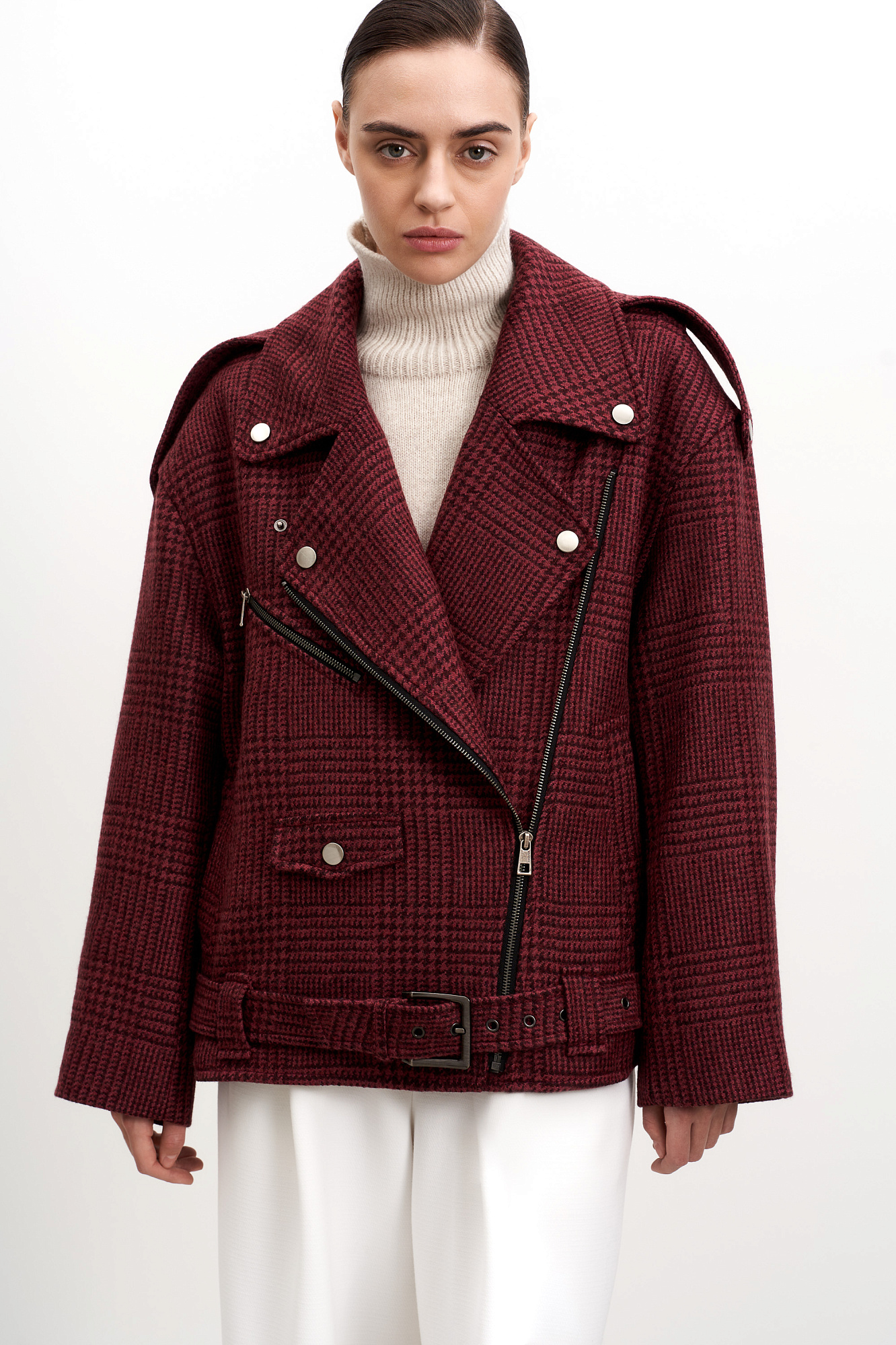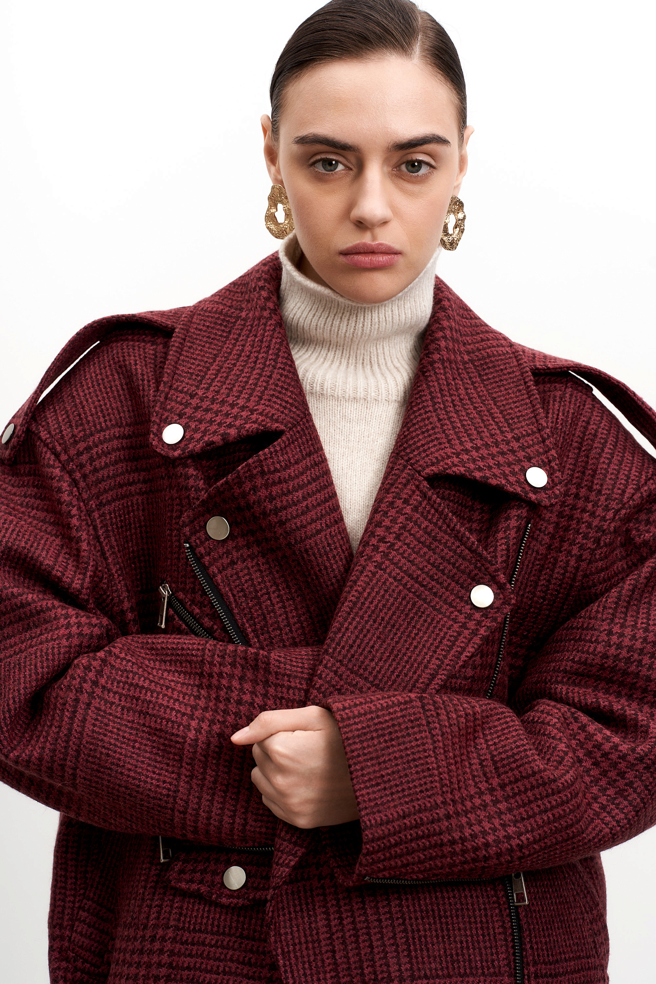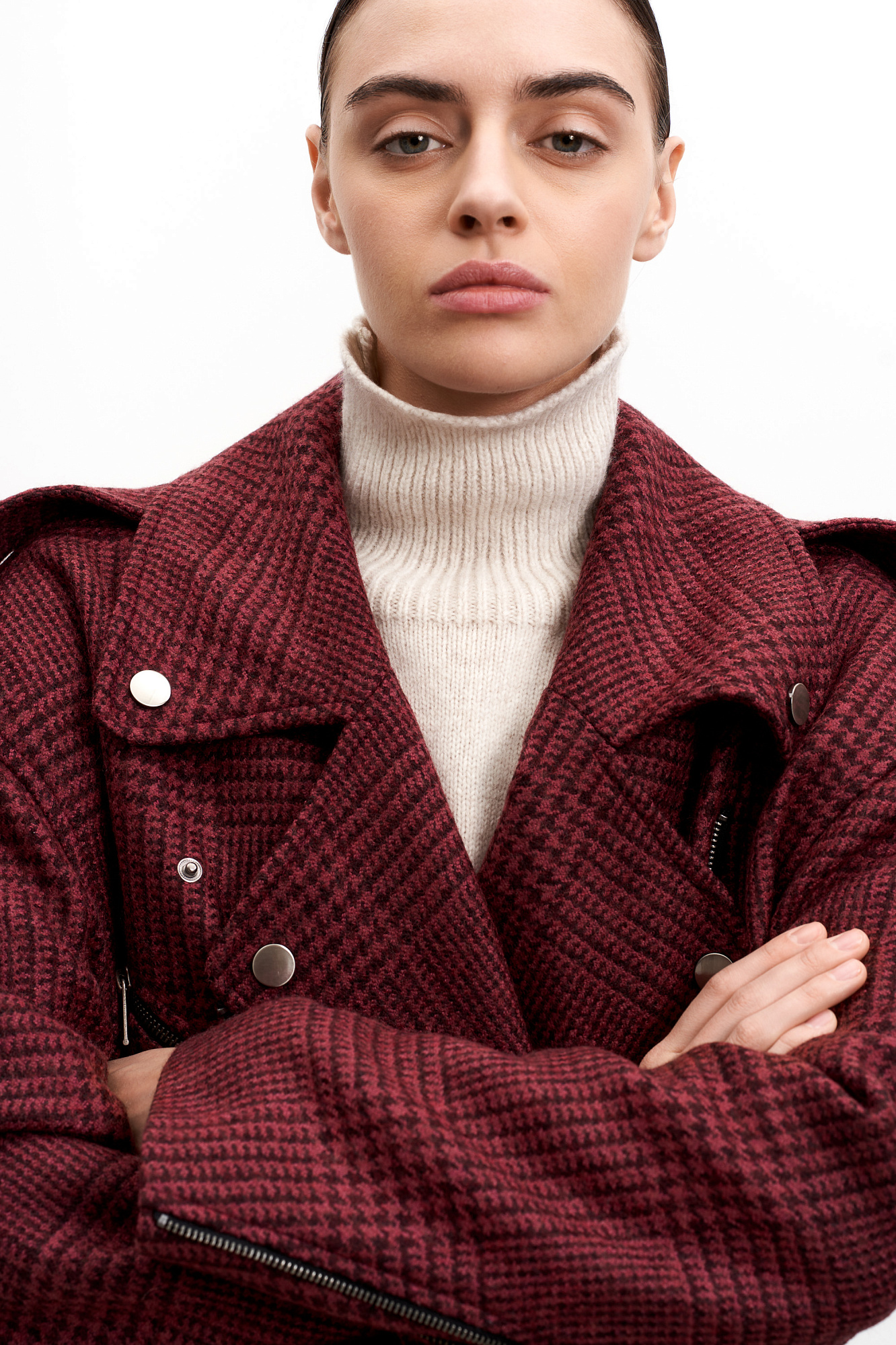 Жакет-косуха из смесовой шерсти. Модель свободного силуэта со спущенным плечом и косой застежкой. Боковые карманы, манжеты на молнии.