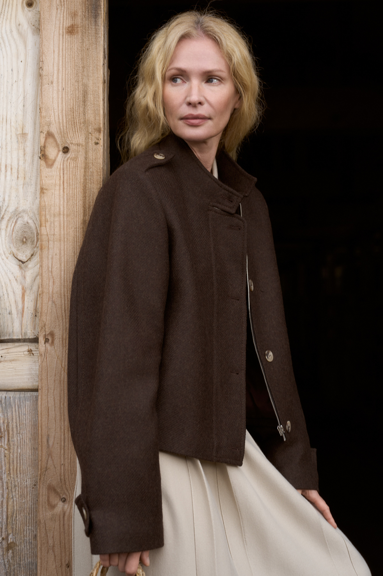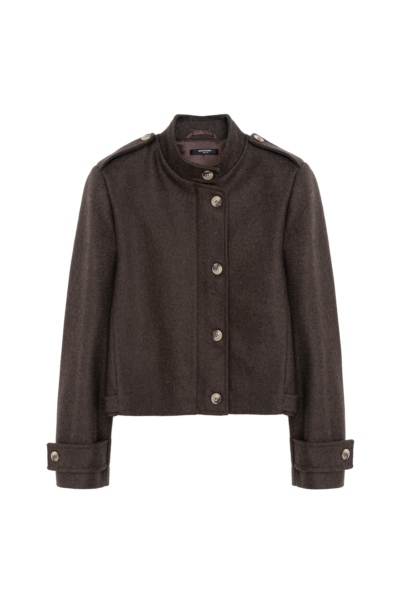 Шерстяной бомбер с воротником-стойкой. Манжеты рукавов декорированы патами и пуговицами. Застежка на пуговицы. На подкладке.