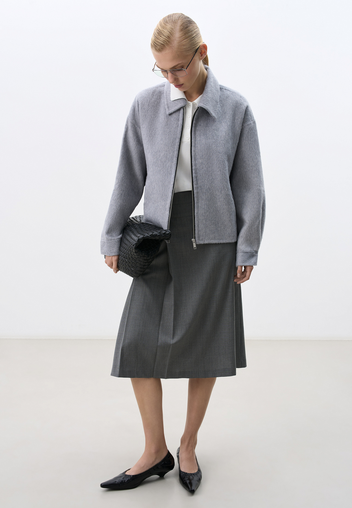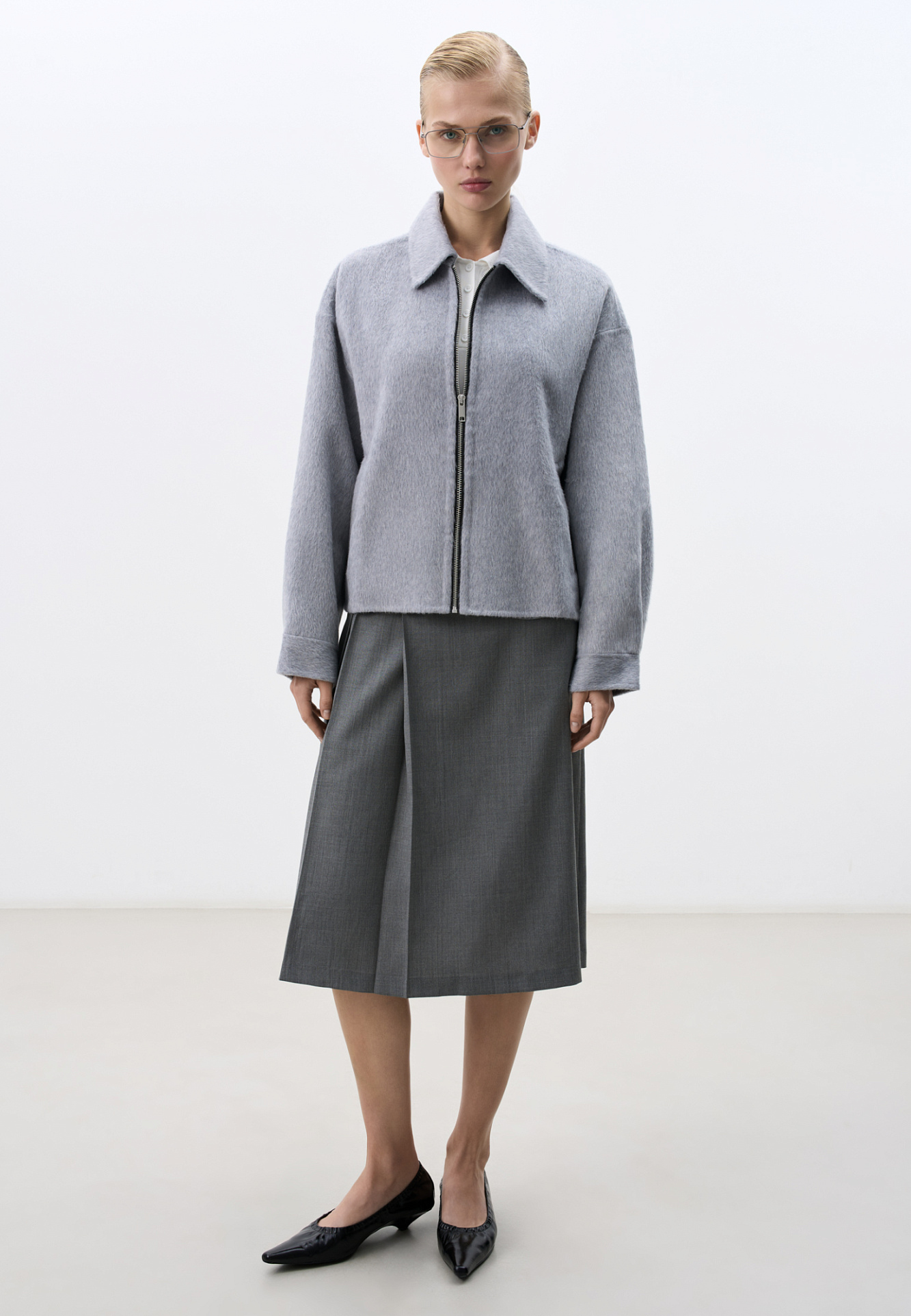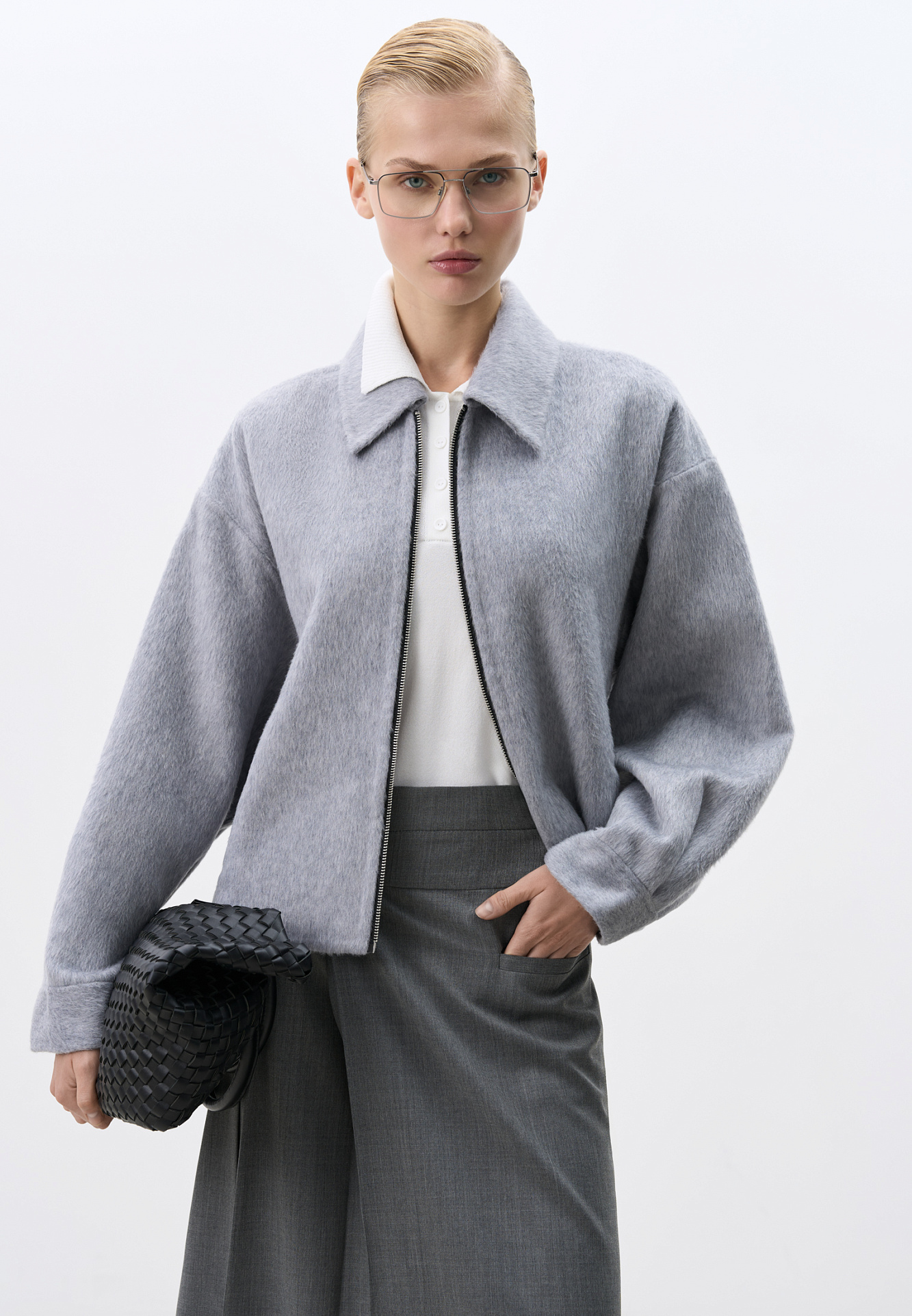 Жакет на молнии из 100% шерсти. Модель свободного кроя с отложным воротником, спущенной линией плеч и двумя боковыми карманами. Застежка на молнию. Брендированный ярлык на спине.