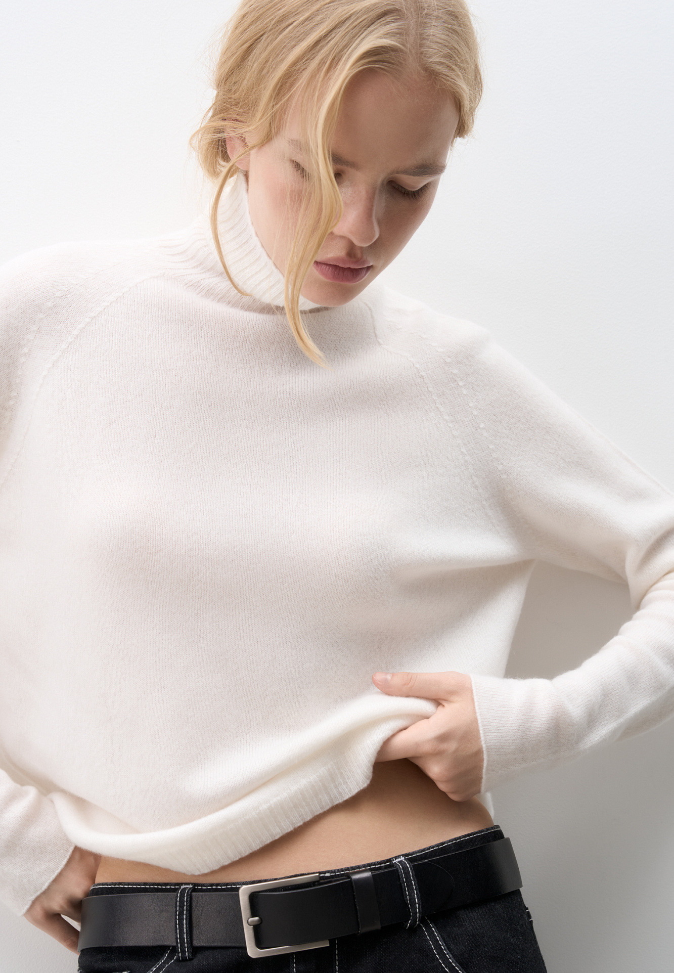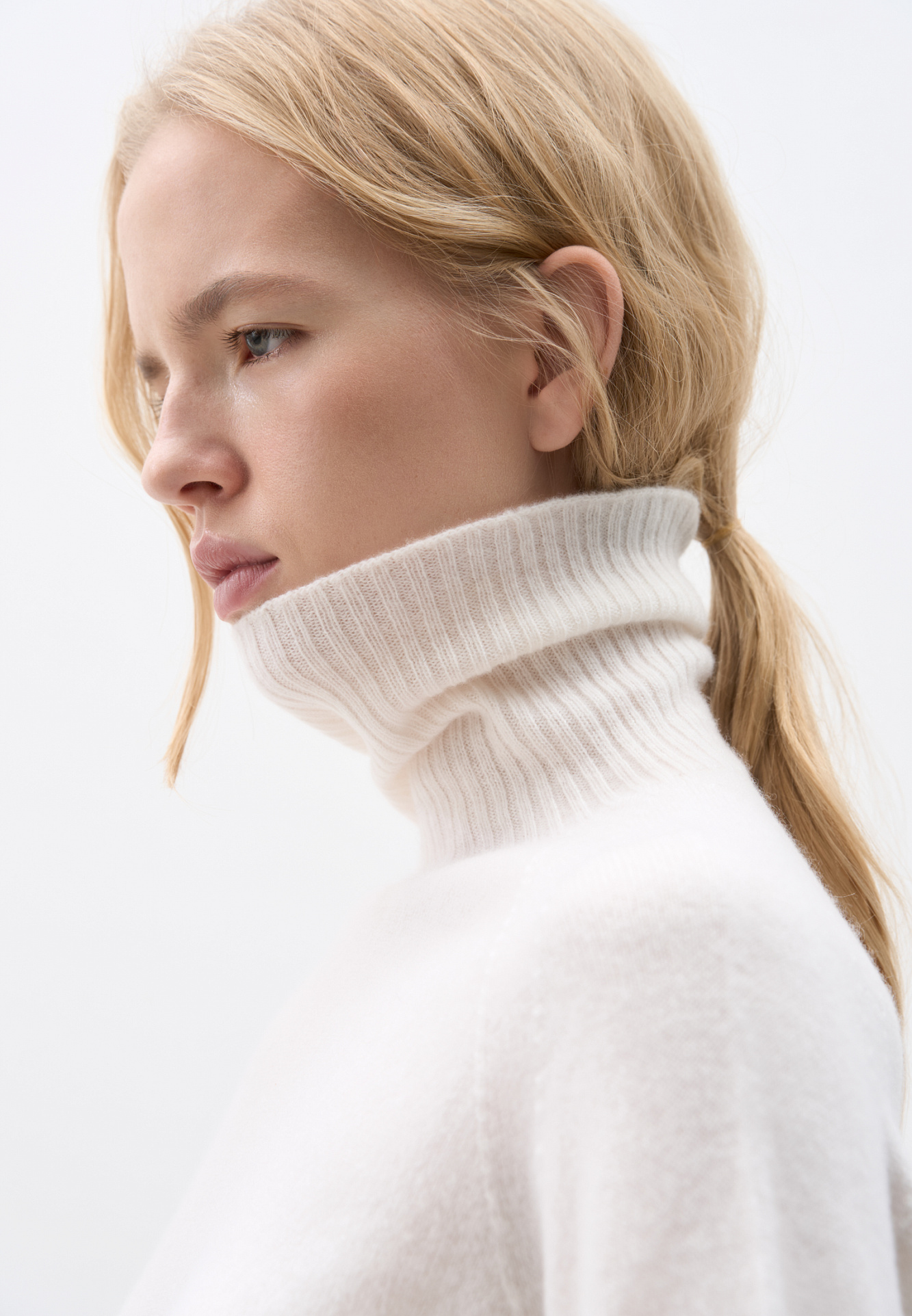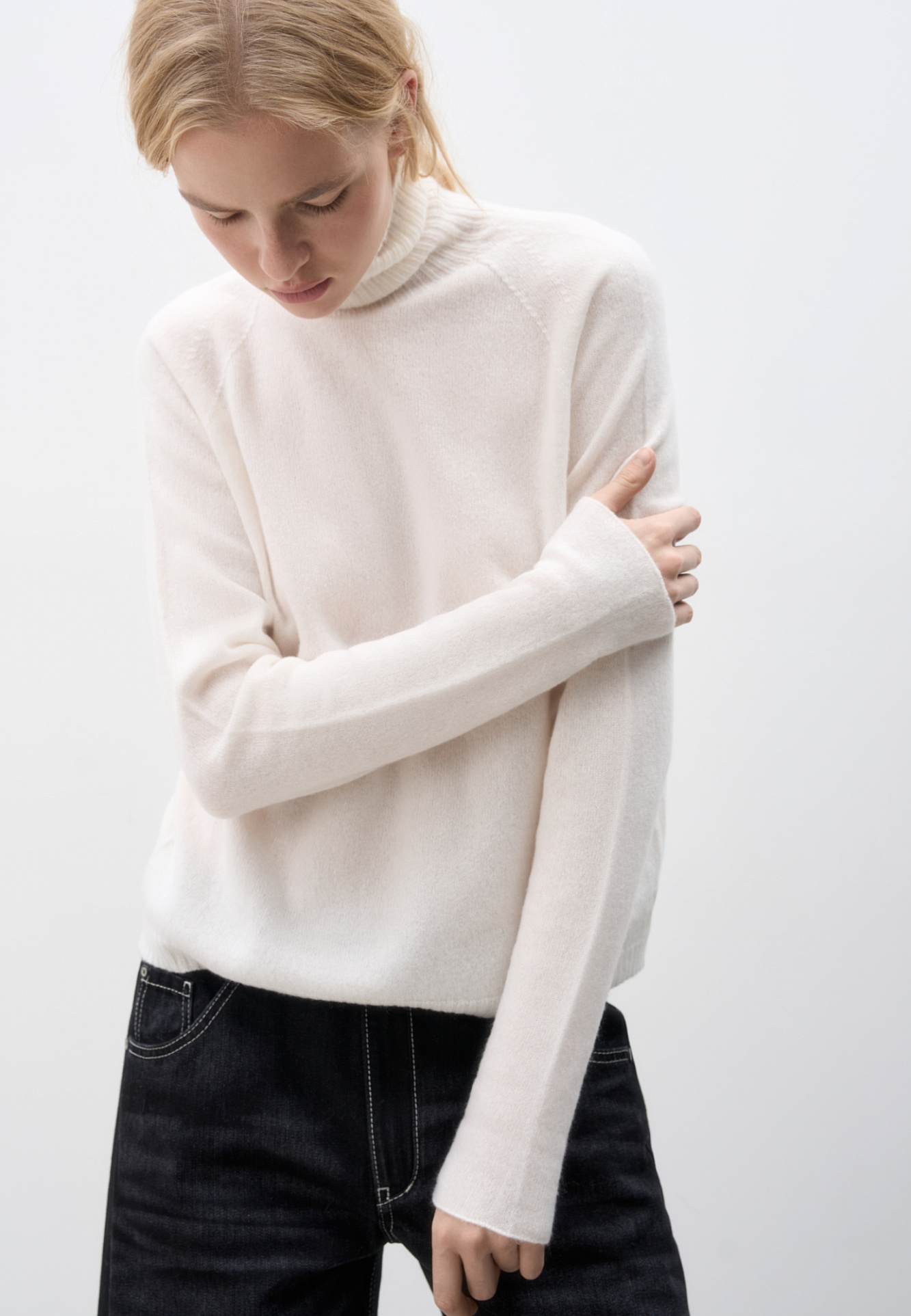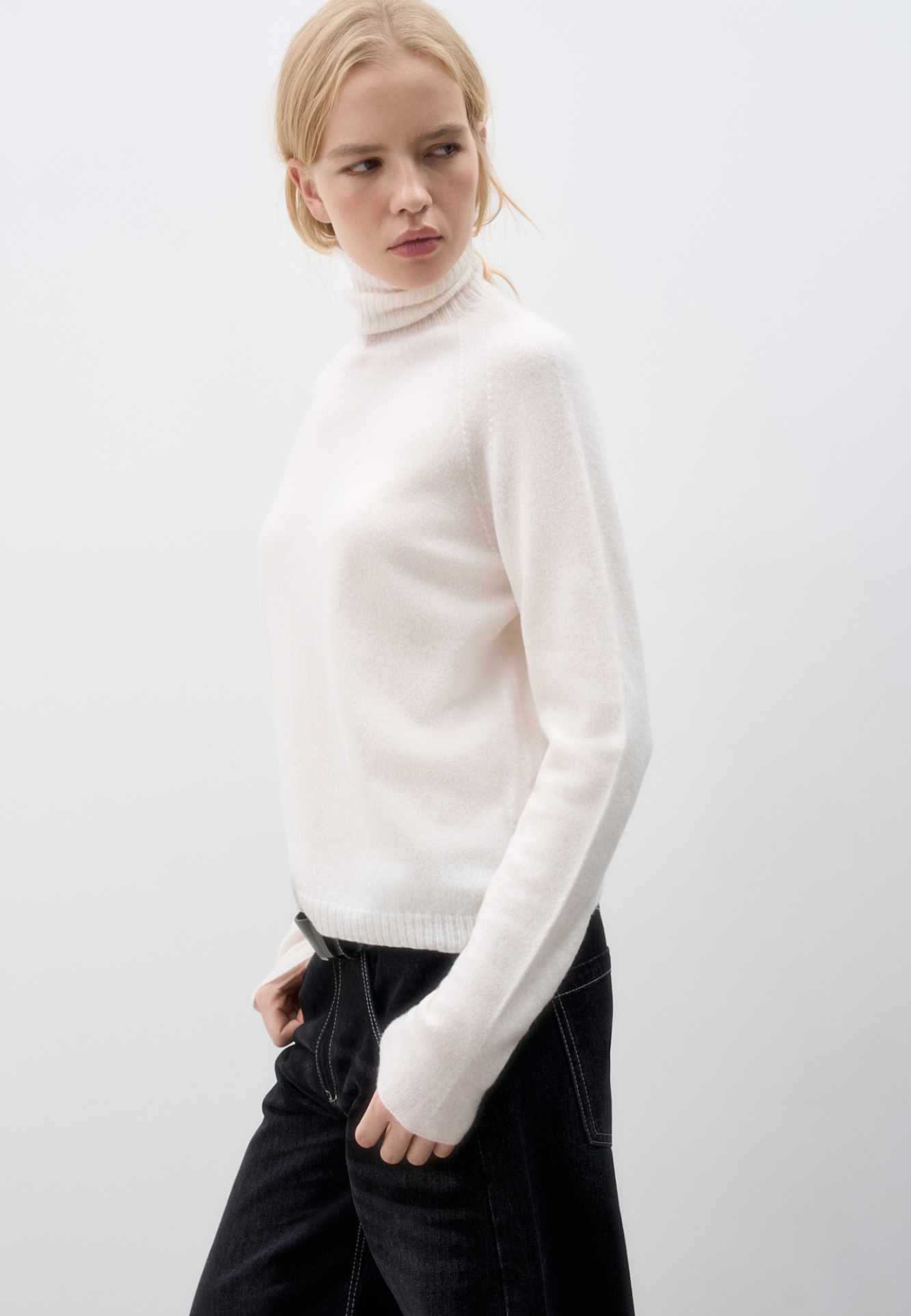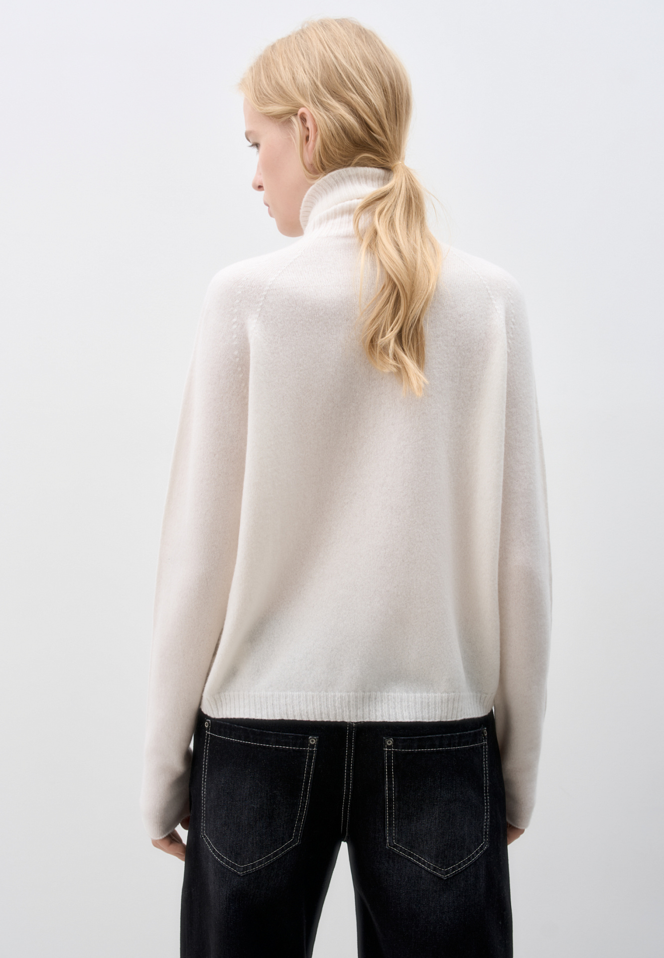Джемпер из 100% кашемира. Модель с высоким воротником и рукавом реглан. Низ изделия и воротник выполены в рубчик.