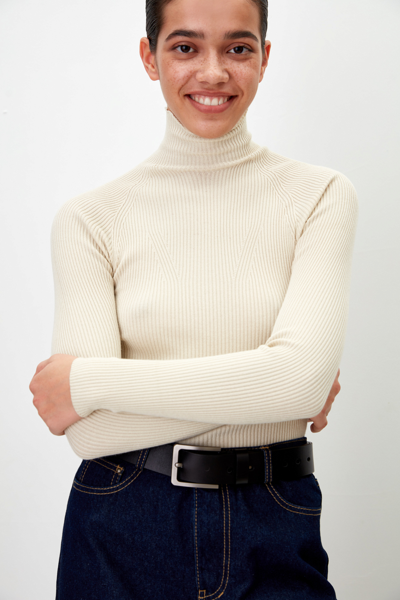 Приталенная, цельновязанная водолазка в рубчик с высоким воротником и рукавом реглан.