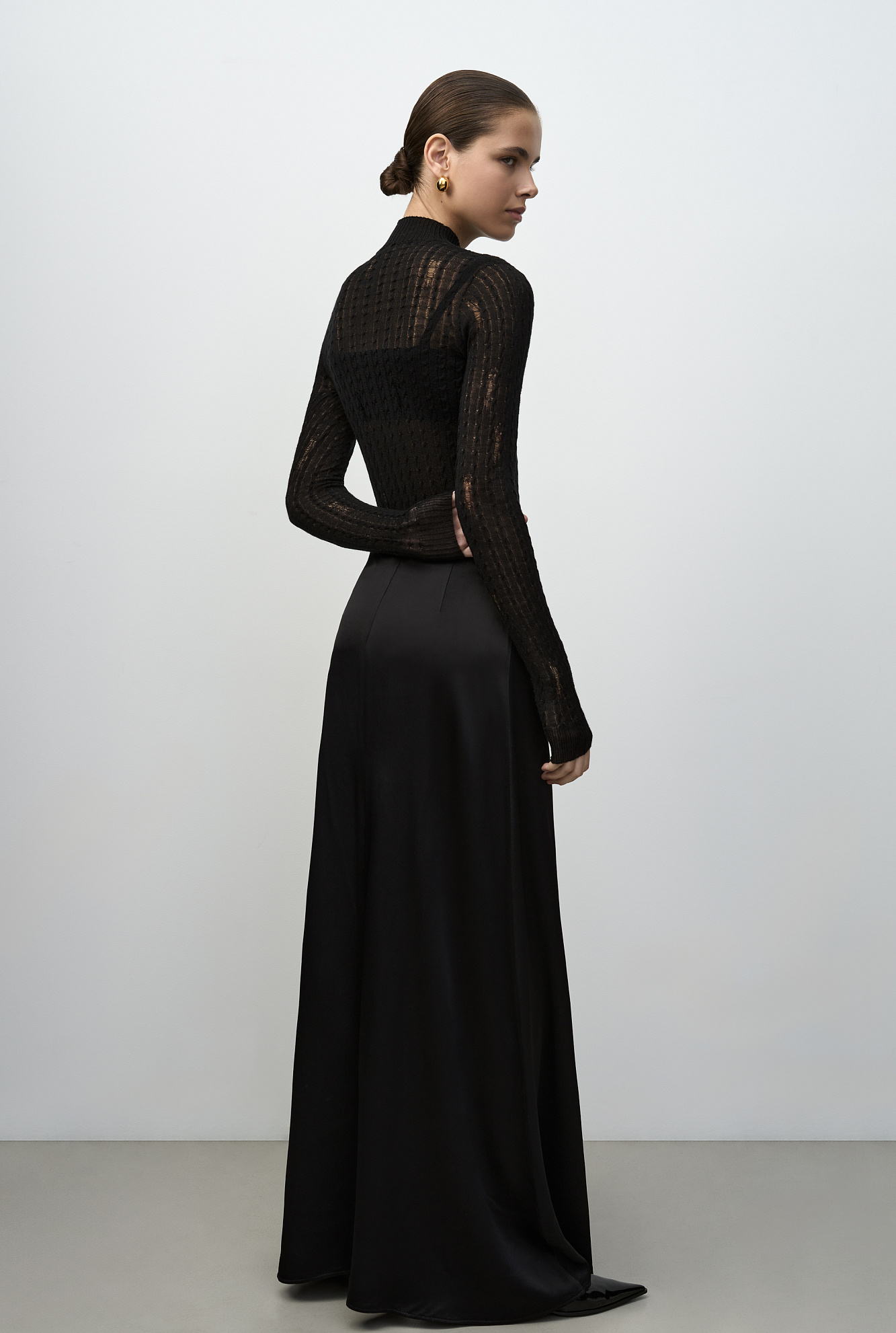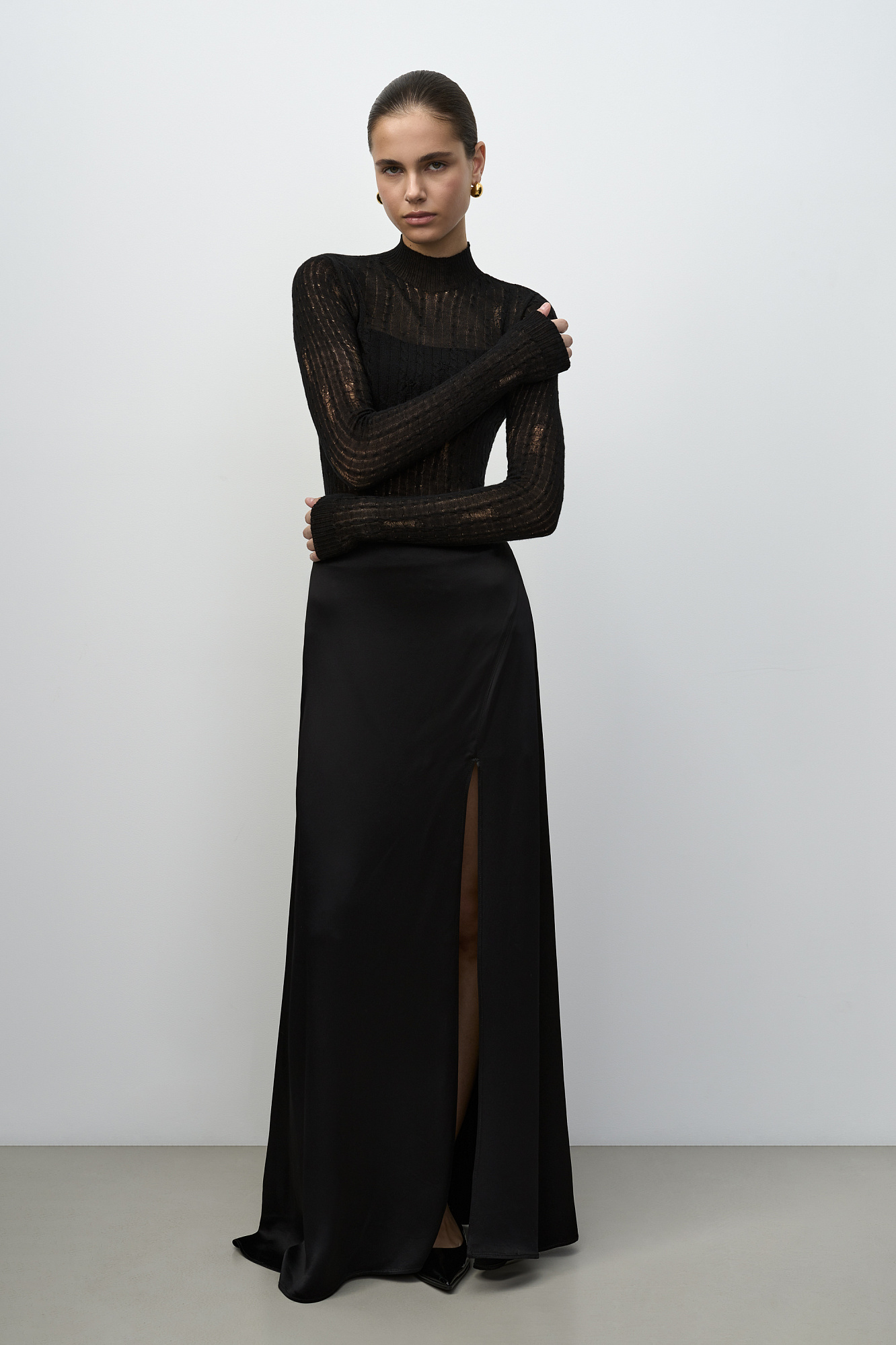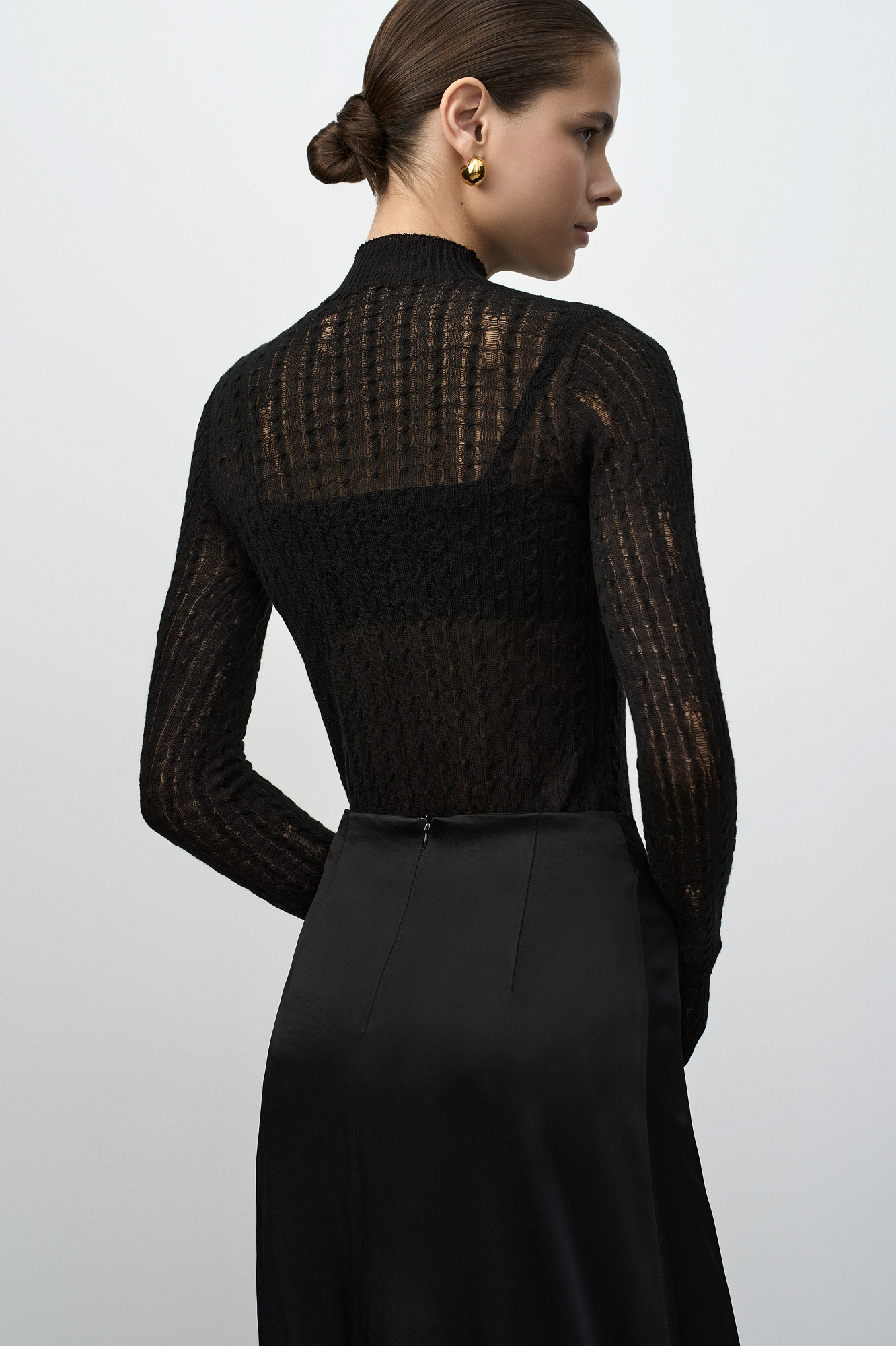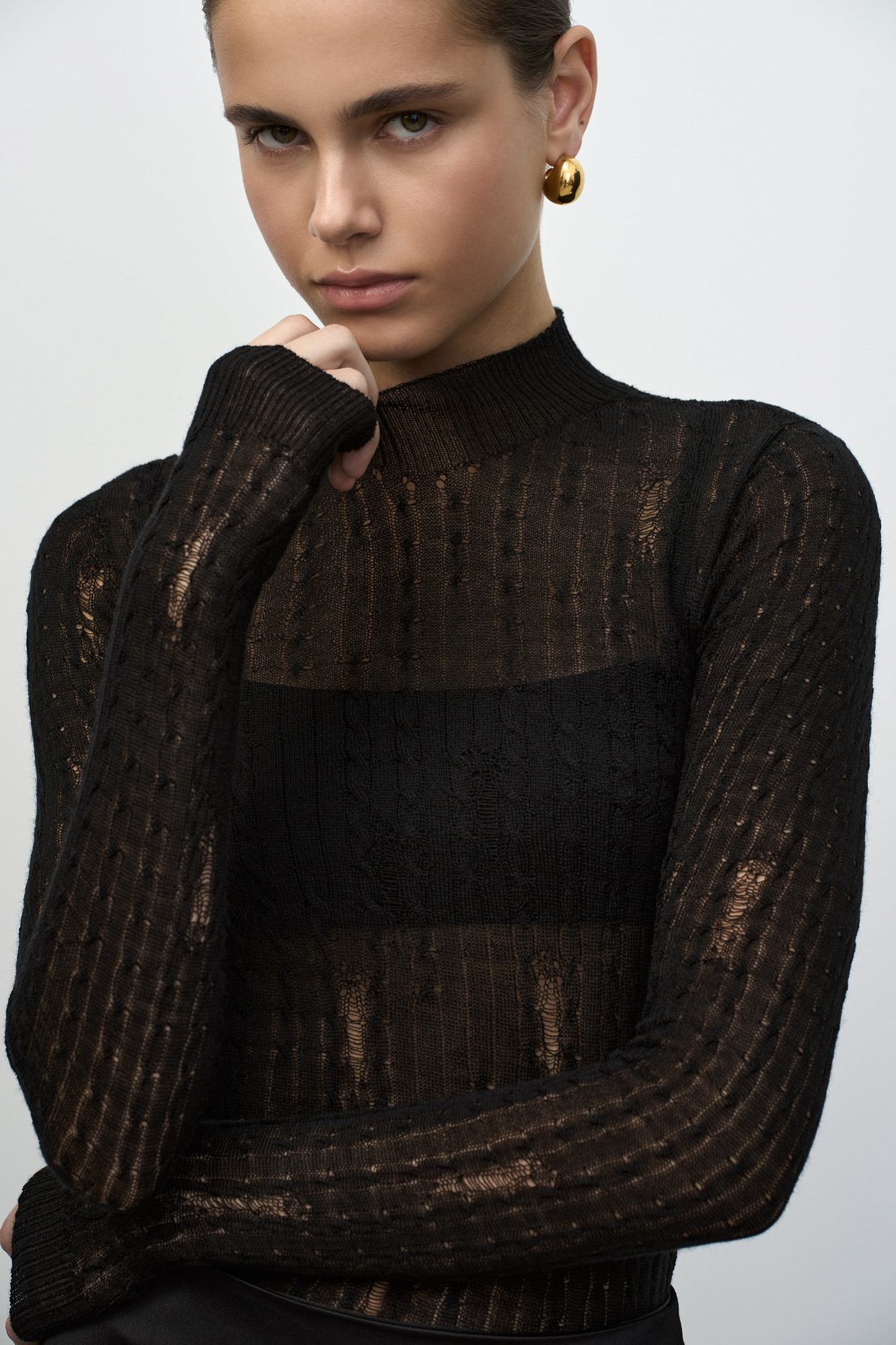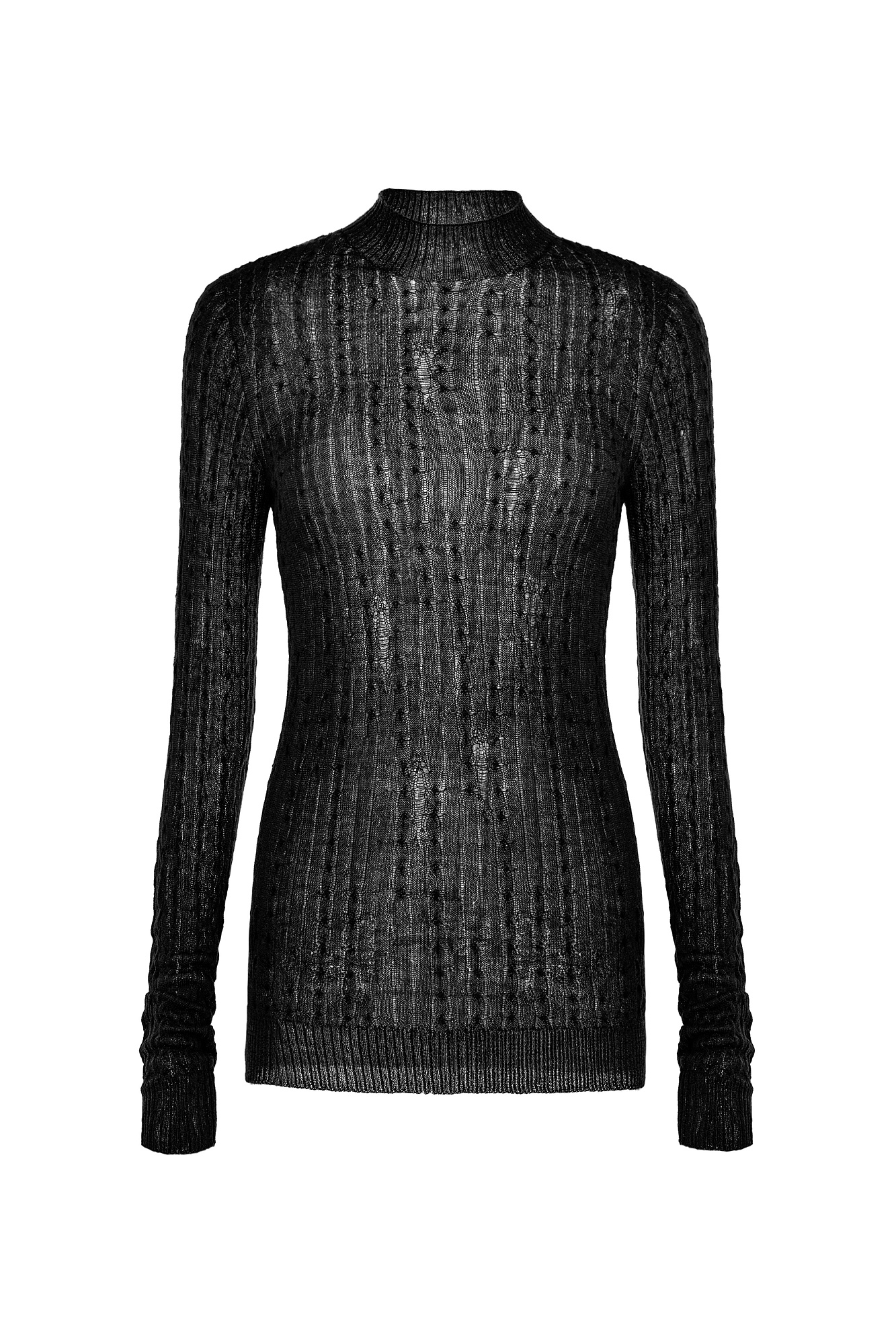 Бесшовная водолазка в стиле гранж из шерсти мериноса экстрафайн. Модель с невысоким воротником-стойкой. Манжеты рукавов, воротник и низ изделия выполнены в рубчик.