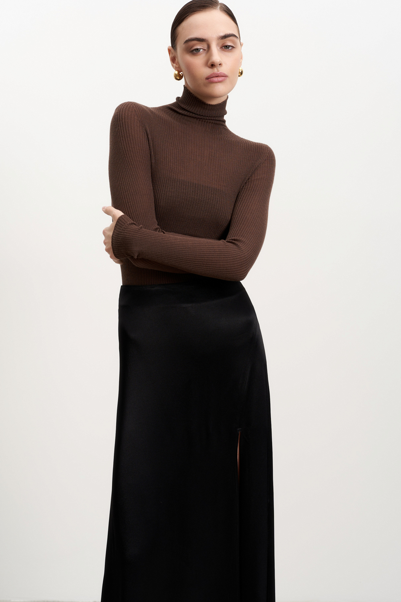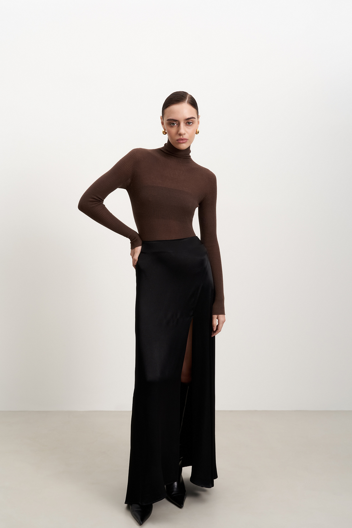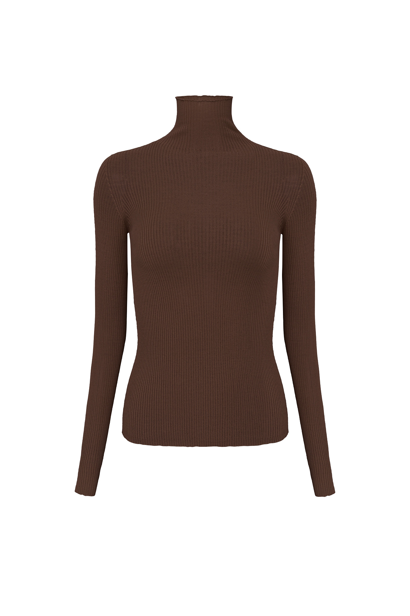 Бесшовная трикотажная водолазка из шерсти мериноса экстрафайн. Модель приталенного силуэта, с длинными рукавами и высоким воротником-стойкой.