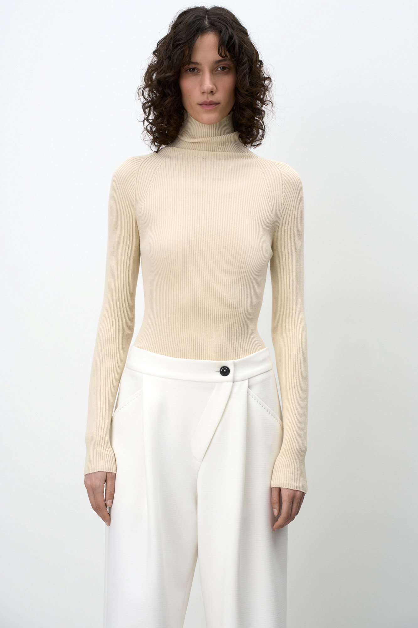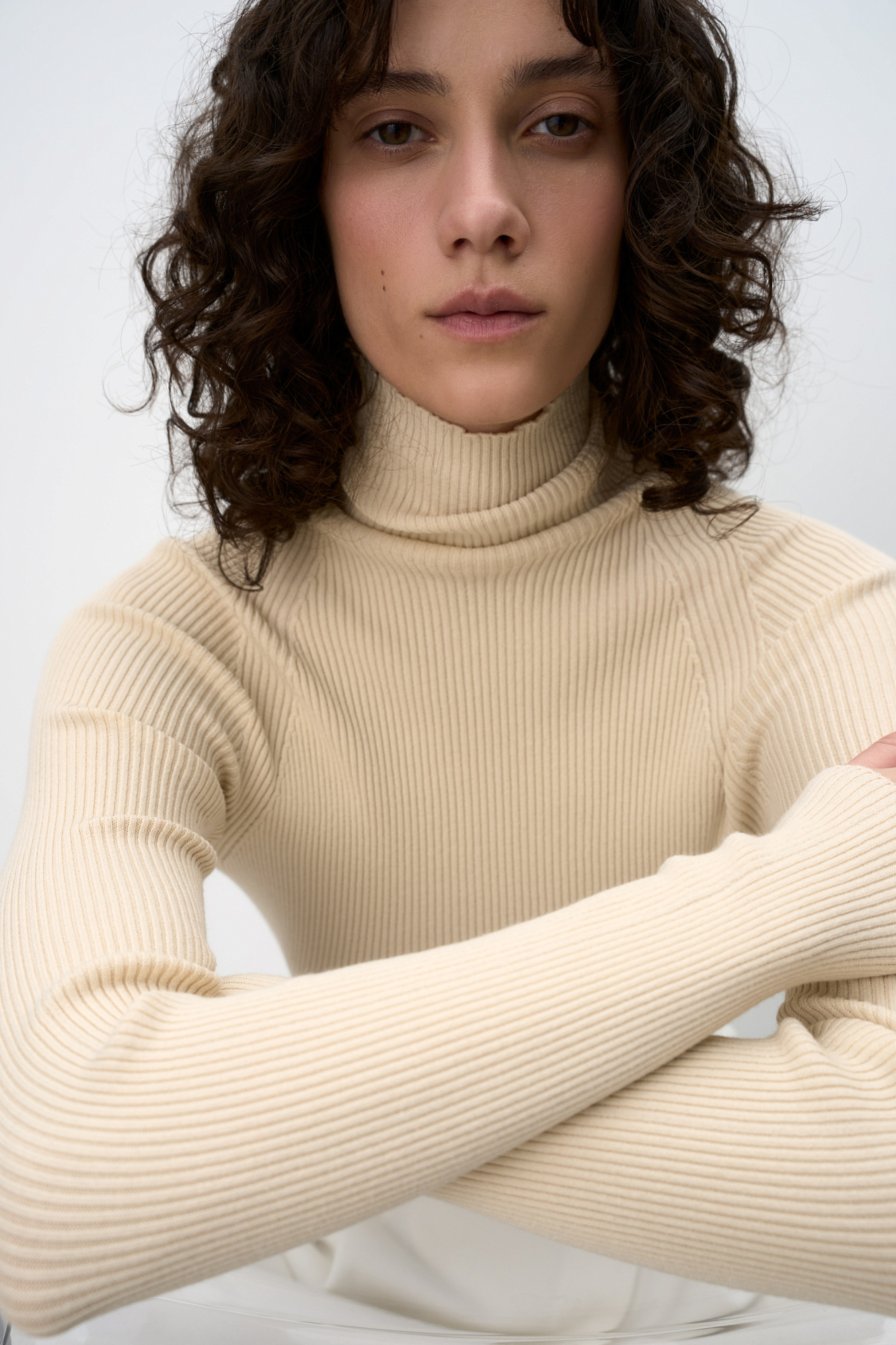 Трикотажная бесшовная водолазка из эластичной вискозы. Модель приталленого силуэта, с высоким воротником-стойкой и длинными рукавами. Изделие выполнено в рубчик.