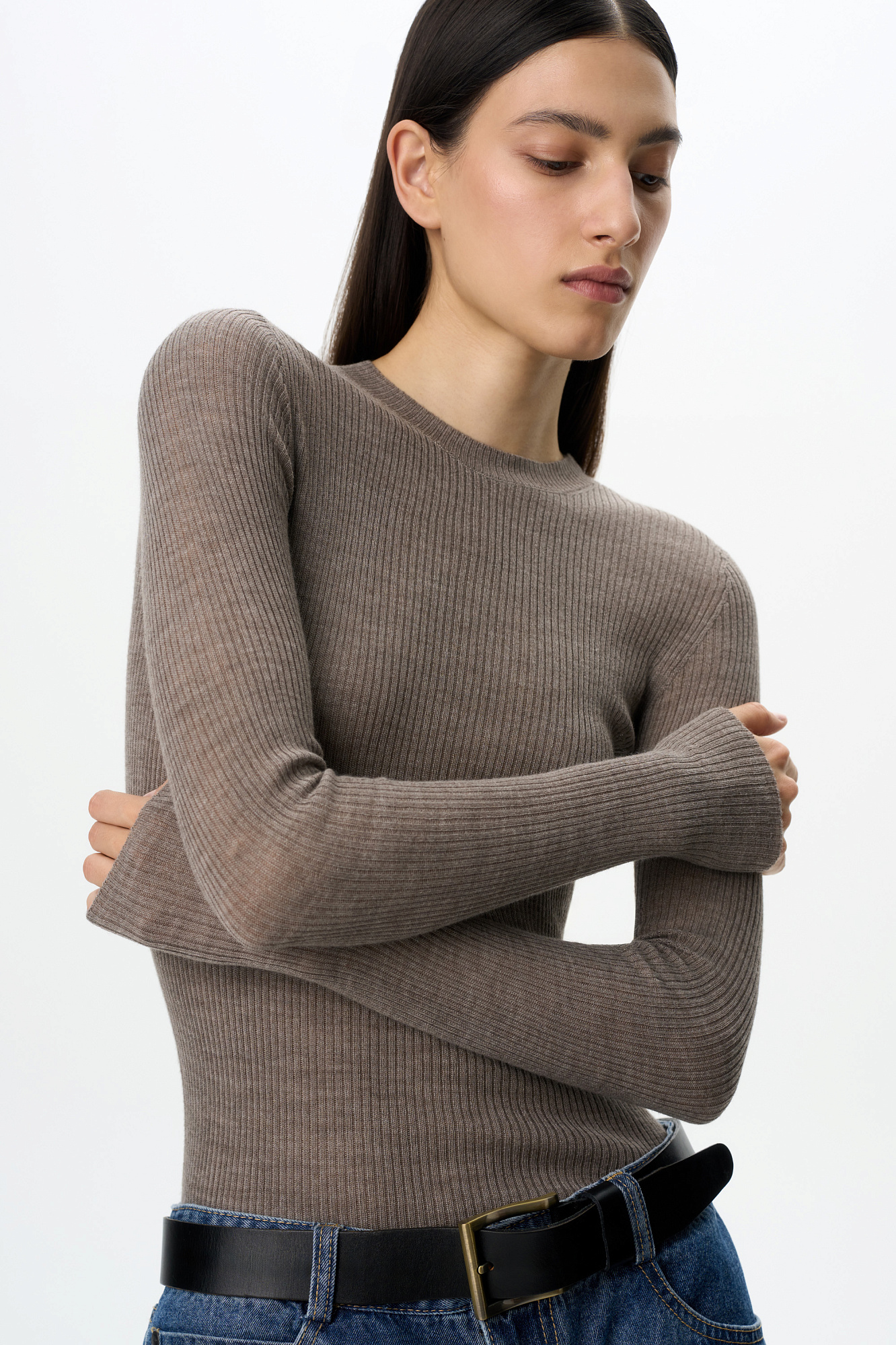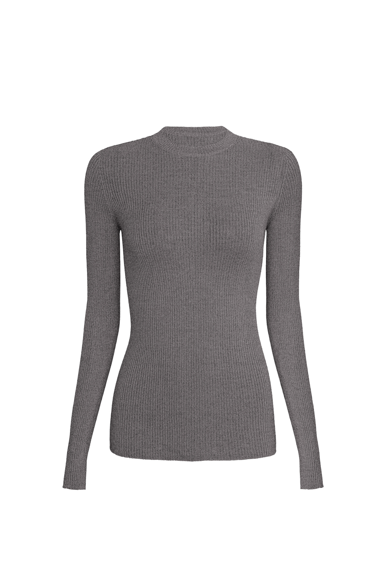 Цельновязанная полупрозрачная водолазка из шерсти. Модель с длинными рукавами и круглым вырезом. Изделие выполнено в рубчик.