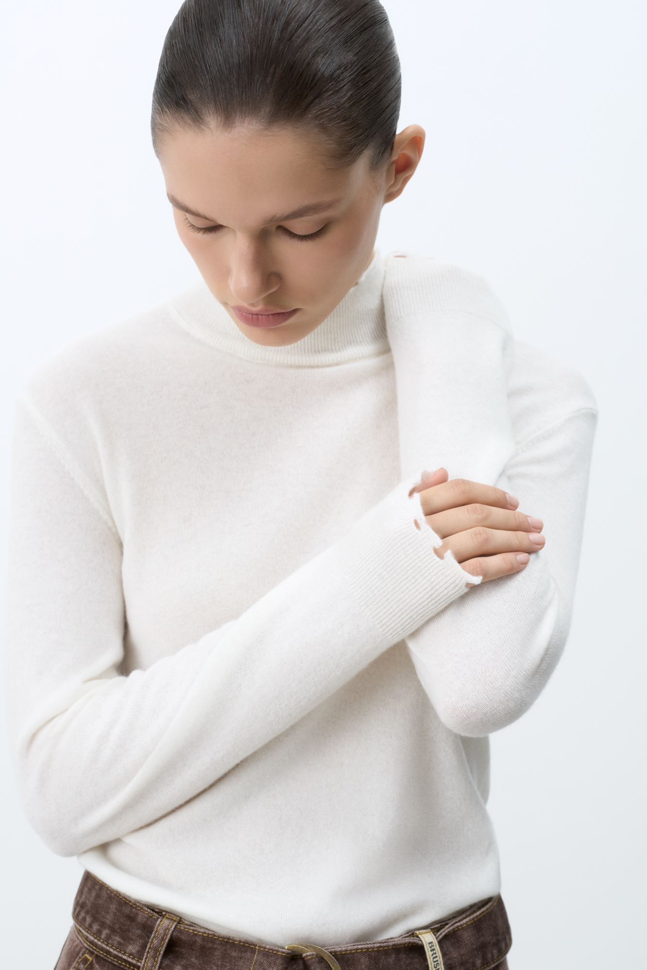 Трикотажная водолазка из шерсти с добавлением кашемира. Модель приталенного силуэта с длинным рукавом и воротником-стойкой. Манжеты рукавов, воротник и низ изделия с рваным краем.