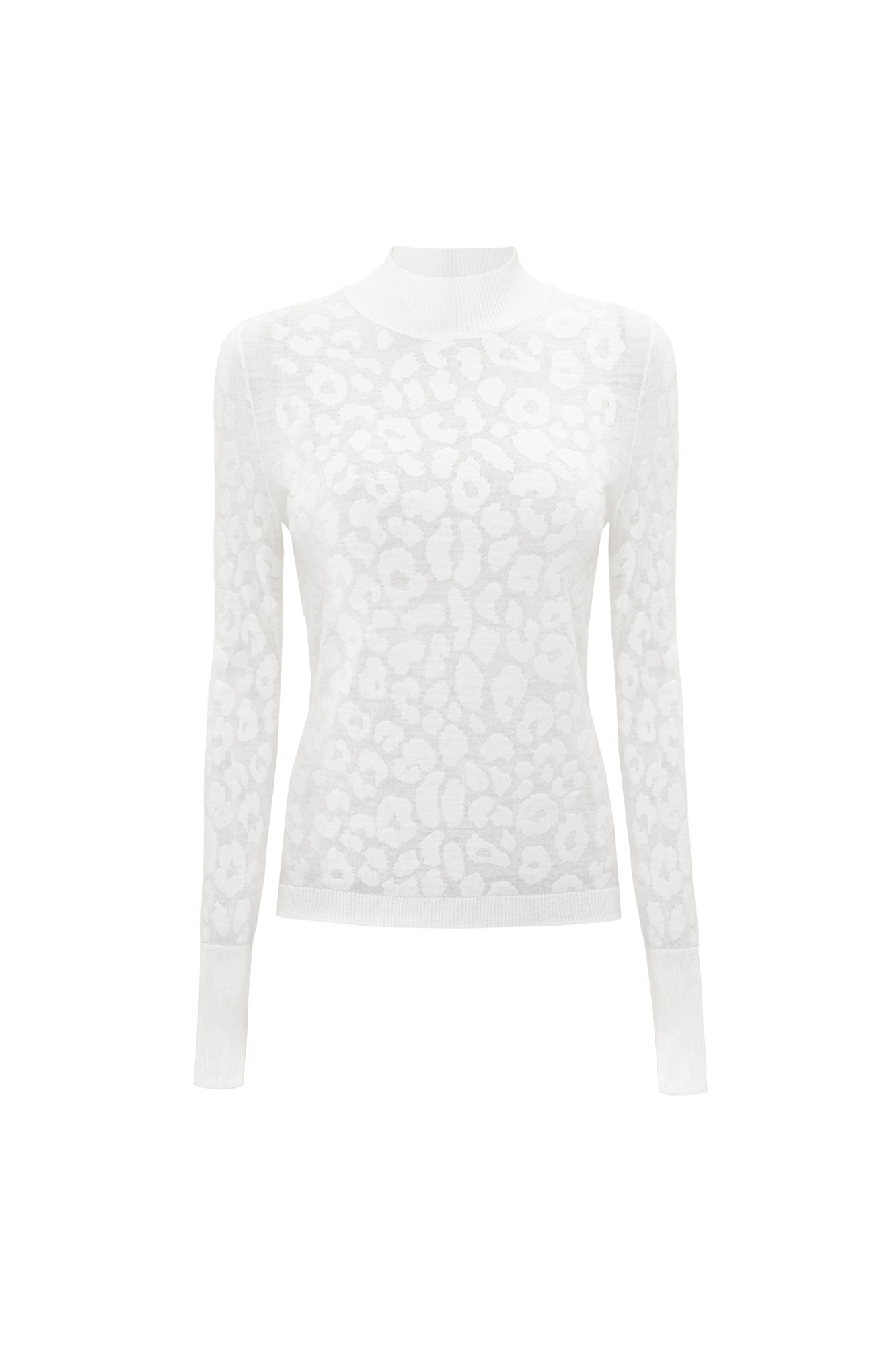 Трикотажная полупрозрачная водолазка из 100% шерсти мериноса экстрафайн с анималистичным принтом. Модель с длинным рукавом и вороником стойкой.