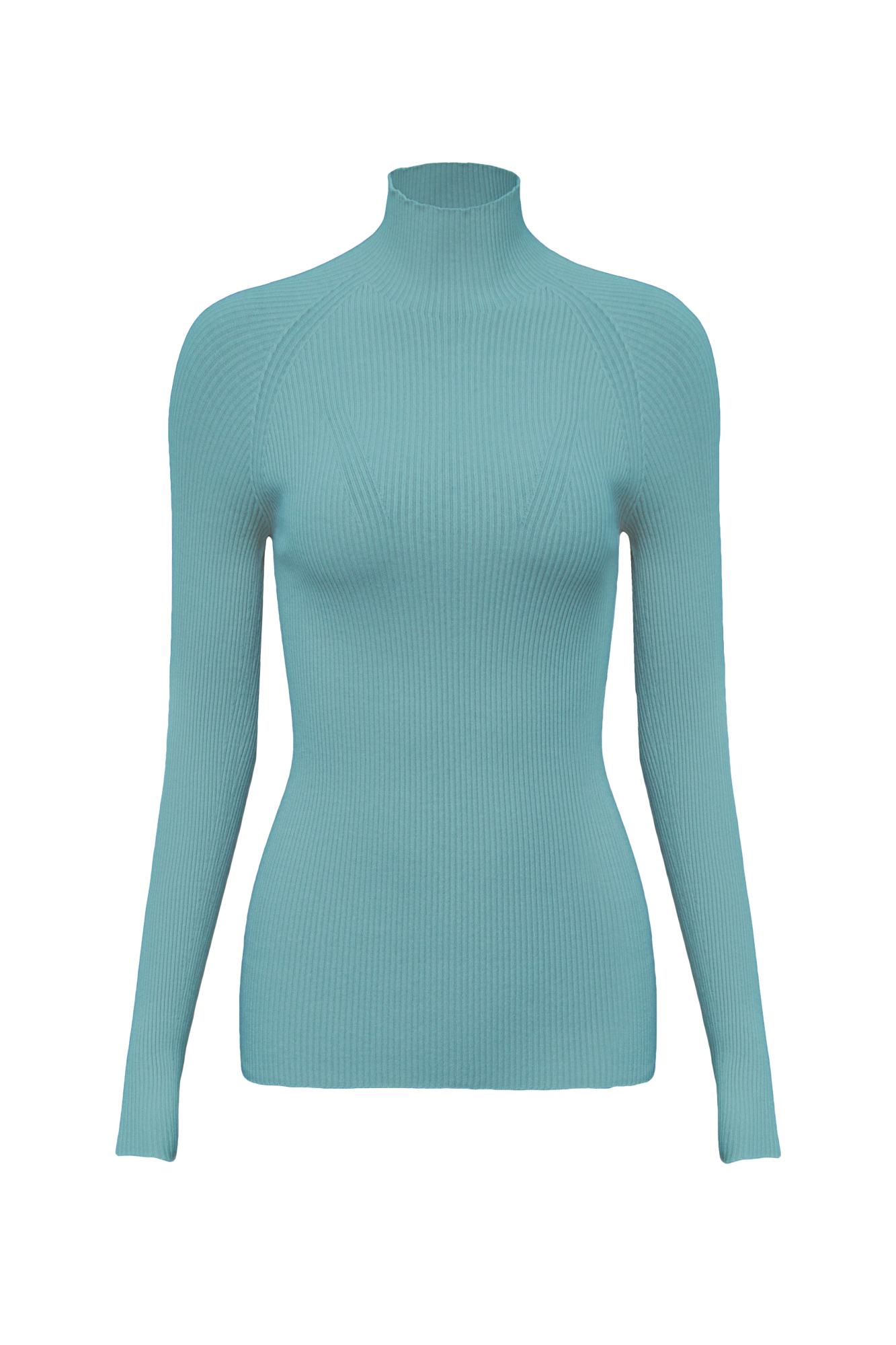 Приталенная, цельновязанная водолазка в рубчик с высоким воротником и рукавом реглан.